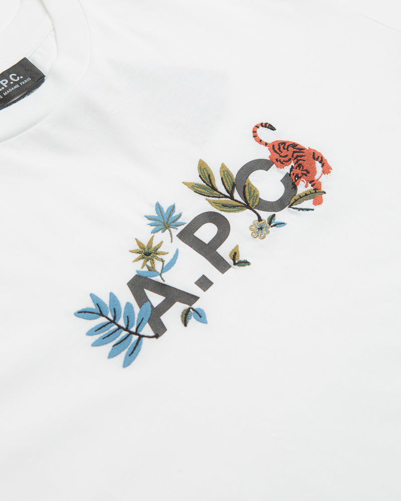 A.P.C. Auguste T-Shirt in White. Regular fitting and crafted from 100% organic cotton, this A.P.C. t-shirt is designed with a classic crew collar and a straight hem. Finished in white with a printed centre chest graphic.