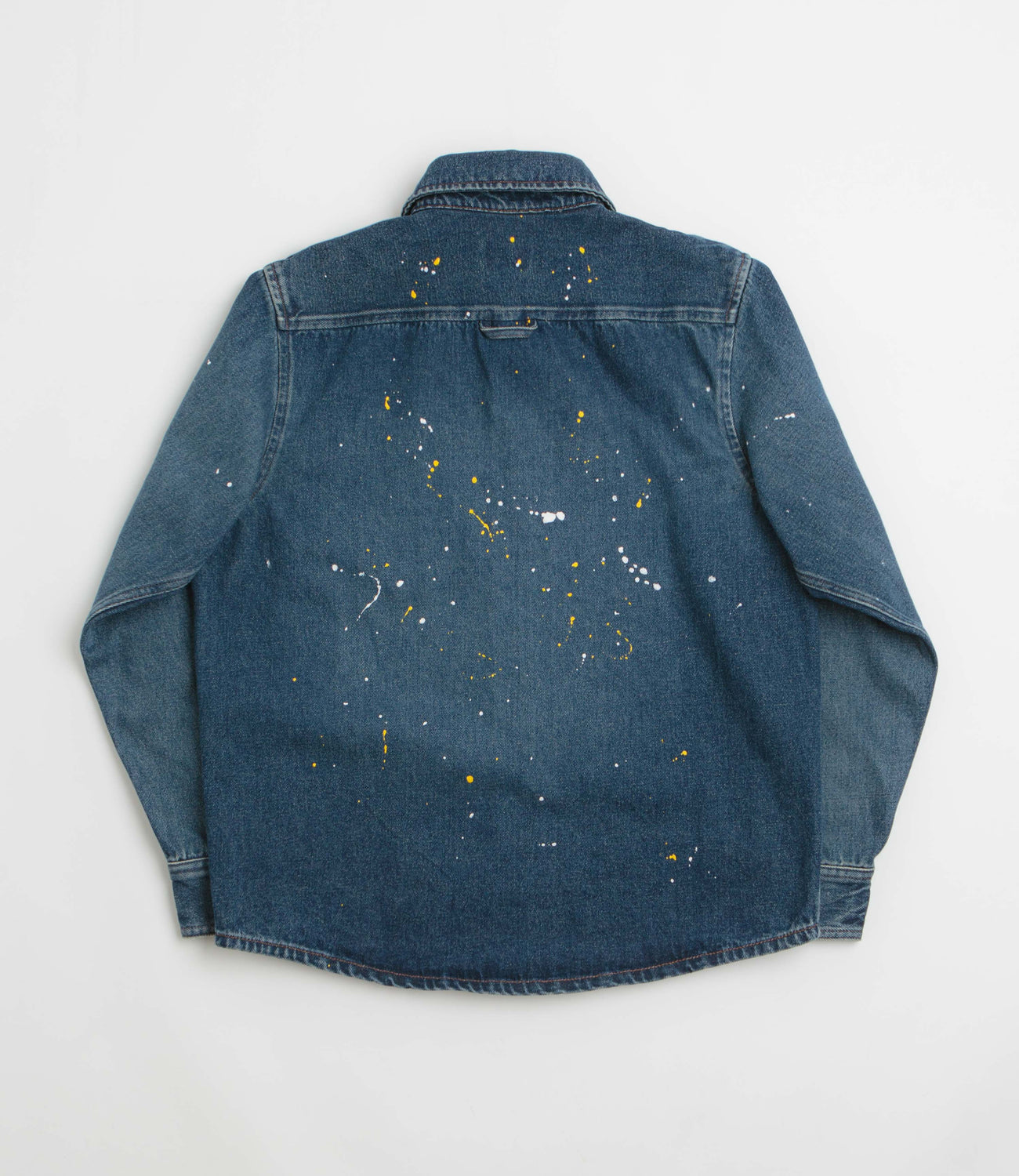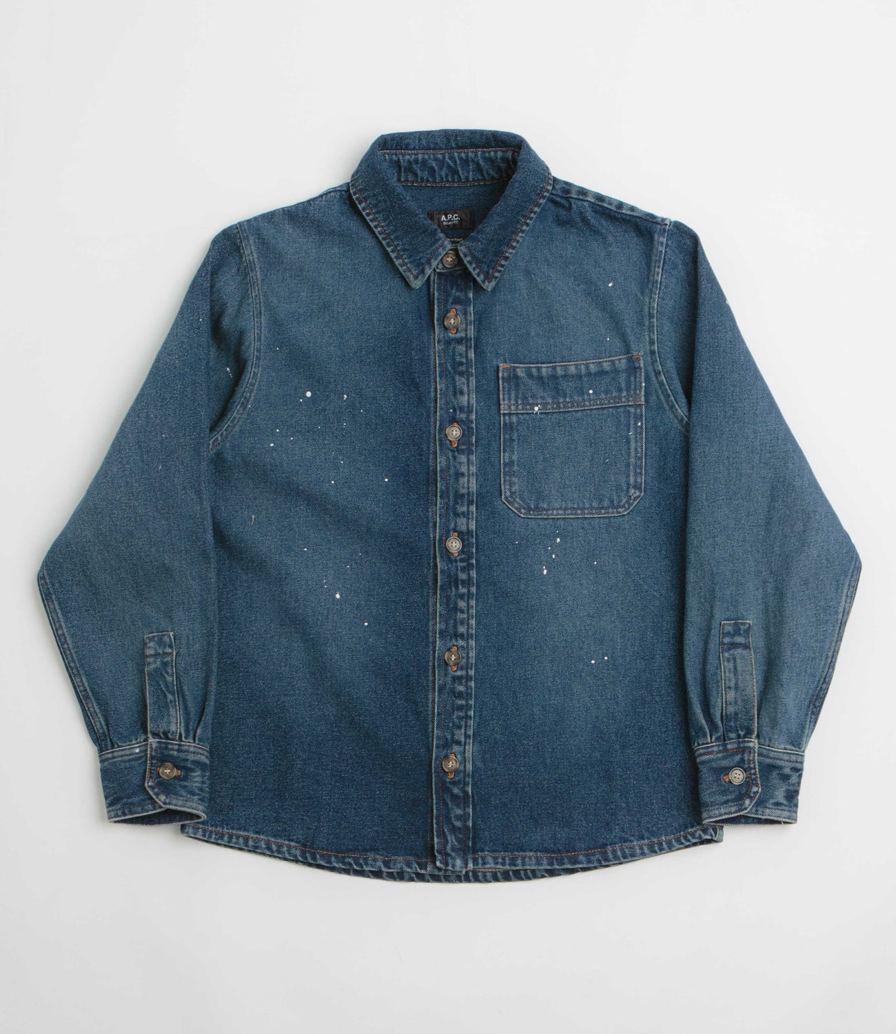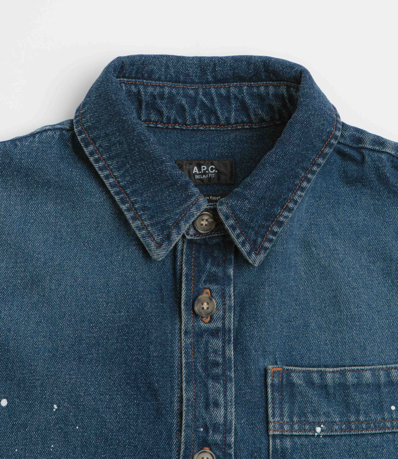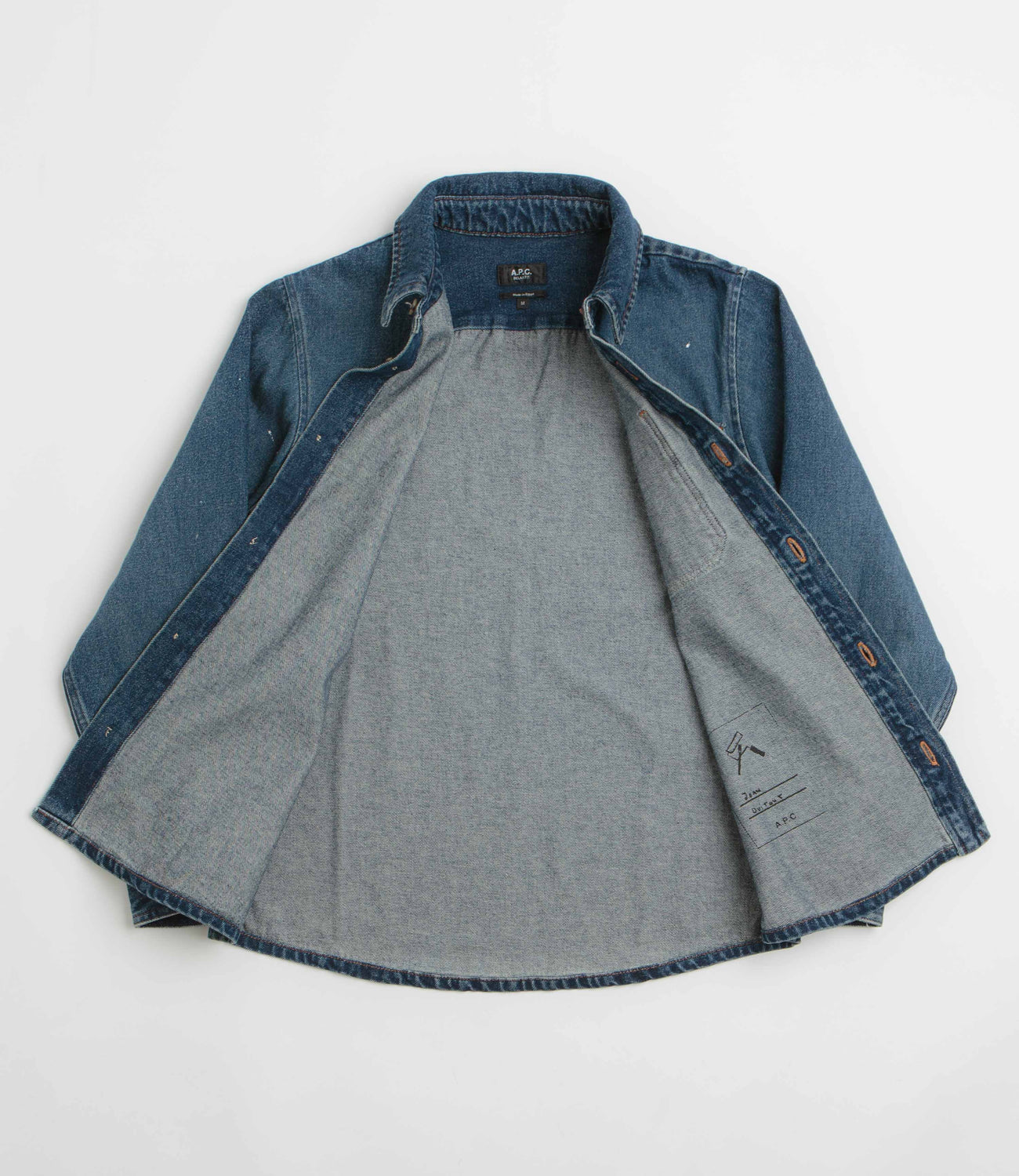 A.P.C. Basile Overshirt in Washed Indigo. Loose fitting and workwear inspired, this A.P.C. overshirt is crafted from 100% cotton. Featuring a classic stand collar and a full length button fastening, this navy A.P.C. overshirt is finished with a single chest pocket and adjustable cuffs.
