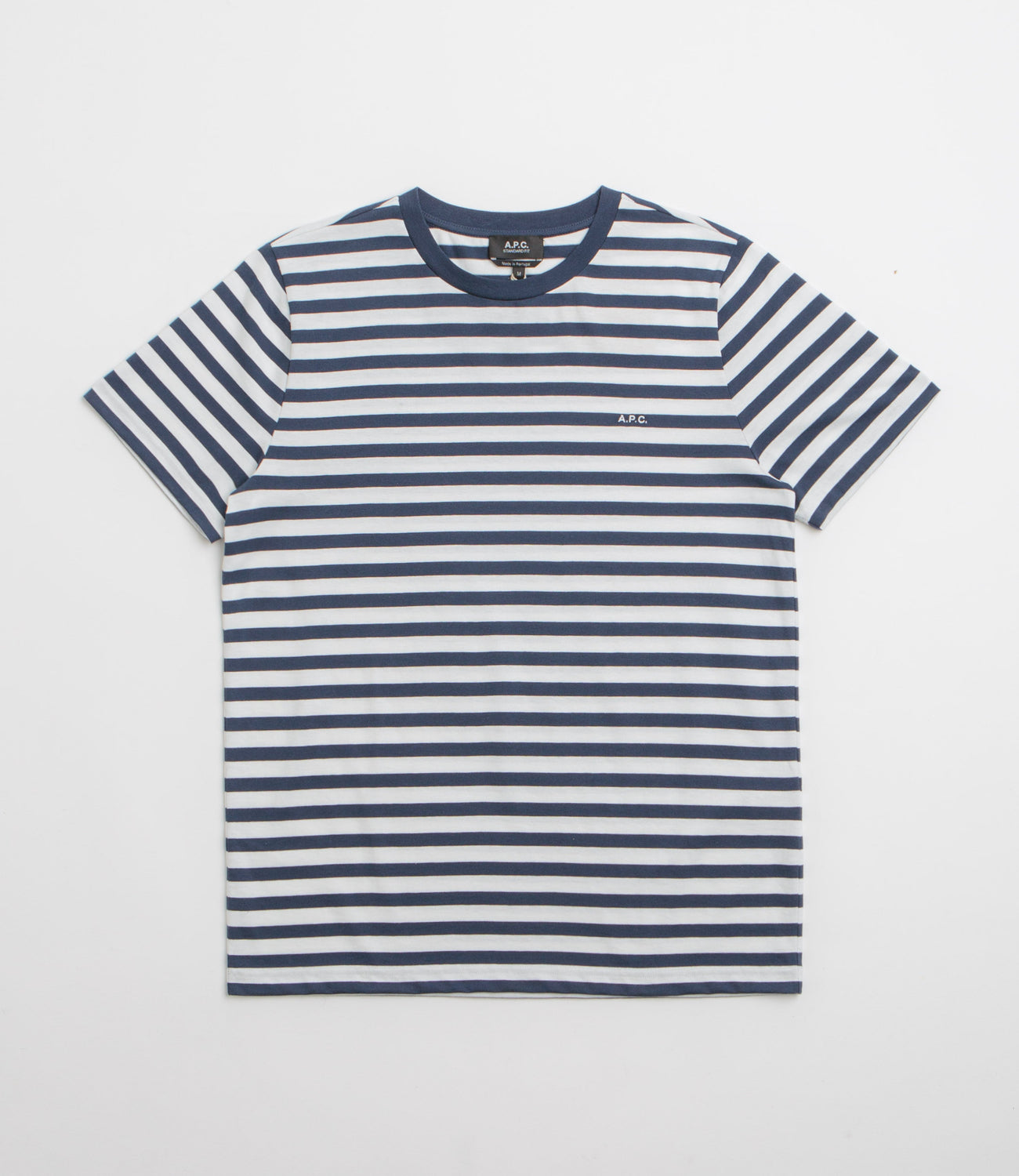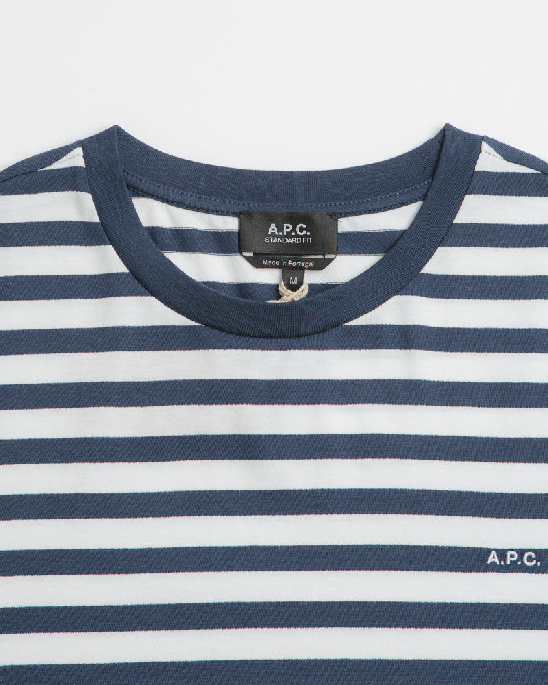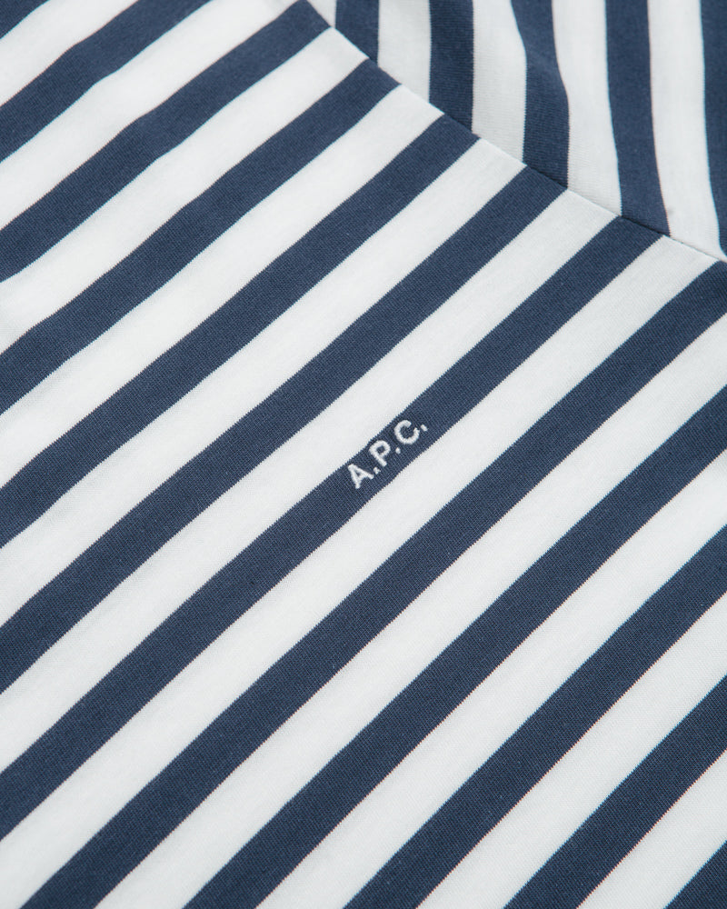 A.P.C. Embroidered Striped T-Shirt in Dark Navy. Detailed with an all-over Breton stripe, this regular fitting A.P.C. t-shirt is crafted from 100% organic cotton. Finished in navy with a rib knit crew collar and embroidered logo branding.
