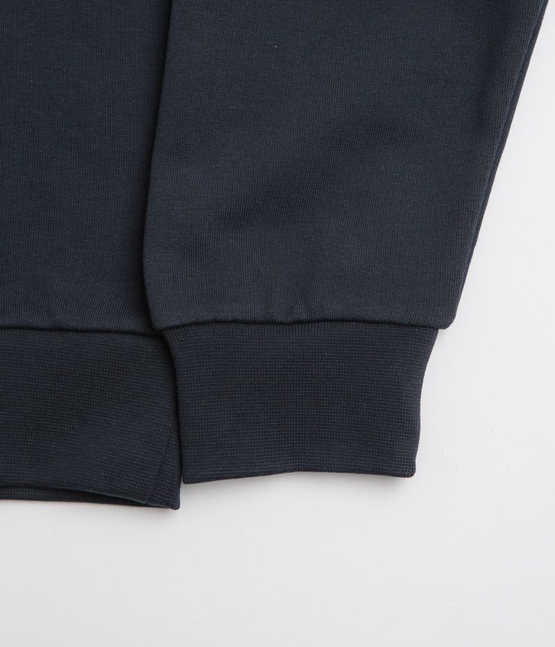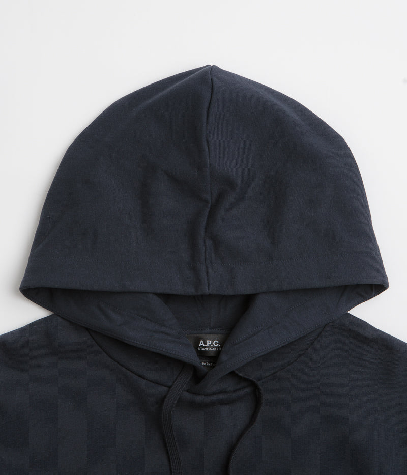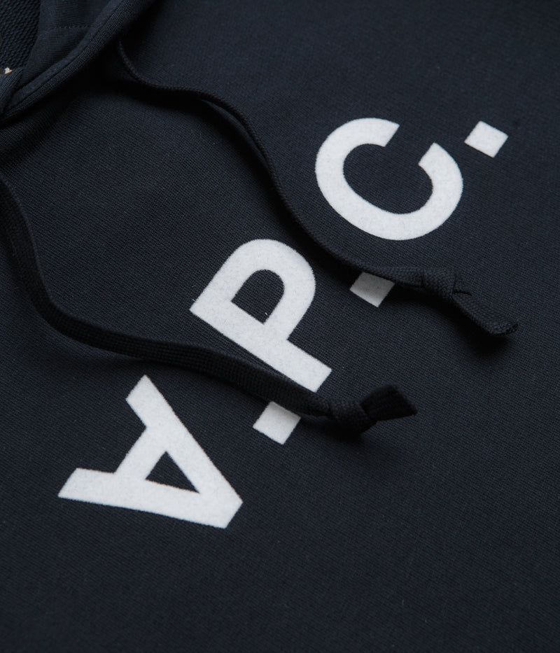 A.P.C. Grand VPC Hoodie in Dark Navy and Ecru. Loose fitting, this A.P.C. hoodie is crafted from 100% cotton with an adjustable drawstring hood. Finished in navy with a kangaroo front pocket, ribbed cuffs and a printed V.P.C centre chest graphic.