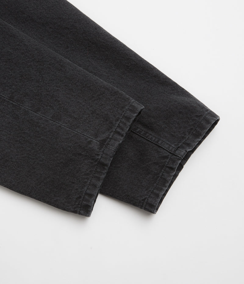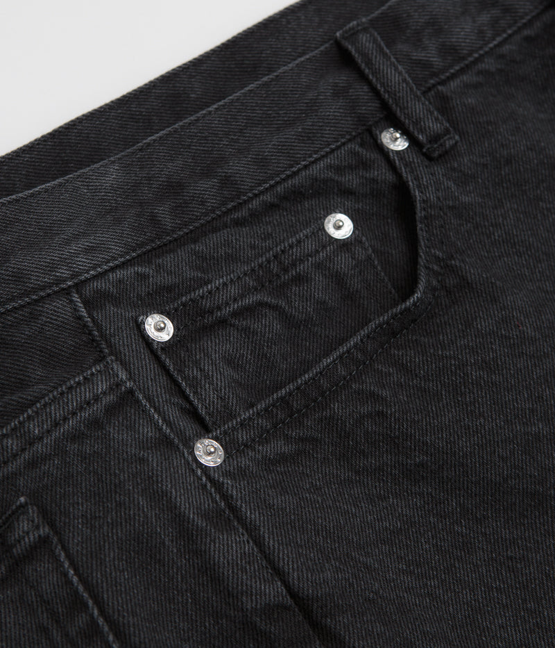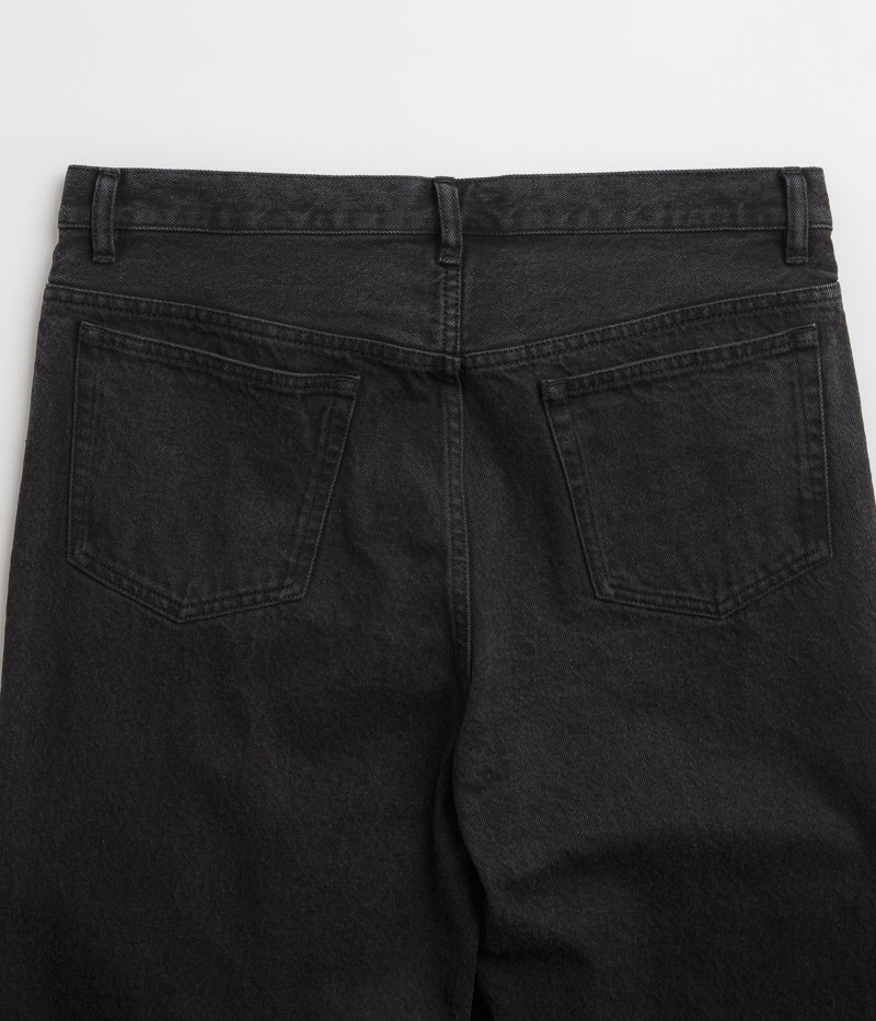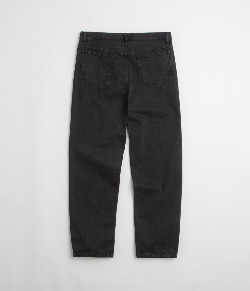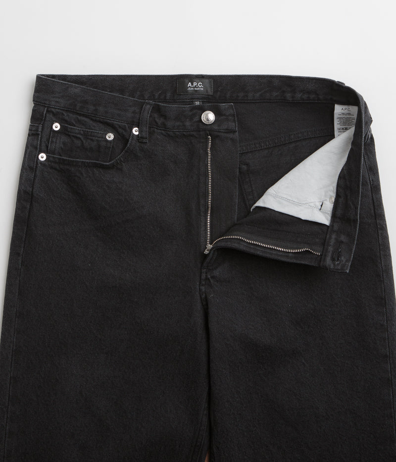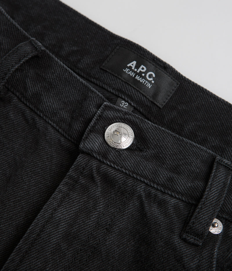 A.P.C. Martin Jeans in Washed Black. Cut with a straight leg and a high-rise, these A.P.C. jeans are crafted from a cotton denim blend. Featuring a stonewashed construction, a belt loop waist and a zippered fly, these black A.P.C. jeans are finished with two side pockets, a single coin pocket, two rear pockets and metal rivet details.