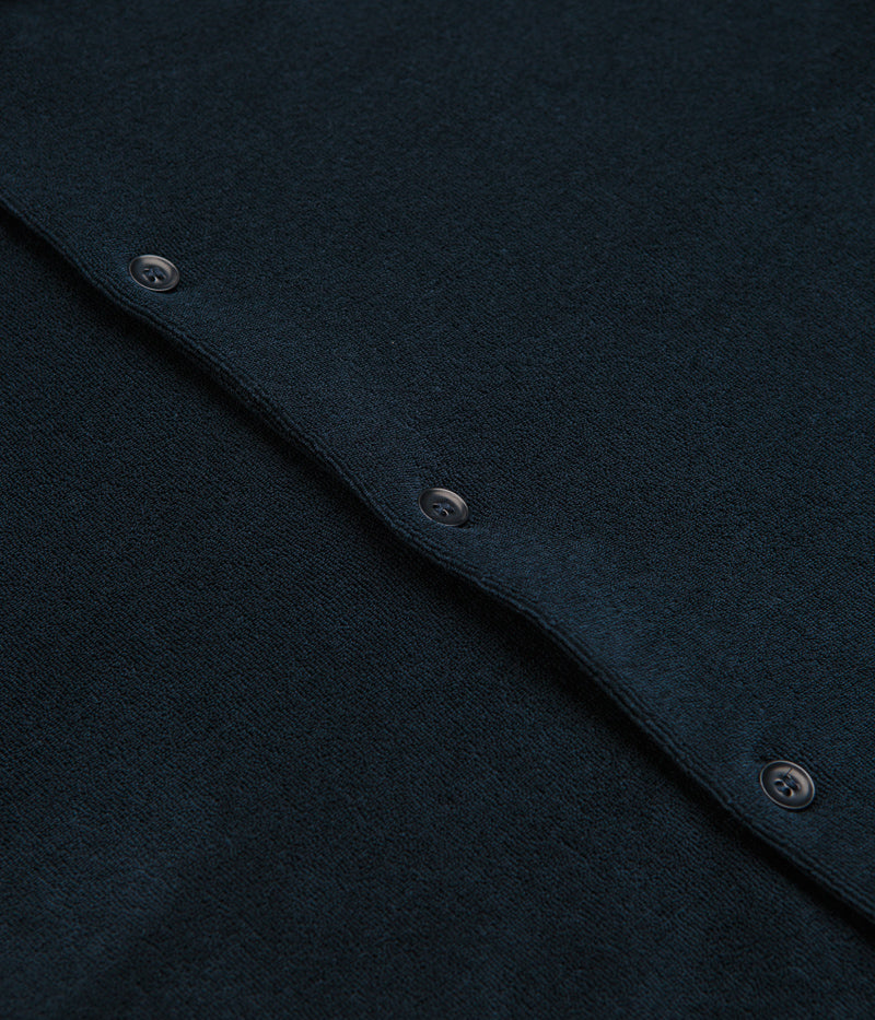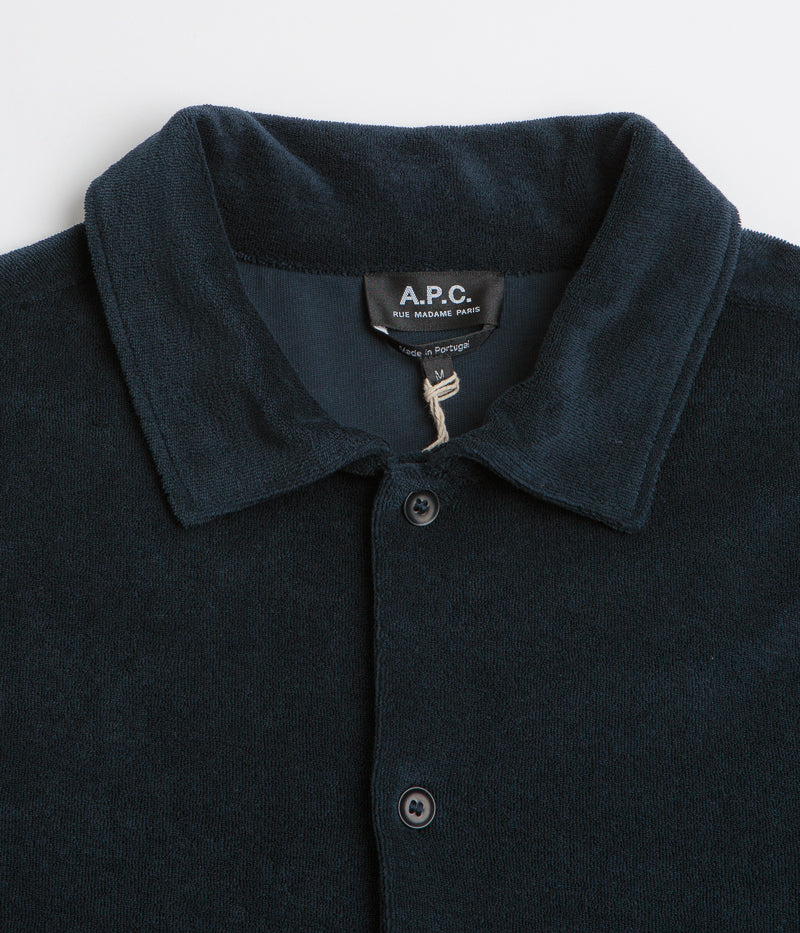 A.P.C. Nicolo Short Sleeve Shirt in Dark Navy. Relaxed fitting and crafted from 100% cotton French terry, this A.P.C. shirt is designed with a classic stand collar. Finished in navy with tonal stitched seams and a full length button fastening.