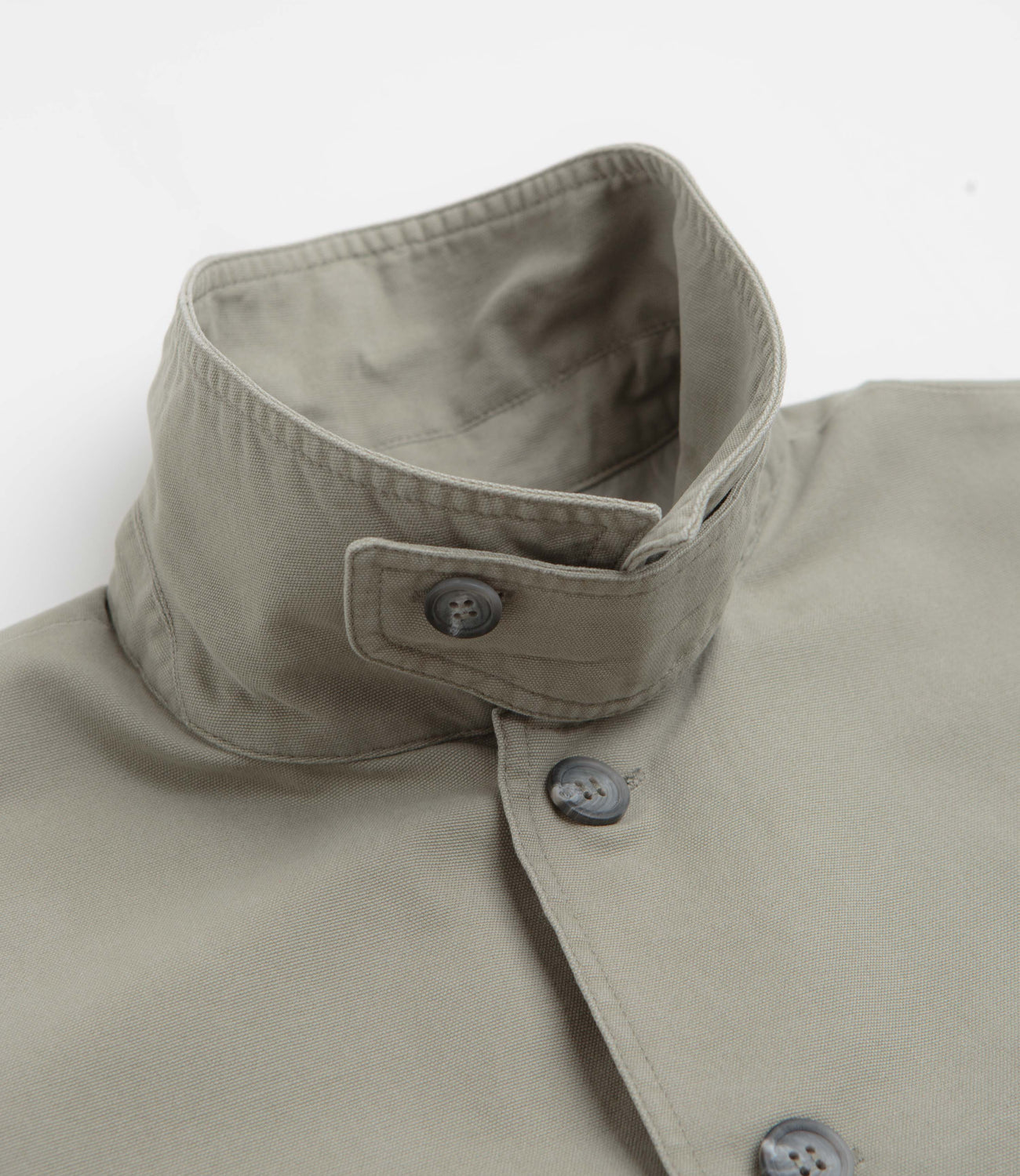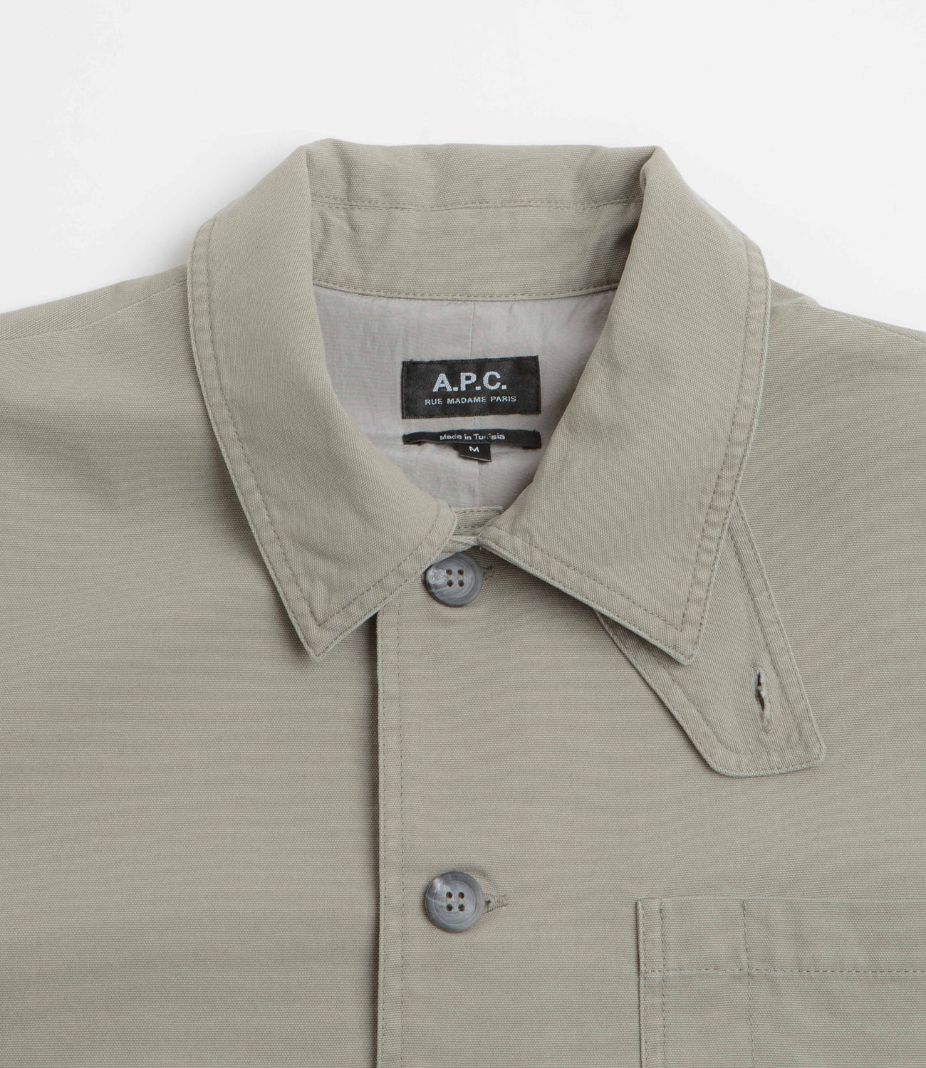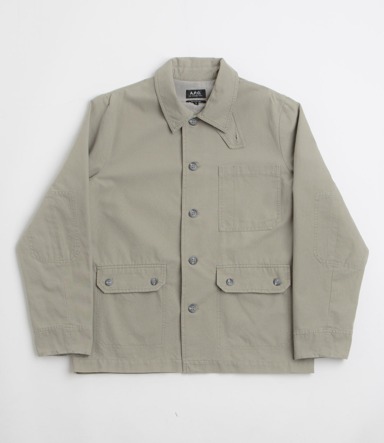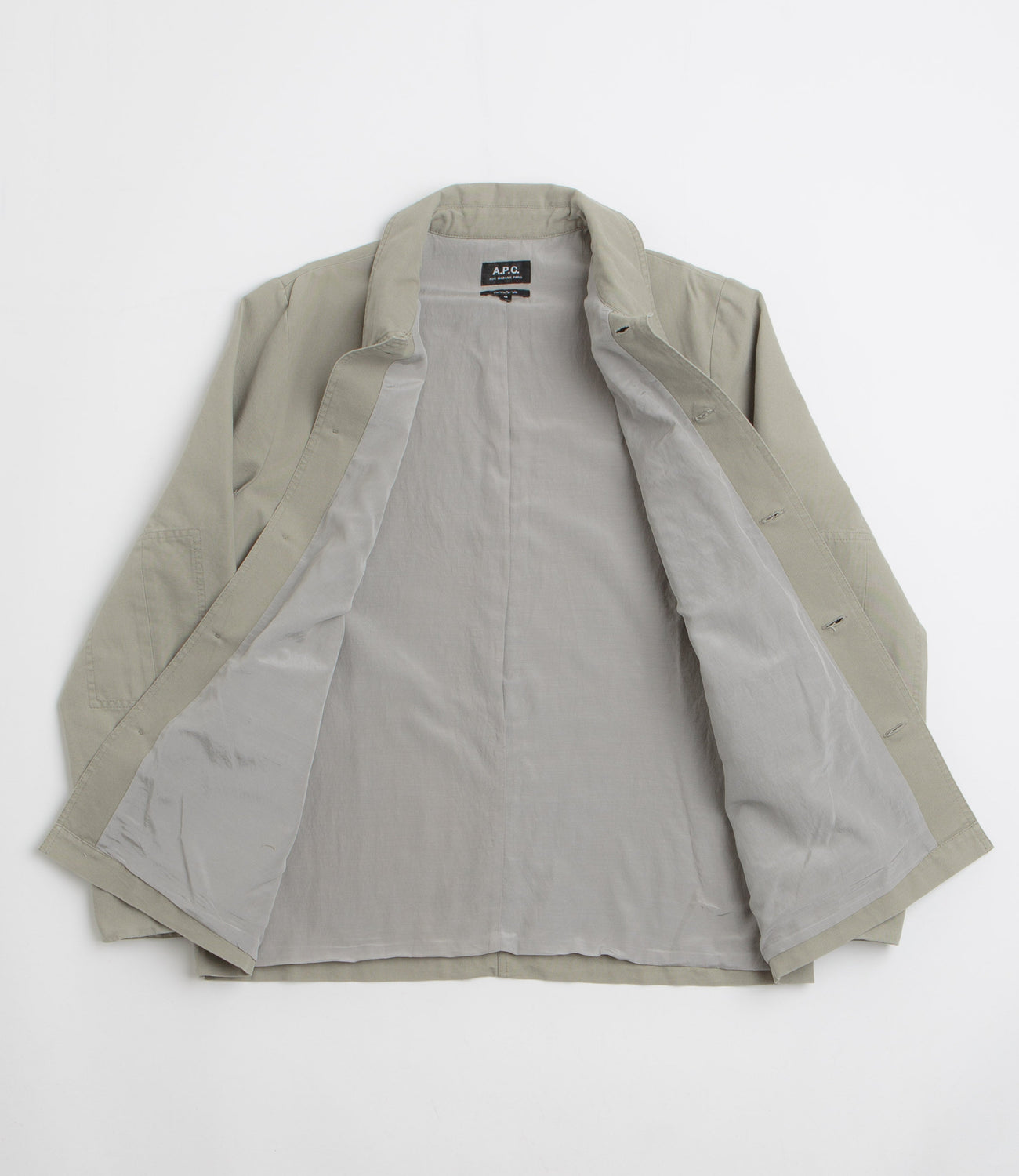 A.P.C. Piet Jacket in Verdigris. Regular fitting and inspired by heritage styles, this A.P.C. jacket is crafted from 100% cotton canvas. Featuring a flap secured stand collar, a full length button fastening and a single chest pocket, this khaki beige A.P.C. jacket is finished with two front pockets, fixed cuffs and a straight hem.