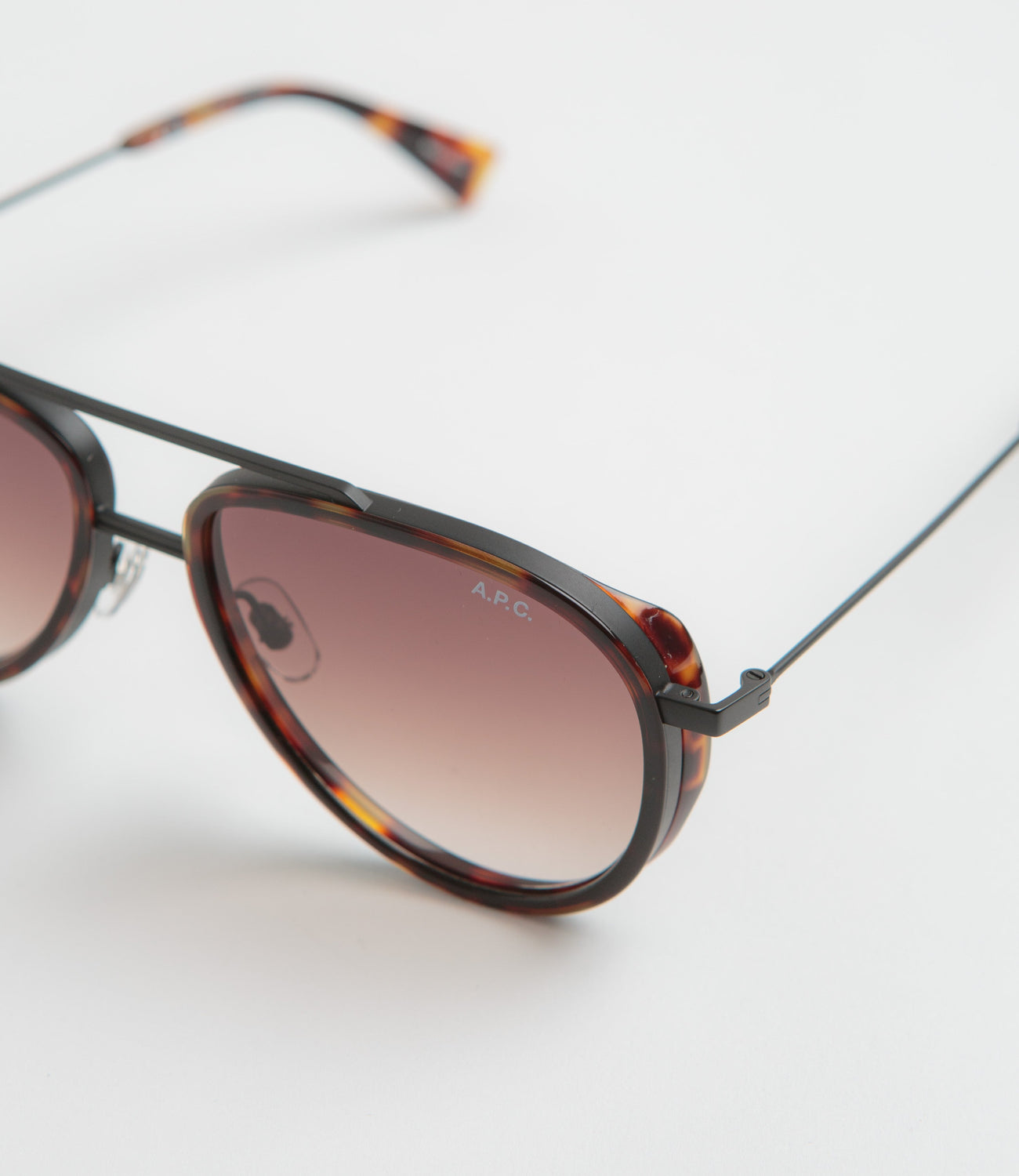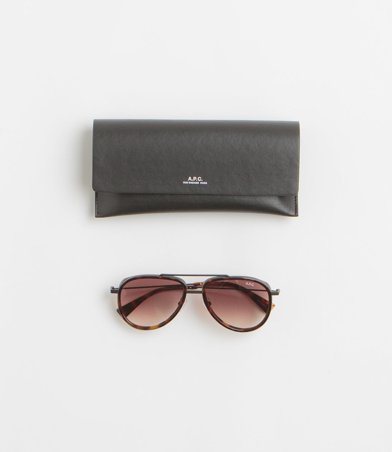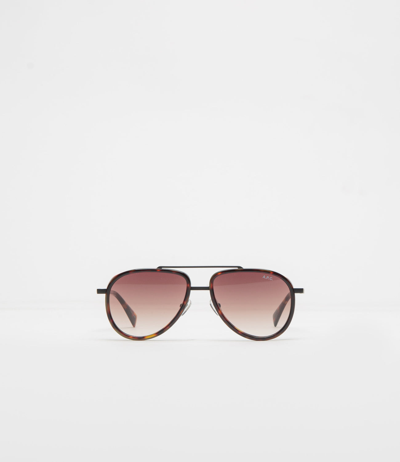 A.P.C. Sterling Sunglasses in Brown. Prescription lens compatible, these A.P.C. sunglasses are pilot-shaped and crafted from acetate with metal frames. Featuring smokey gradient lenses, UVA and UVB protection and engraved logos.