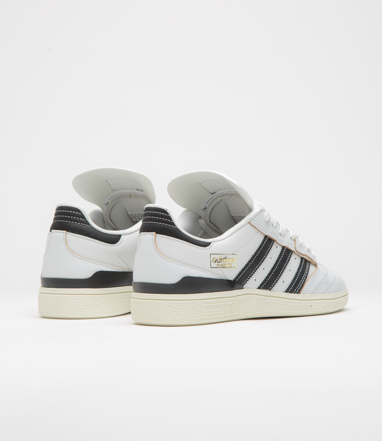 Adidas Busenitz Shoes in Crystal White, Core Black and Off White. A Dennis Busenitz pro model, this adidas Busenitz is designed with a leather upper and an abrasion-resistant Adituff toe. Featuring contrasting 3-Stripes, a customisable tongue and a GEOFIT cushioned heel, this white black adidas Busenitz is finished with gold foil branding, a moulded sockliner and a white rubber outsole.