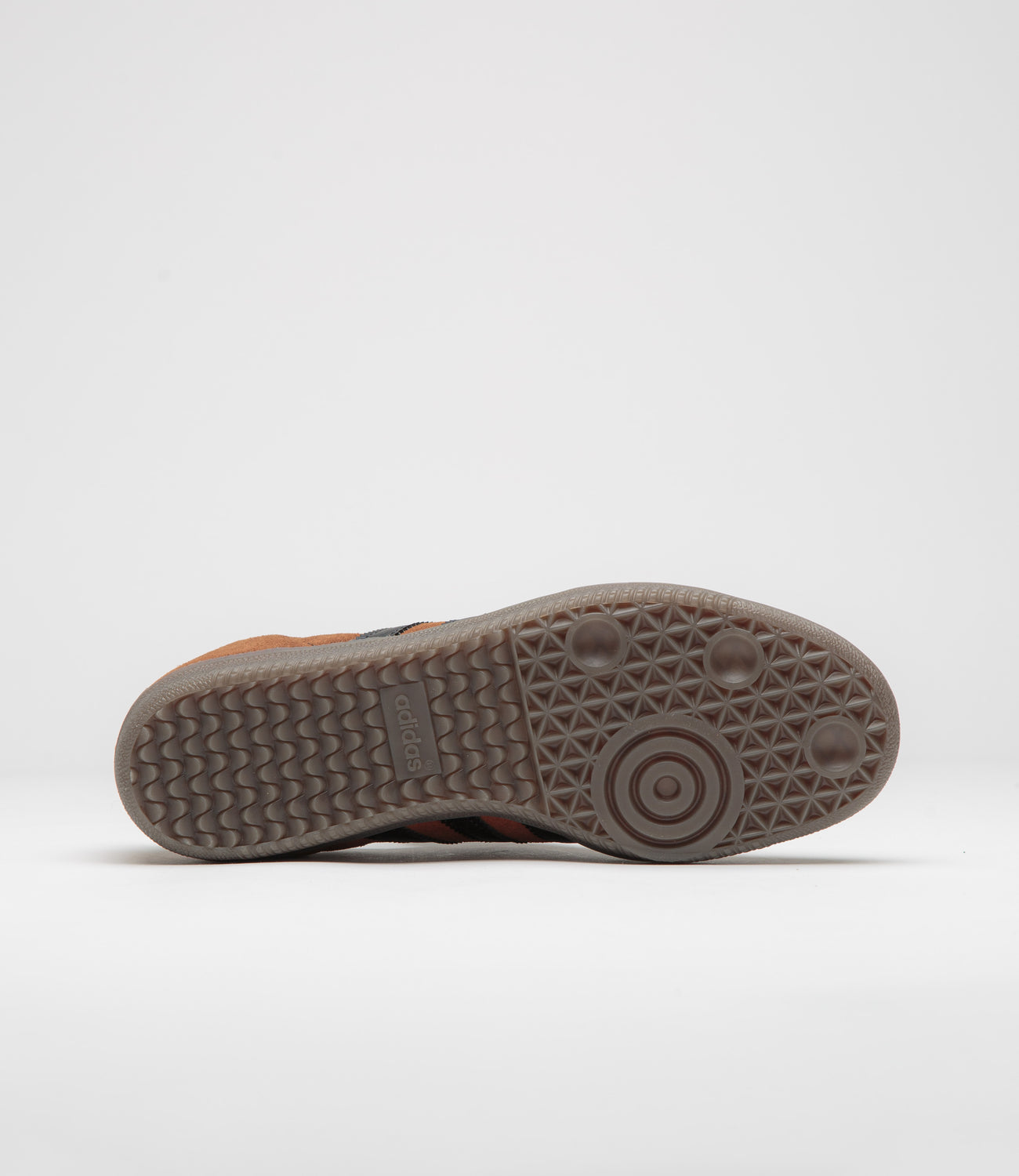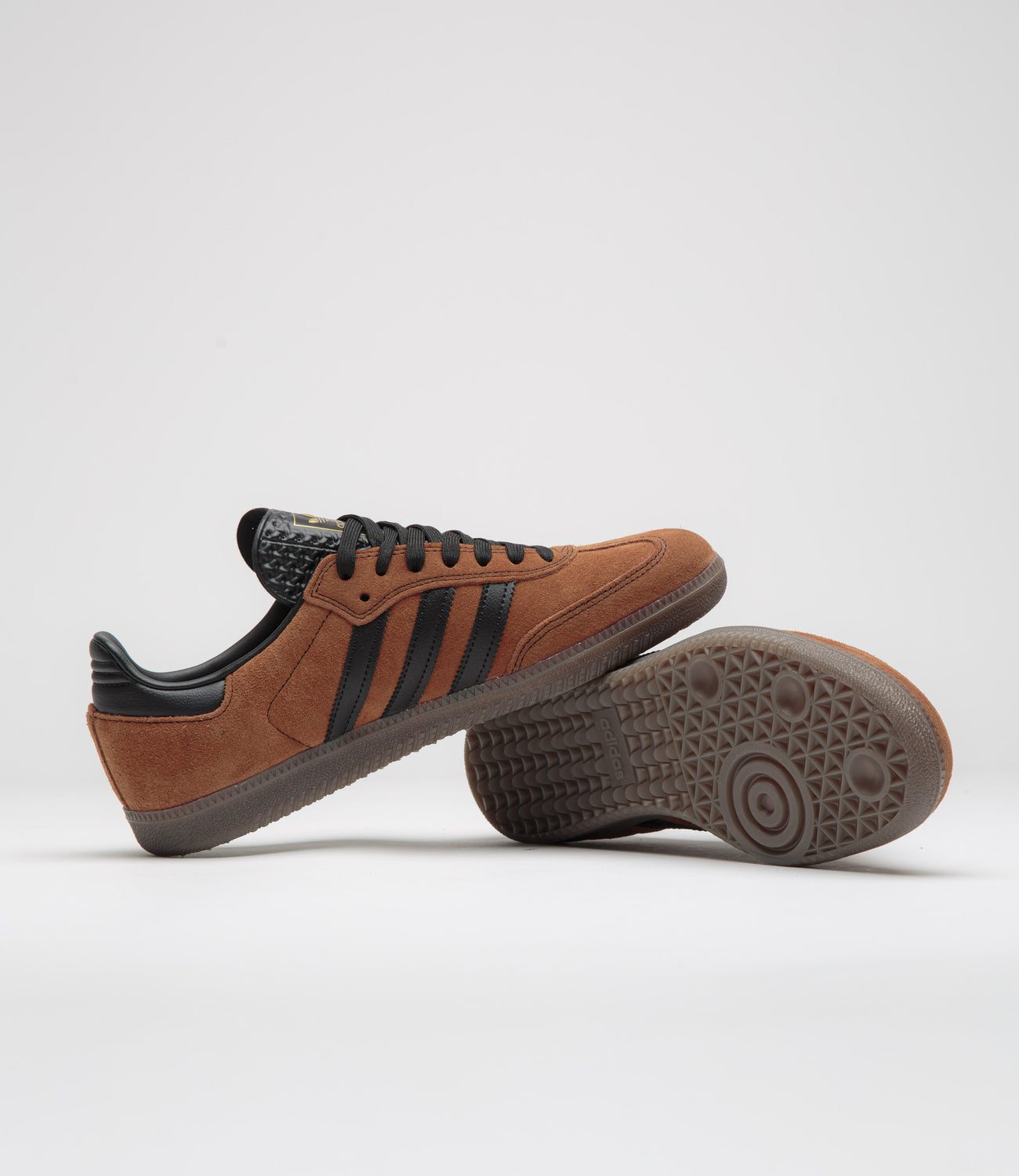 - Leather 3-Stripes, gold foil Samba branding, textured Trefoil tongue