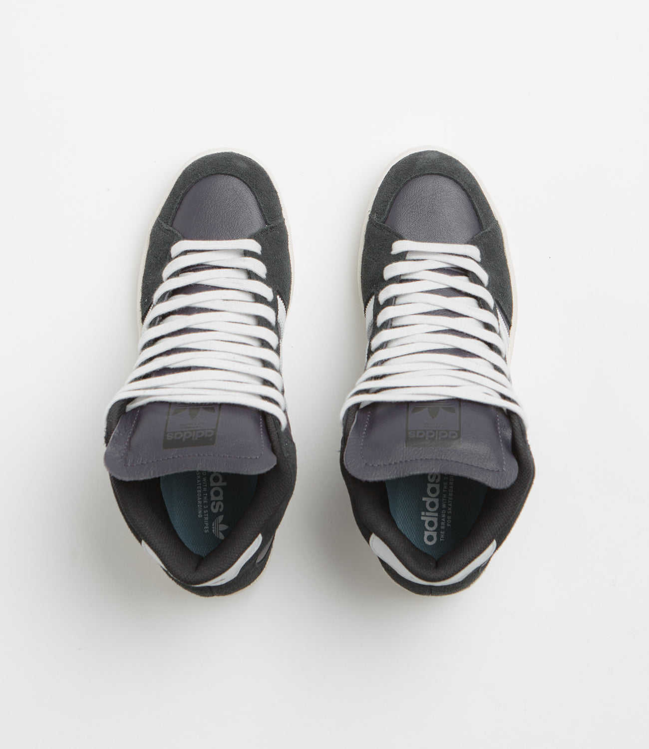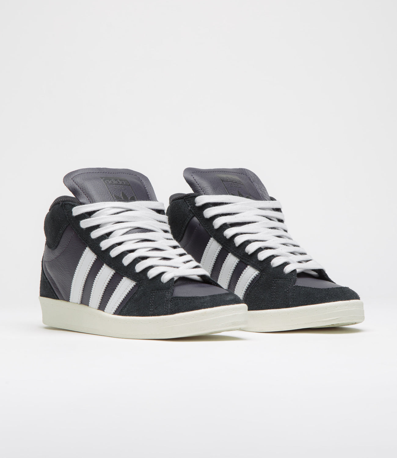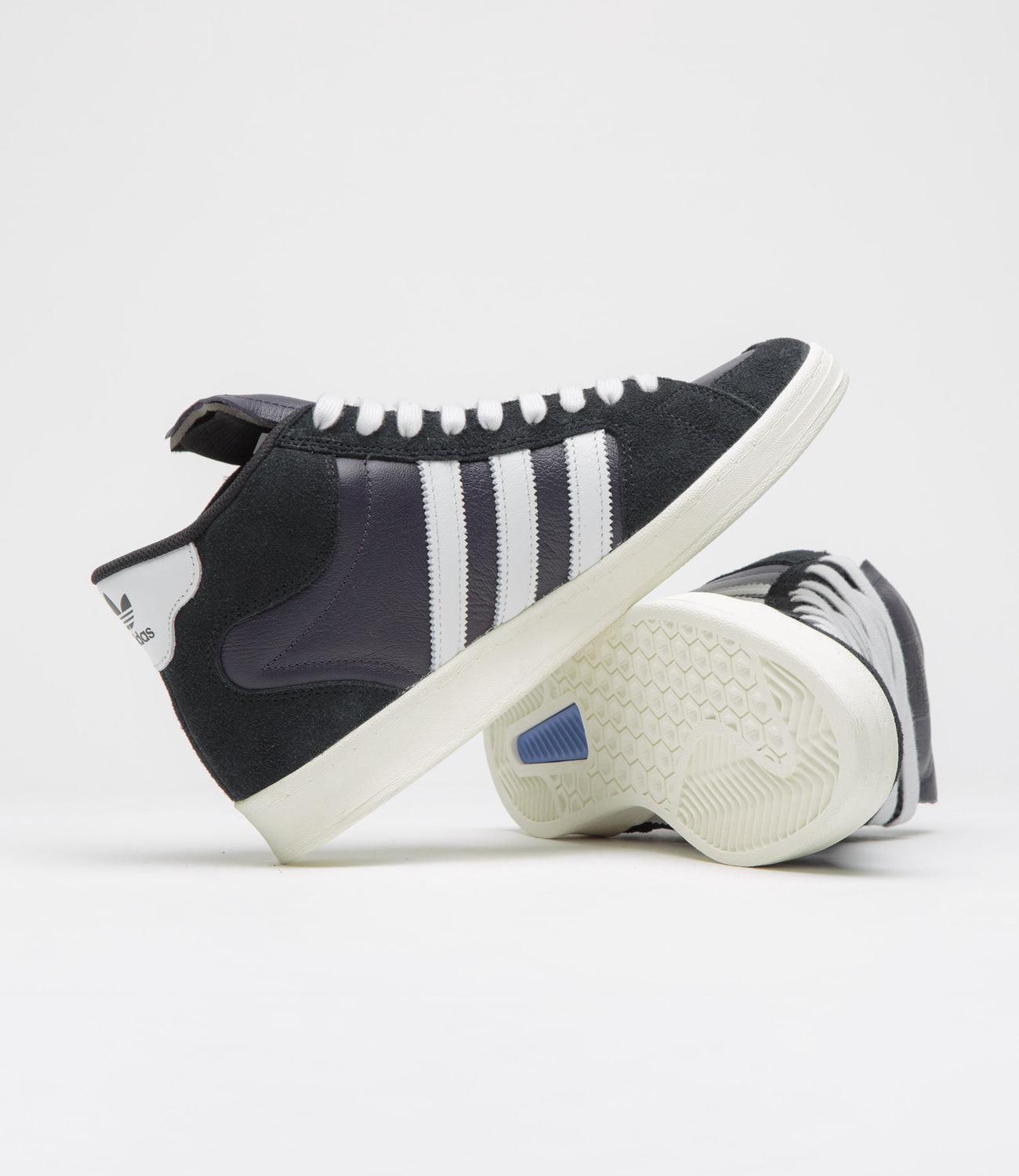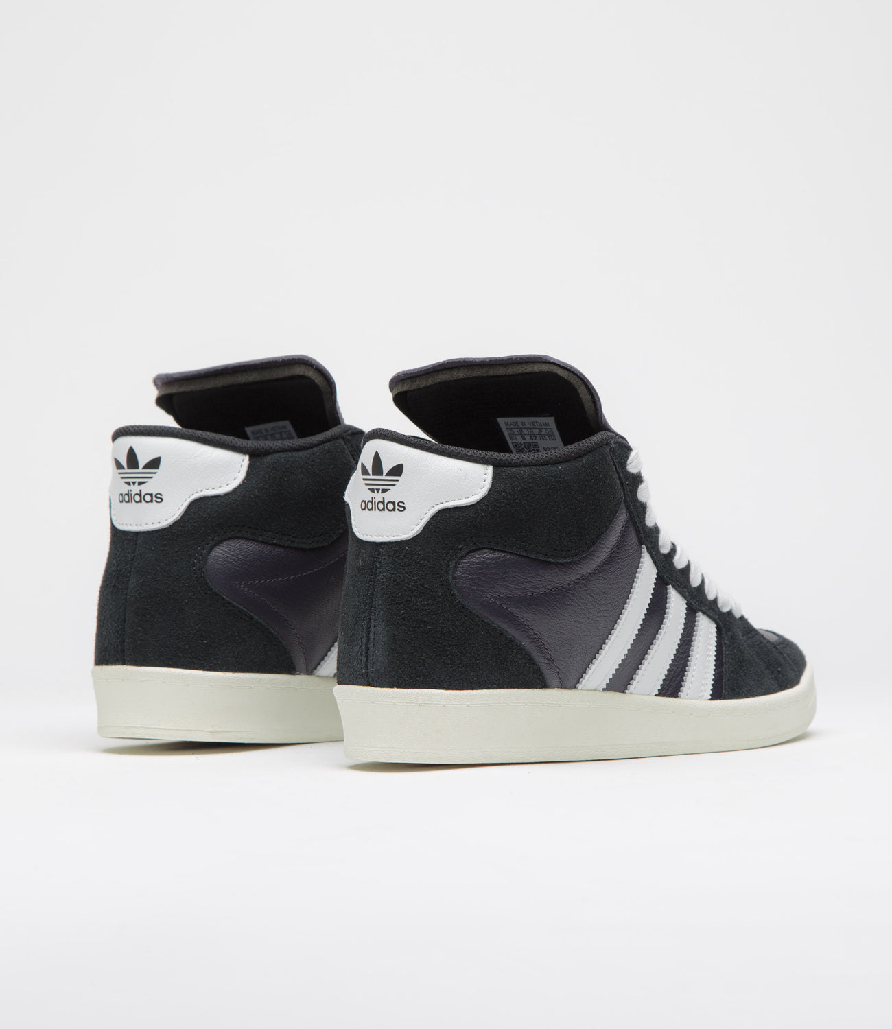 Adidas Superskate Shoes in Core Black, Crystal White and Off White. Inspired by the original silhouette, this adidas Superskate is crafted with suede and leather uppers. Featuring a leather tongue, printed Trefoil branding and contrasting 3-Stripe detailing, this black purple adidas Superskate also features a classic cupsole construction. Finished with a herringbone tread, printed insoles and a white rubber outsole.