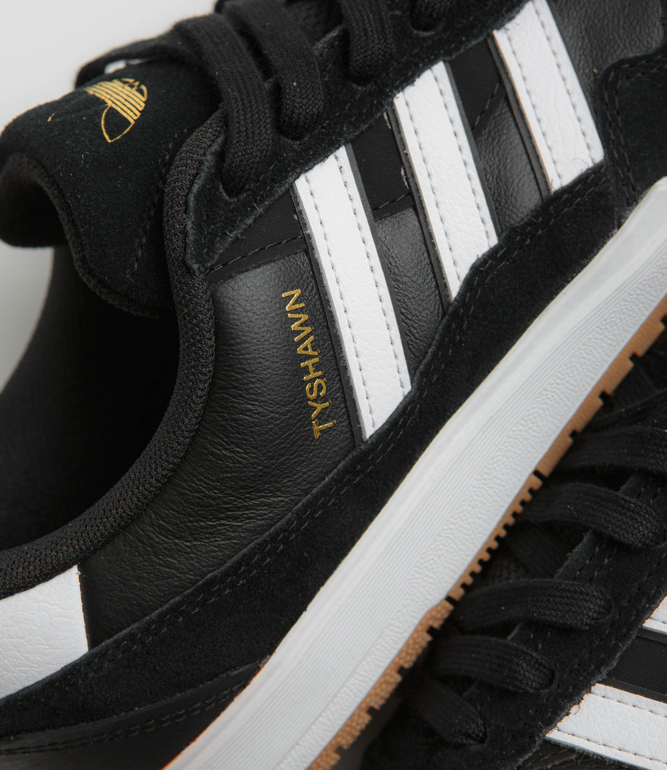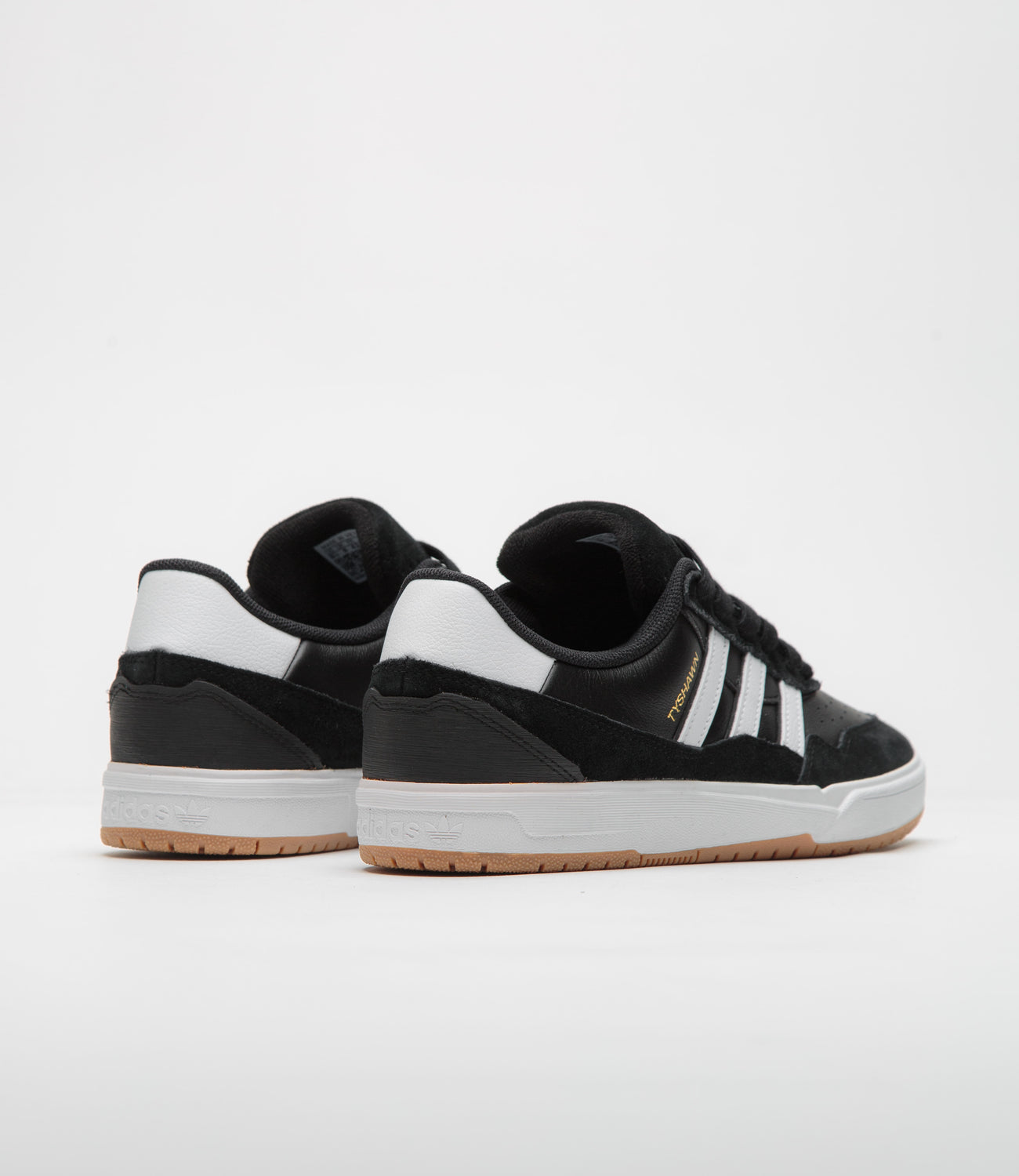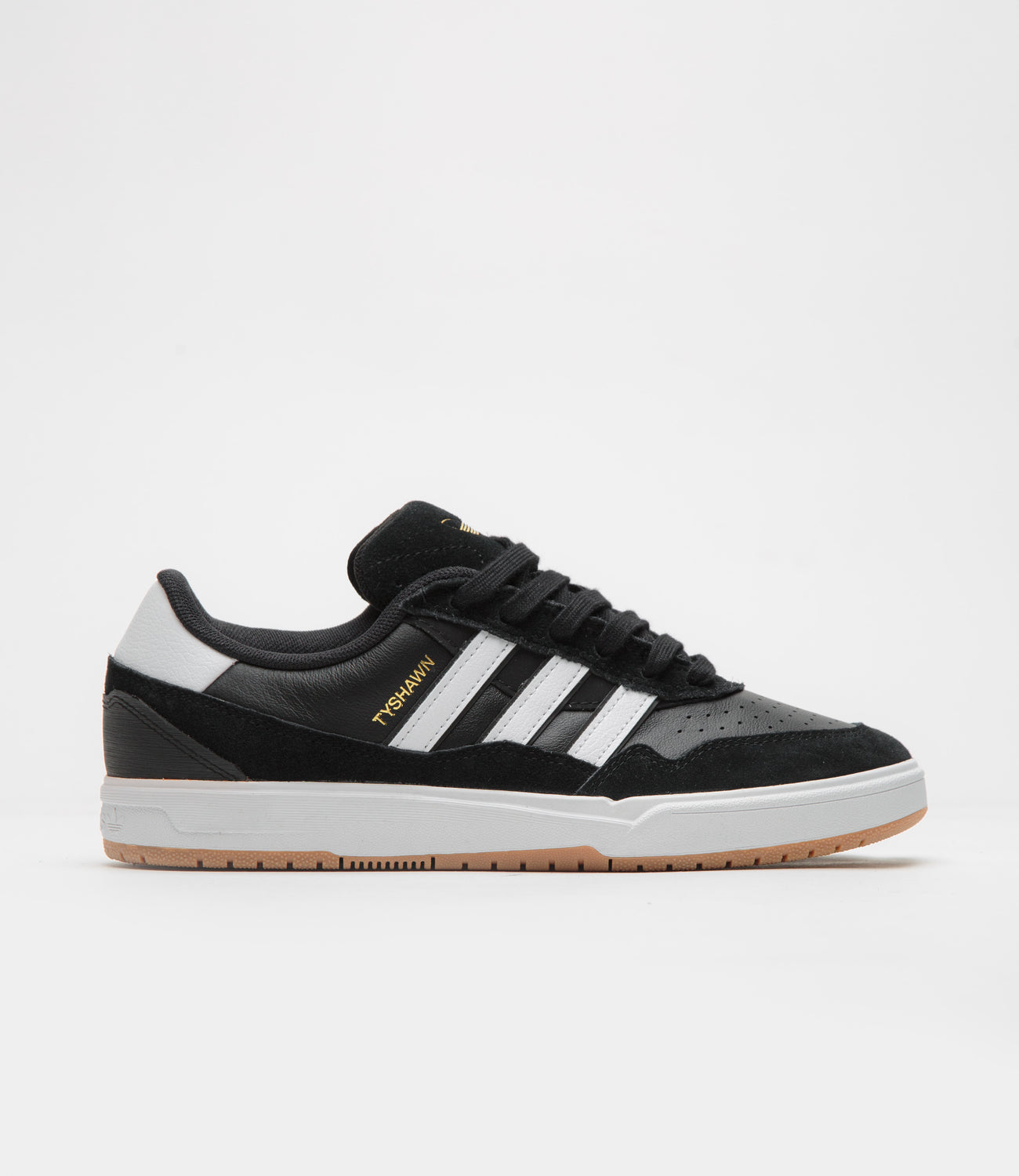 Adidas Tyshawn II Shoes in Core Black, White and Gum. Skater Tyshawn Jones’ second signature, this adidas Tyshawn II is designed with panelled suede and leather uppers. Featuring a perforated and double-layer toe cap, a Lightstrike midsole and a gum rubber outsole, this black adidas Tyshawn II is finished with a debossed suede tongue, gold foil branding and contrasting white 3-Stripe detailing.