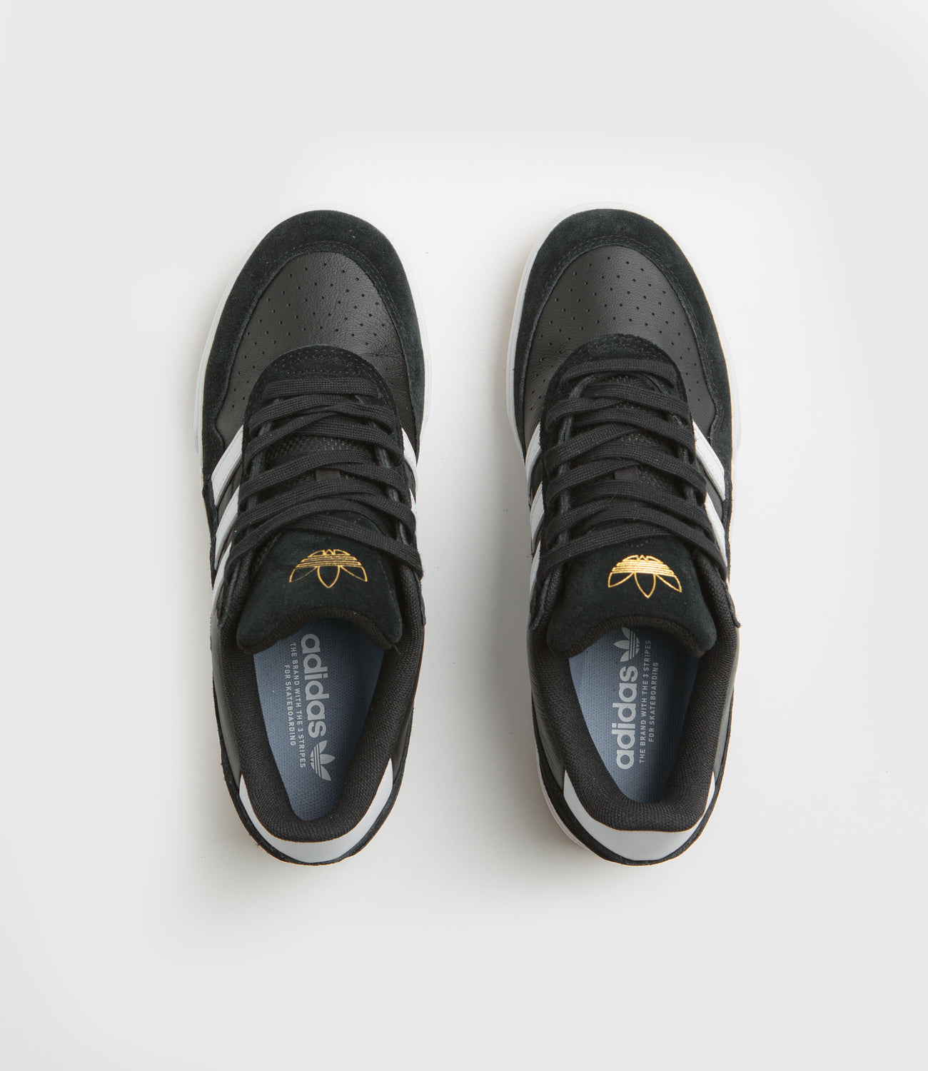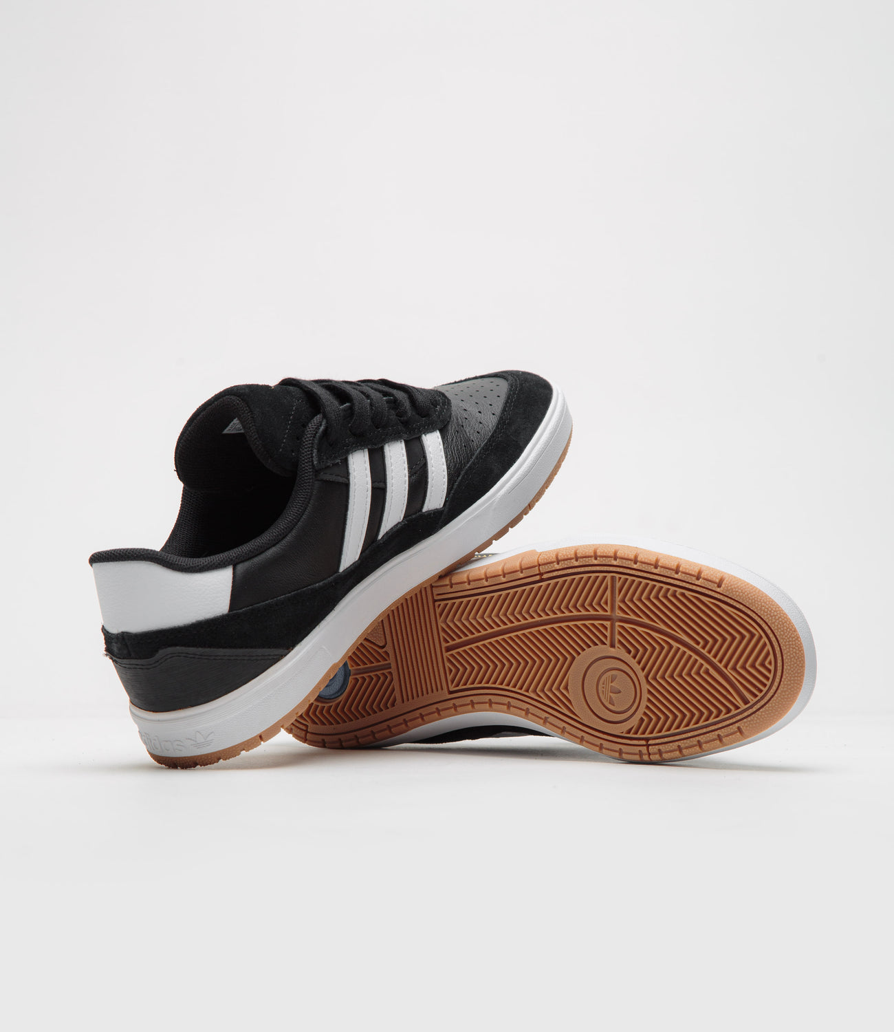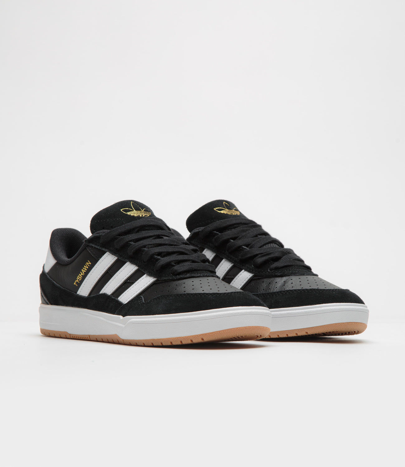 Adidas Tyshawn II Shoes in Core Black, White and Gum. Skater Tyshawn Jones’ second signature, this adidas Tyshawn II is designed with panelled suede and leather uppers. Featuring a perforated and double-layer toe cap, a Lightstrike midsole and a gum rubber outsole, this black adidas Tyshawn II is finished with a debossed suede tongue, gold foil branding and contrasting white 3-Stripe detailing.
