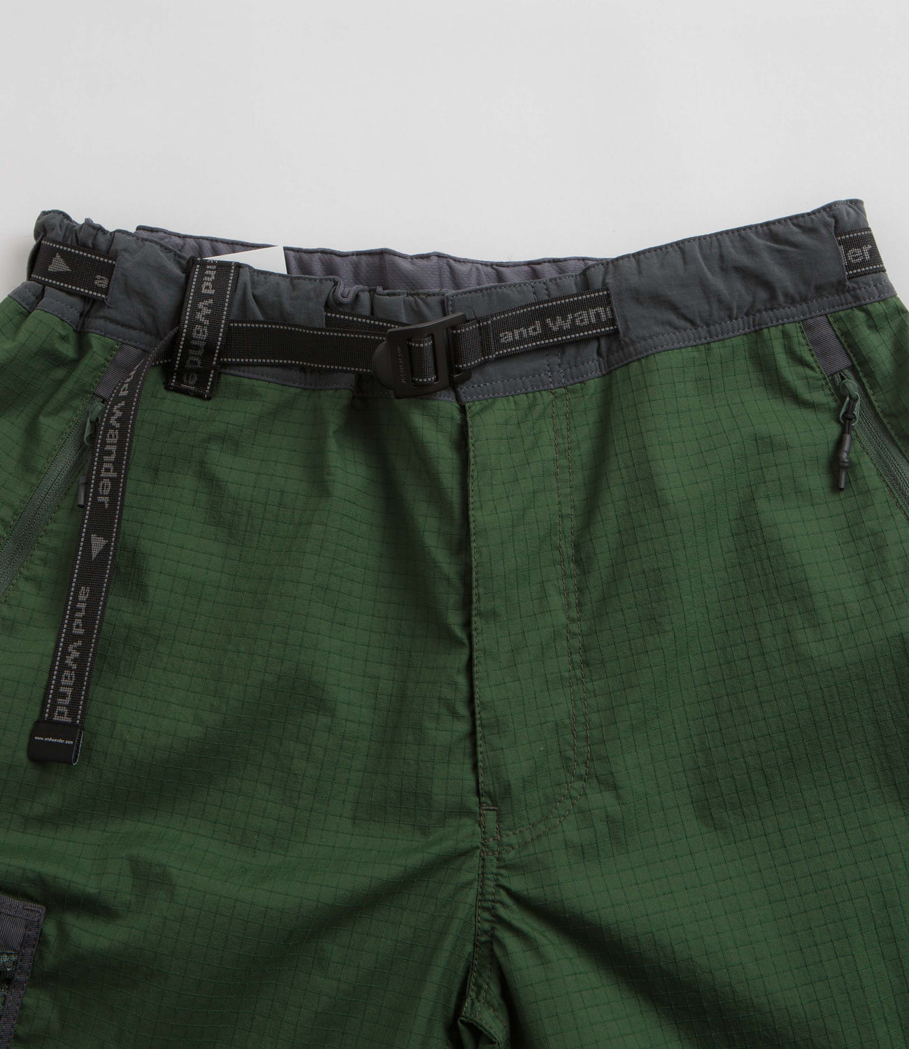 and wander Breath Rip Shorts in Green. Tailored to a regular fitting from nylon ripstop, these and wander shorts are designed with a DWR shell and reflector stitch detailing. Featuring an elasticated waist, a removable webbing belt and an additional front mesh pocket, these green and wander shorts are finished with two zippered front pockets, two zippered rear pockets and with printed logo branding.