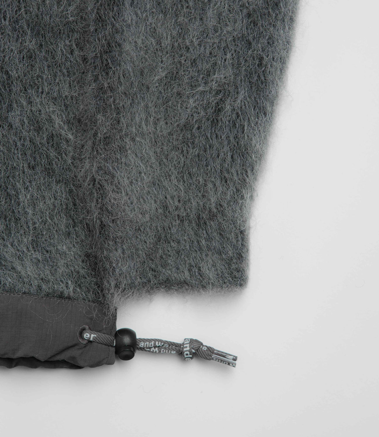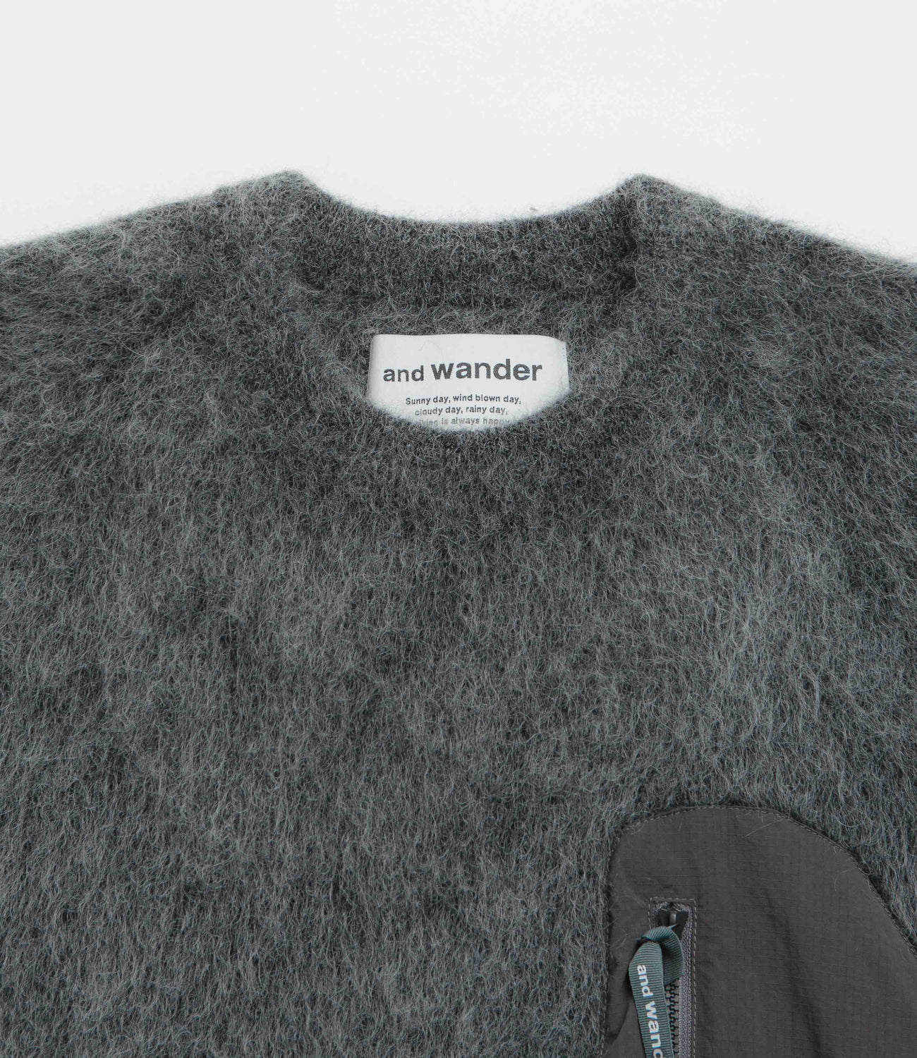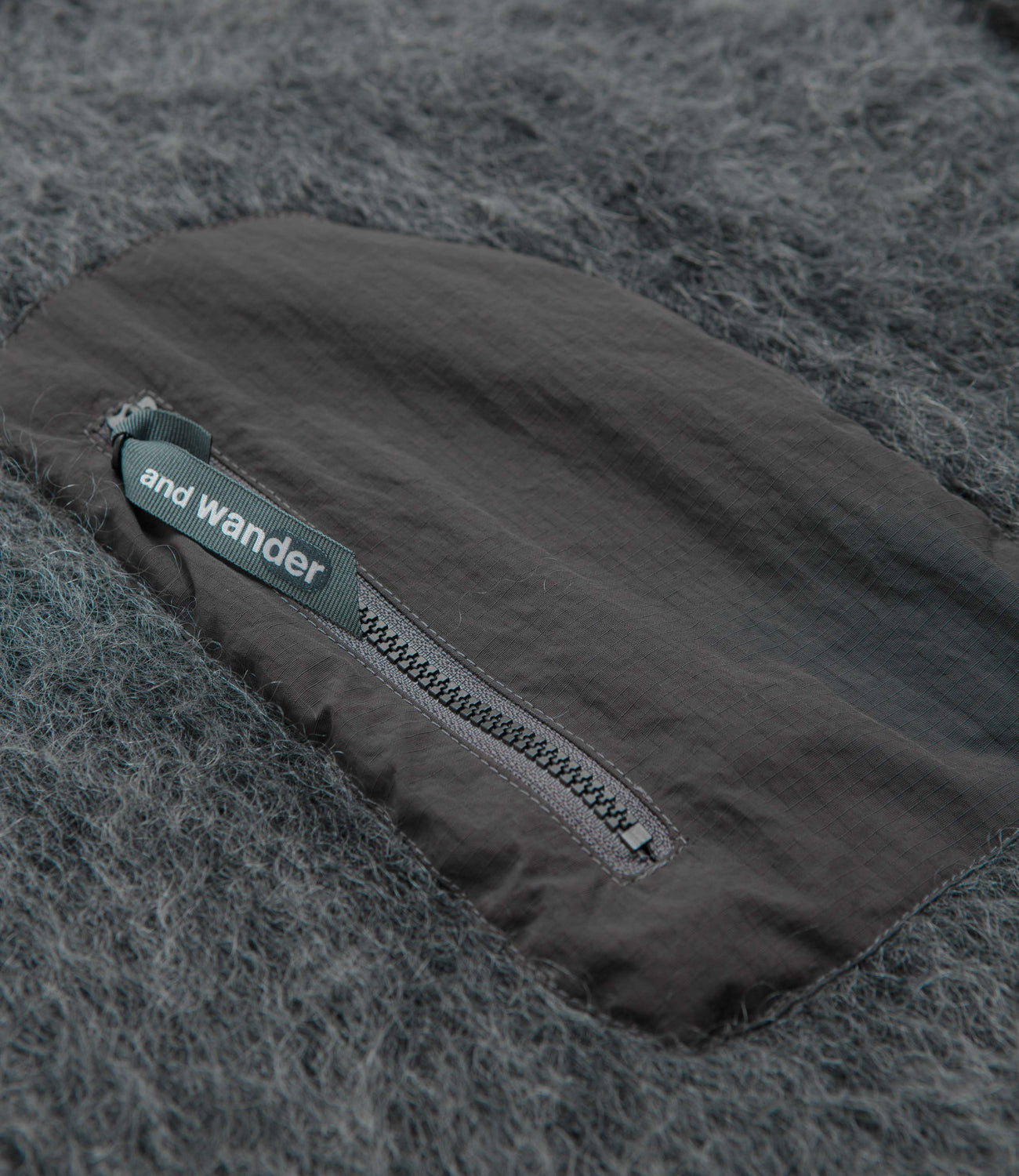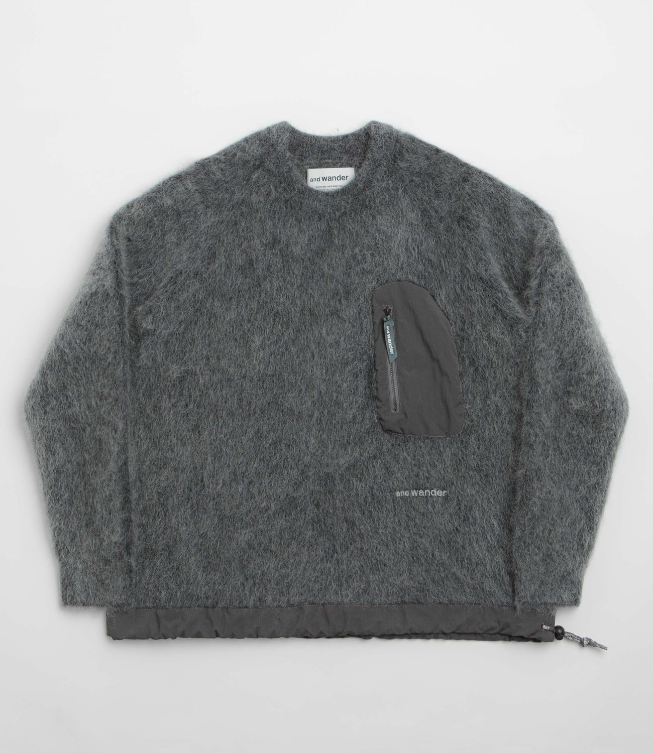and wander Mohair Wool Sweatshirt in Grey. Crafted from a mohair-wool blend, this regular fitting and wander sweatshirt is designed with contrast ripstop panelling. Featuring a classic crew collar, elasticated cuffs and a toggle-cord hem, this grey and wander sweater is finished with a zippered chest pocket and embroidered logo branding.