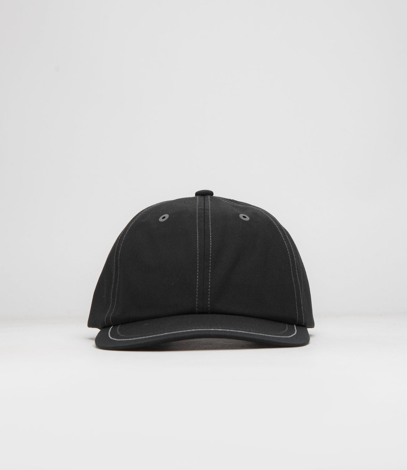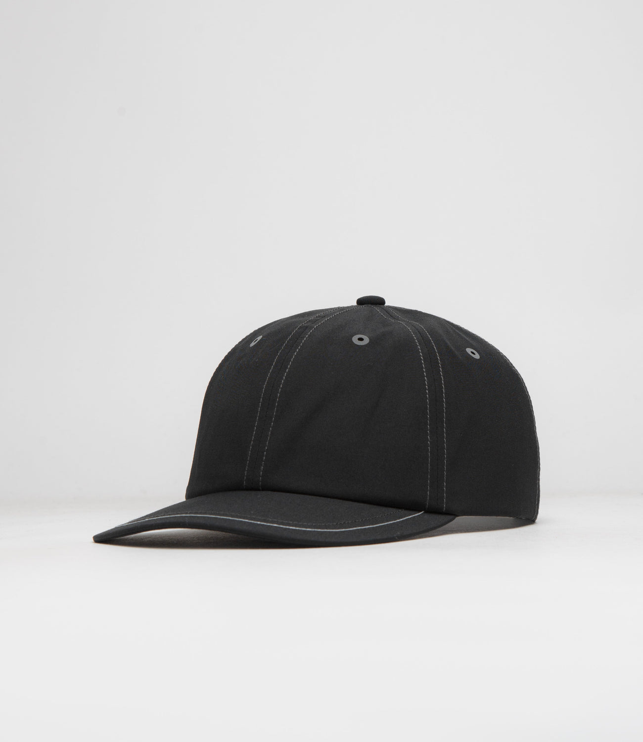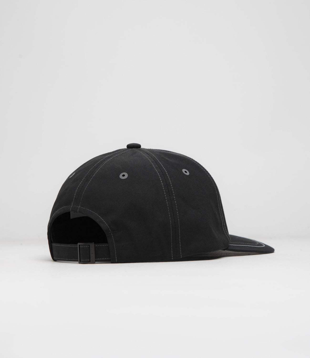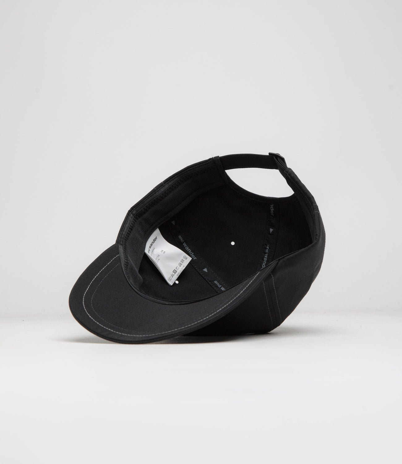 and wander PE CO Cap in Black. Single sized with a six panel profile, this and wander cap is crafted from a polyester-cotton blend. Featuring a reflective stitch curved peak, this black and wander cap is finished with embroidered airflow eyelets, an adjustable rear fastening and with reflective logo branding.