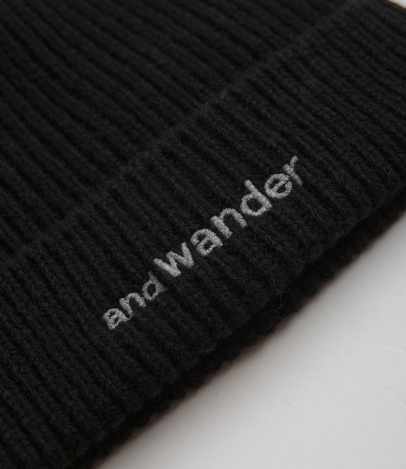 and wander Shetland Wool Beanie in Black. Single sized and crafted from 100% Shetland wool, this rib knit and wander beanie is designed with tonal stitched seams. Finished with an adjustable turn-up cuff with embroidered logo branding.
