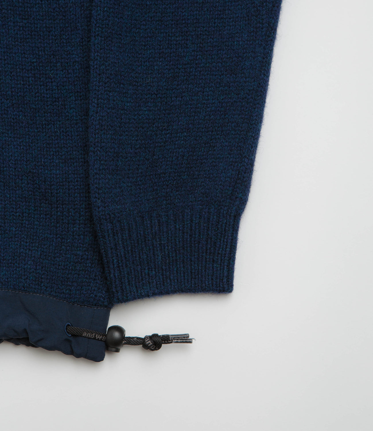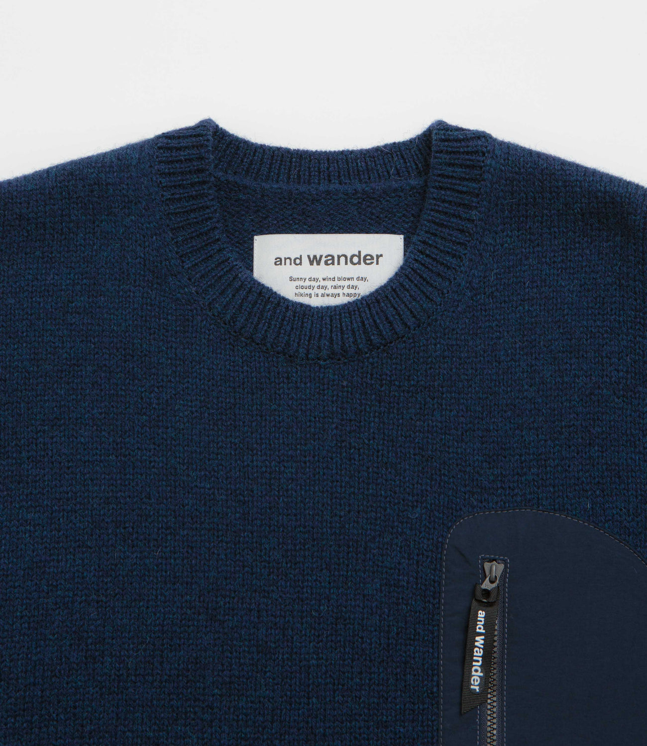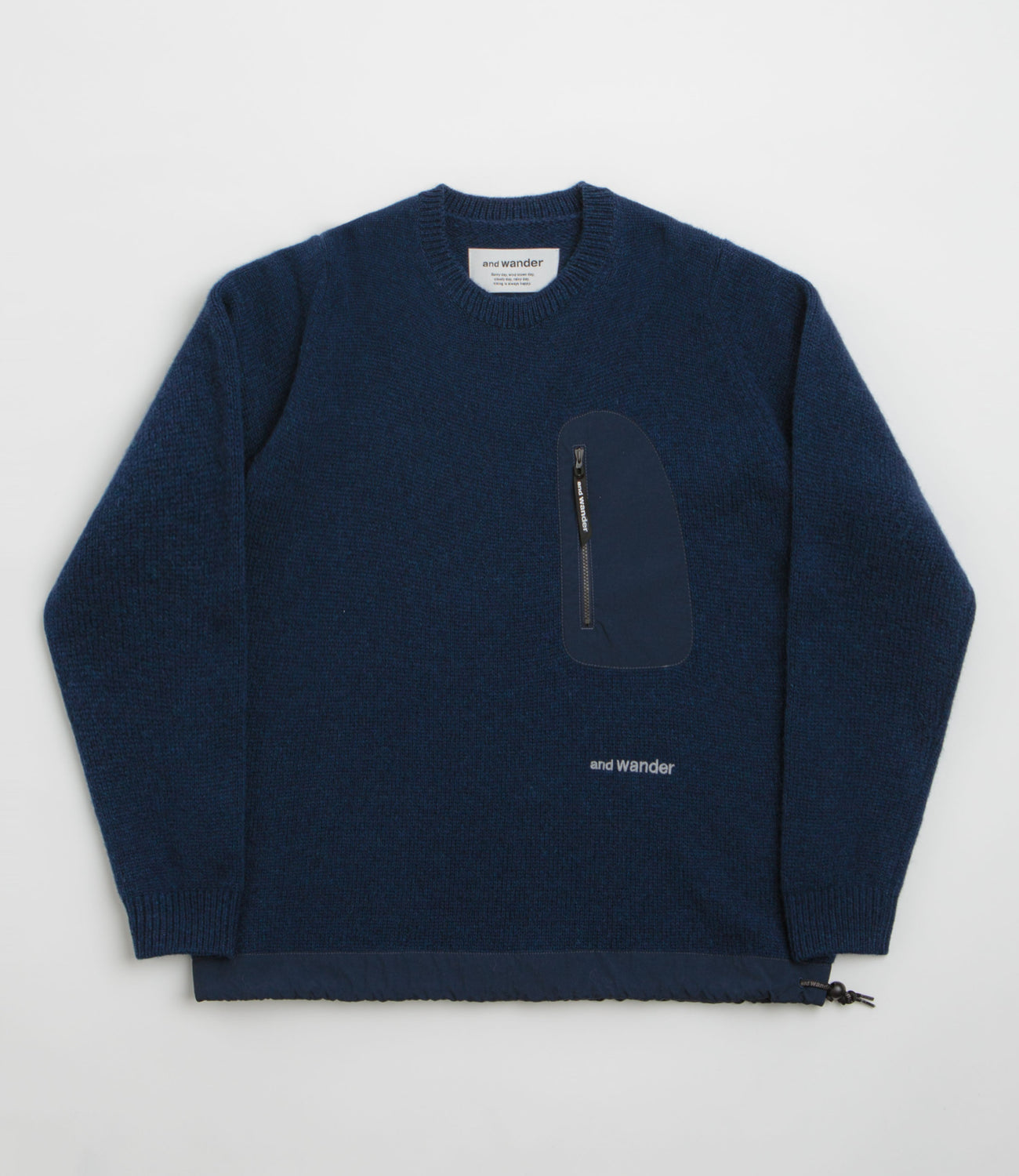 and wander Shetland Wool Sweatshirt in Blue. Crafted from 100% wool, this regular fitting and wander sweatshirt is designed with a classic crew collar and a toggle-cord adjustable hem. Featuring nylon panelling and rib knit cuffs, this blue and wander sweater is finished with a single zippered chest pocket and with embroidered logo branding.