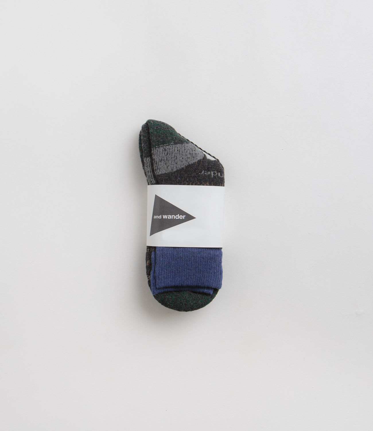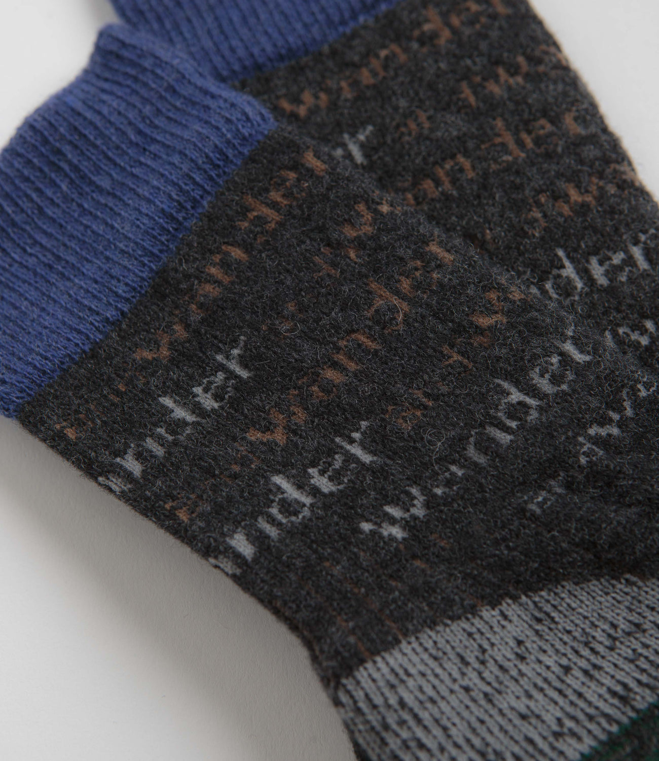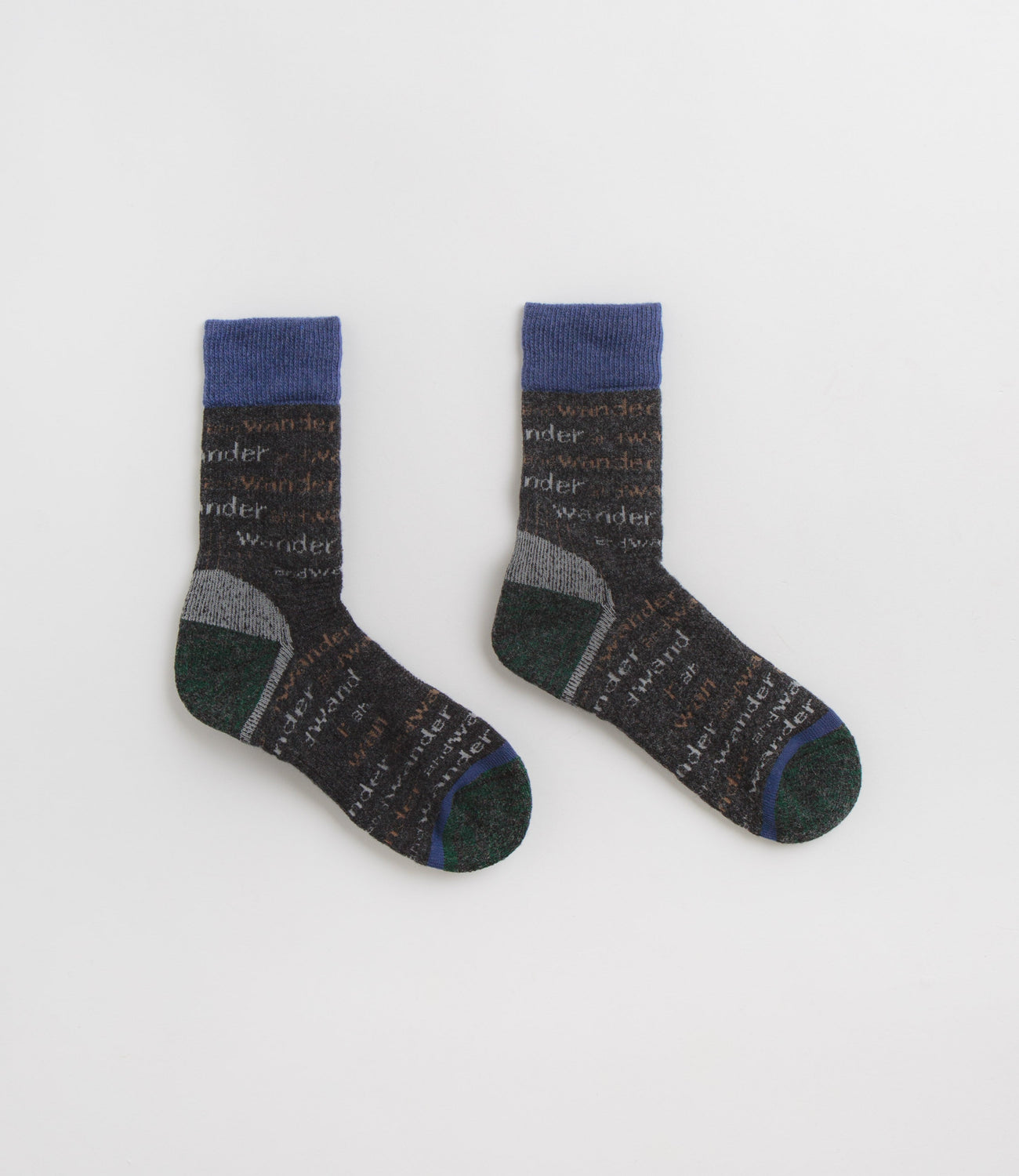 and wander Wool Socks in Charcoal. Designed with an all-over jacquard knit pattern, these crew length and wander socks are crafted from an Australian wool and nylon blend. Finished with contrasting forest green and navy panels with rib knit cuffs.