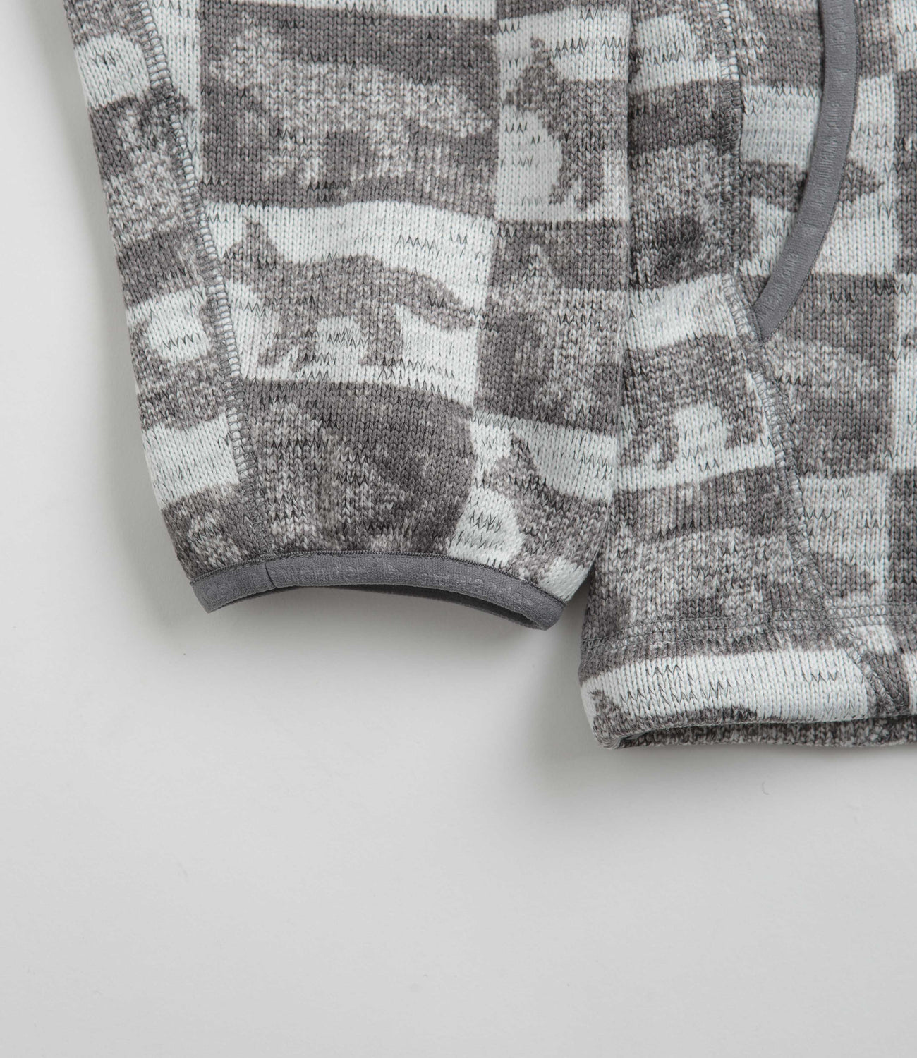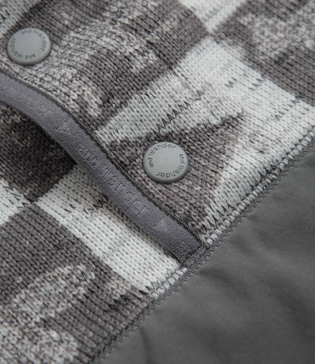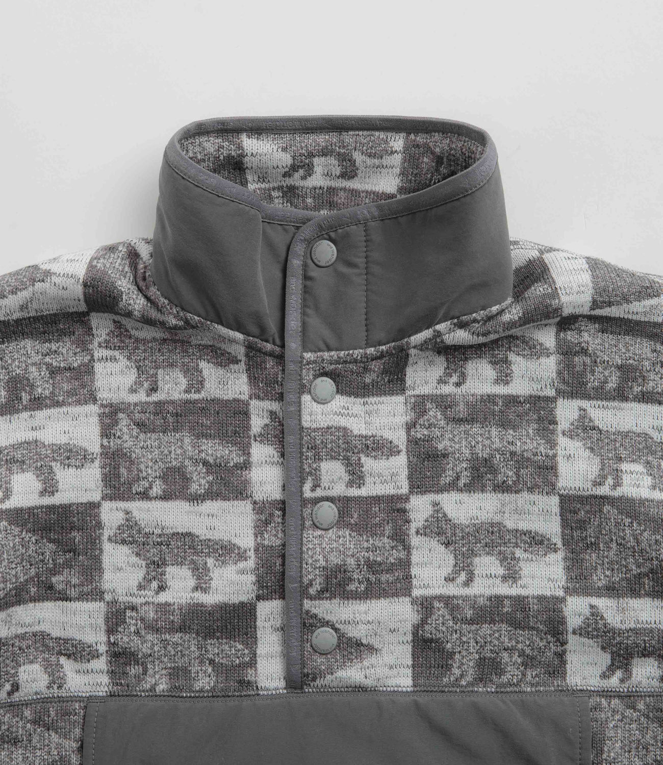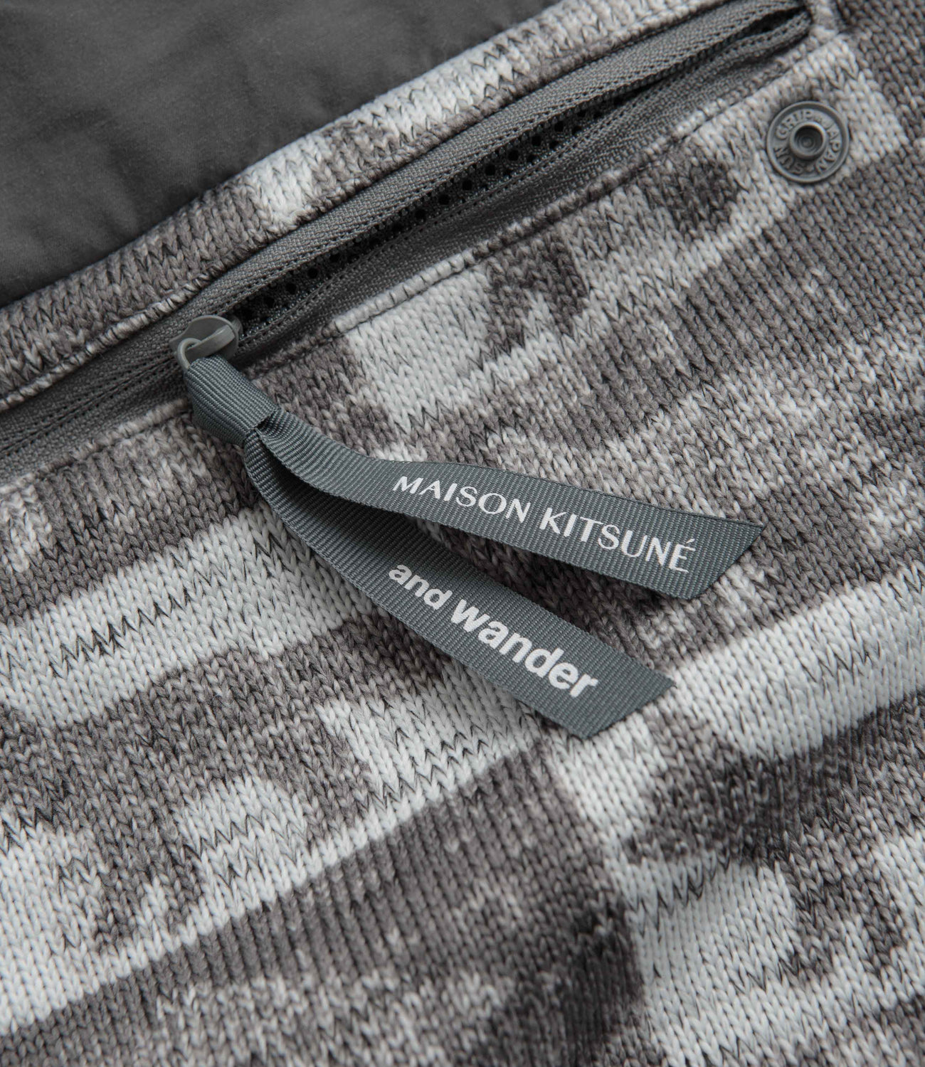 and wander x Maison Kitsune Fox Checkers Pullover Fleece in Grey. Designed in collaboration with Maison Kitsuné, this regular fitting and wander fleece features an all-over Original Fox motif with co-branded details. Crafted from 100% polyester Polar fleece with a high-rise neckline, a snap button placket and elasticated cuffs, this grey and wander fleece is finished with two side pockets, a centre chest map pocket and with co-branded zipper pulls.