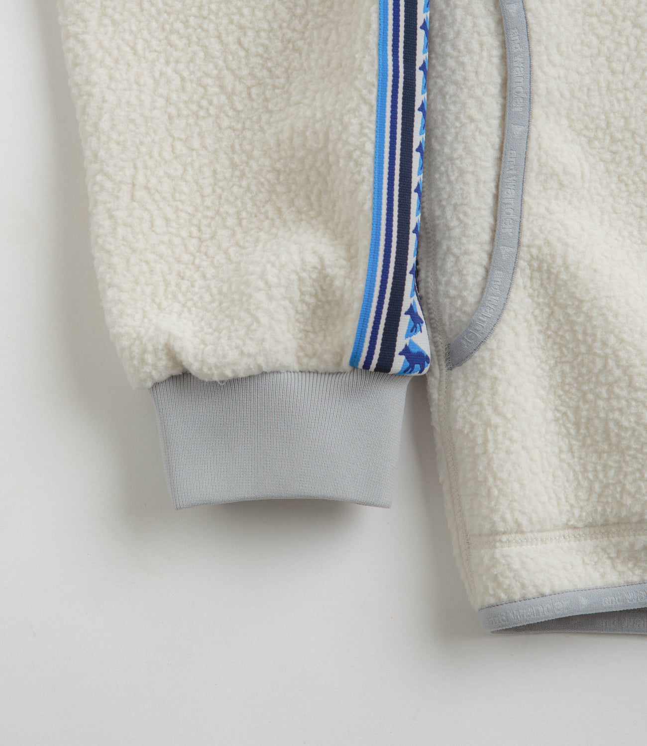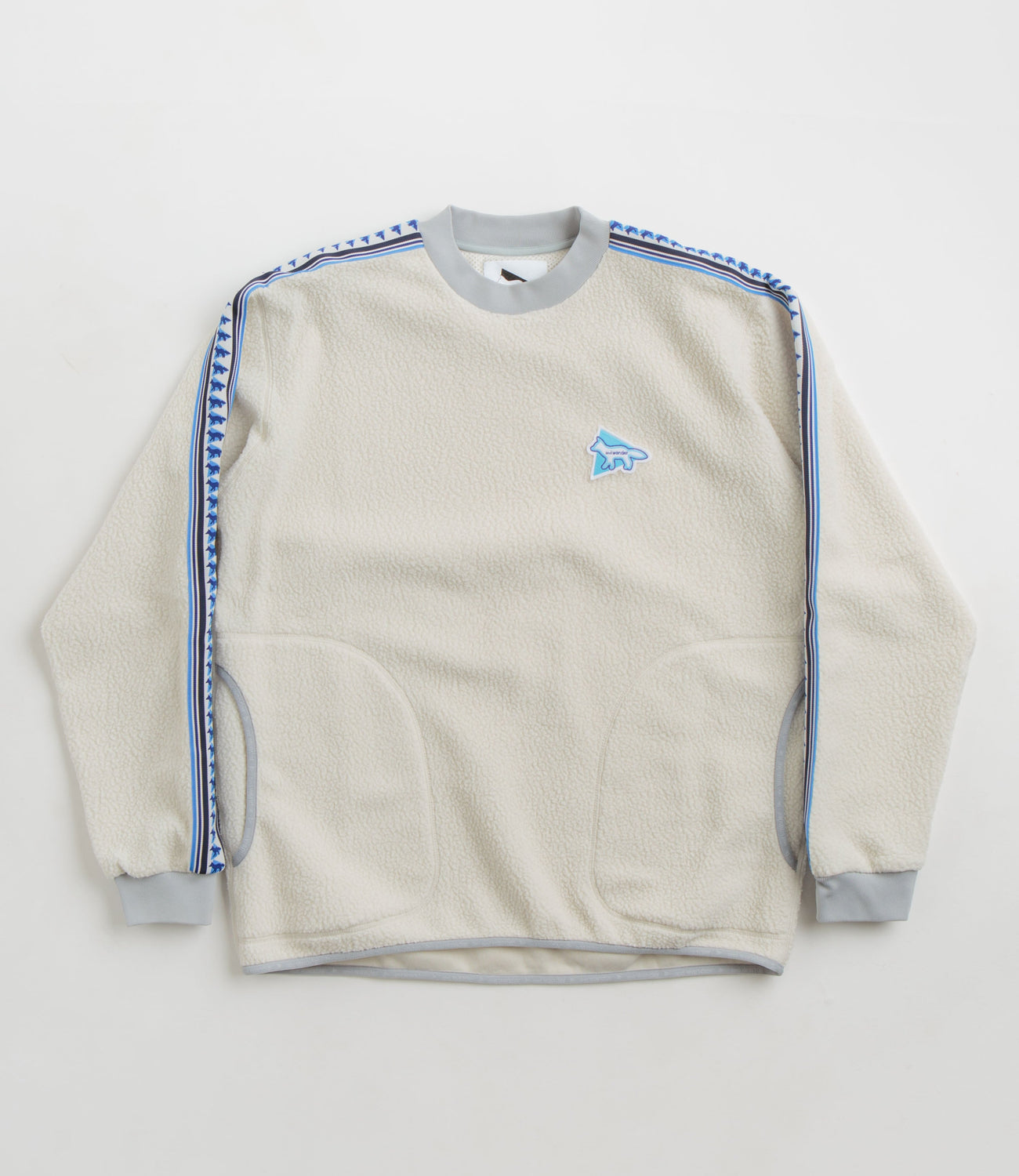 and wander x Maison Kitsune Pullover Fleece Sweatshirt in White. Designed in collaboration with Maison Kitsuné, this regular fitting and wander fleece is crafted from Polar fleece with taped sleeve details and contrast ribbing. Featuring a classic crew collar, rib knit cuffs and a woven elastic hem, this beige and wander fleece is finished with exposed stitch waist pockets and with a co-branded and wander x Maison Kitsuné chest patch.