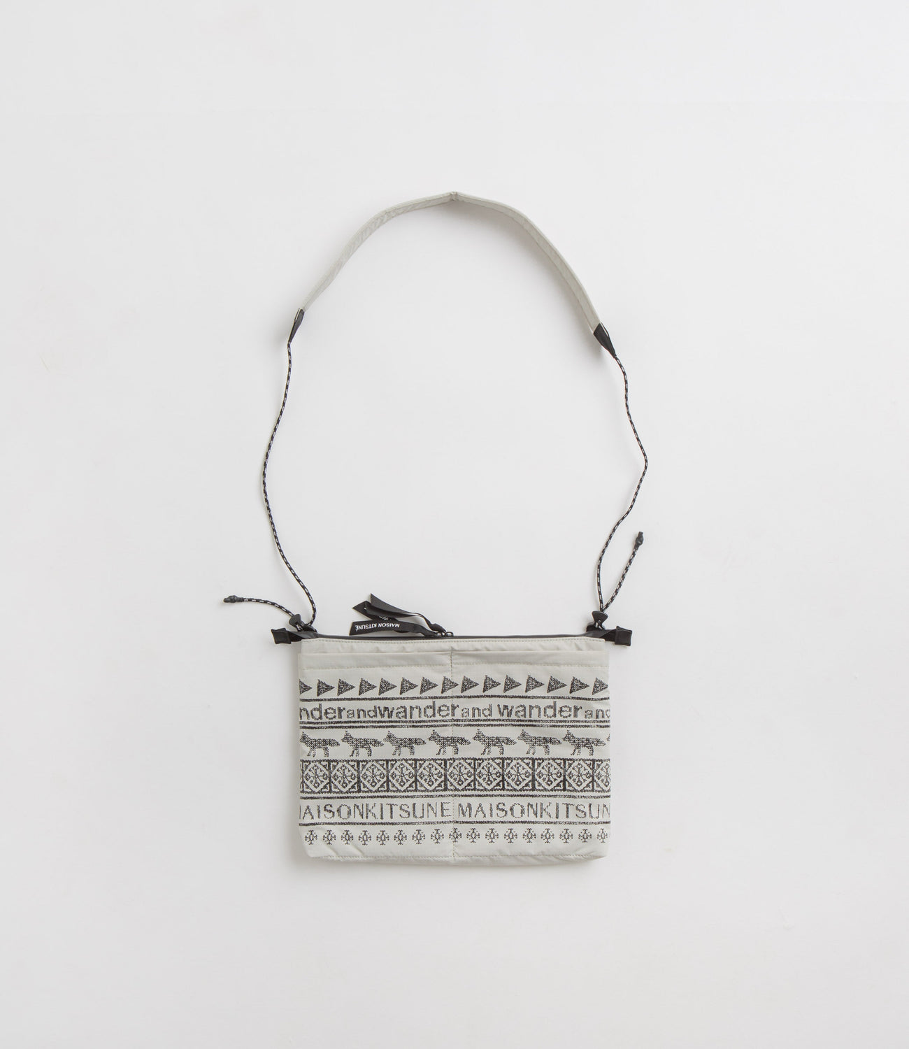and wander x Maison Kitsune Sacoche in Light Beige. Designed in collaboration with Maison Kitsuné with an all-over Nordic border print, this single sized and wander sacoche is crafted from 100% polyester. A cross-body design with a zippered main pocket, a drawcord adjustable strap and additional inner mesh pockets, this beige and wander bag is finished with printed rear branding and co-branded woven zip pulls.