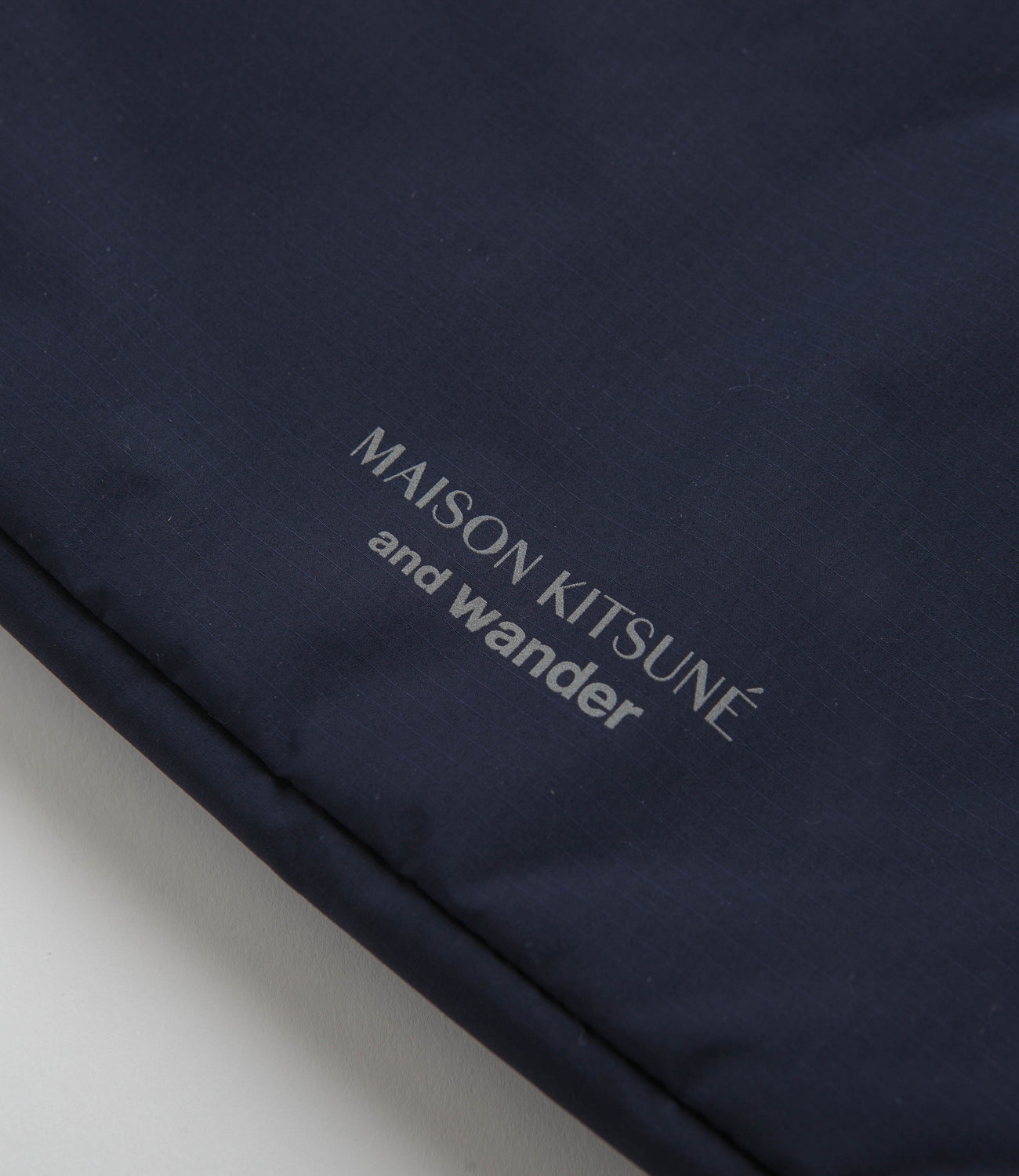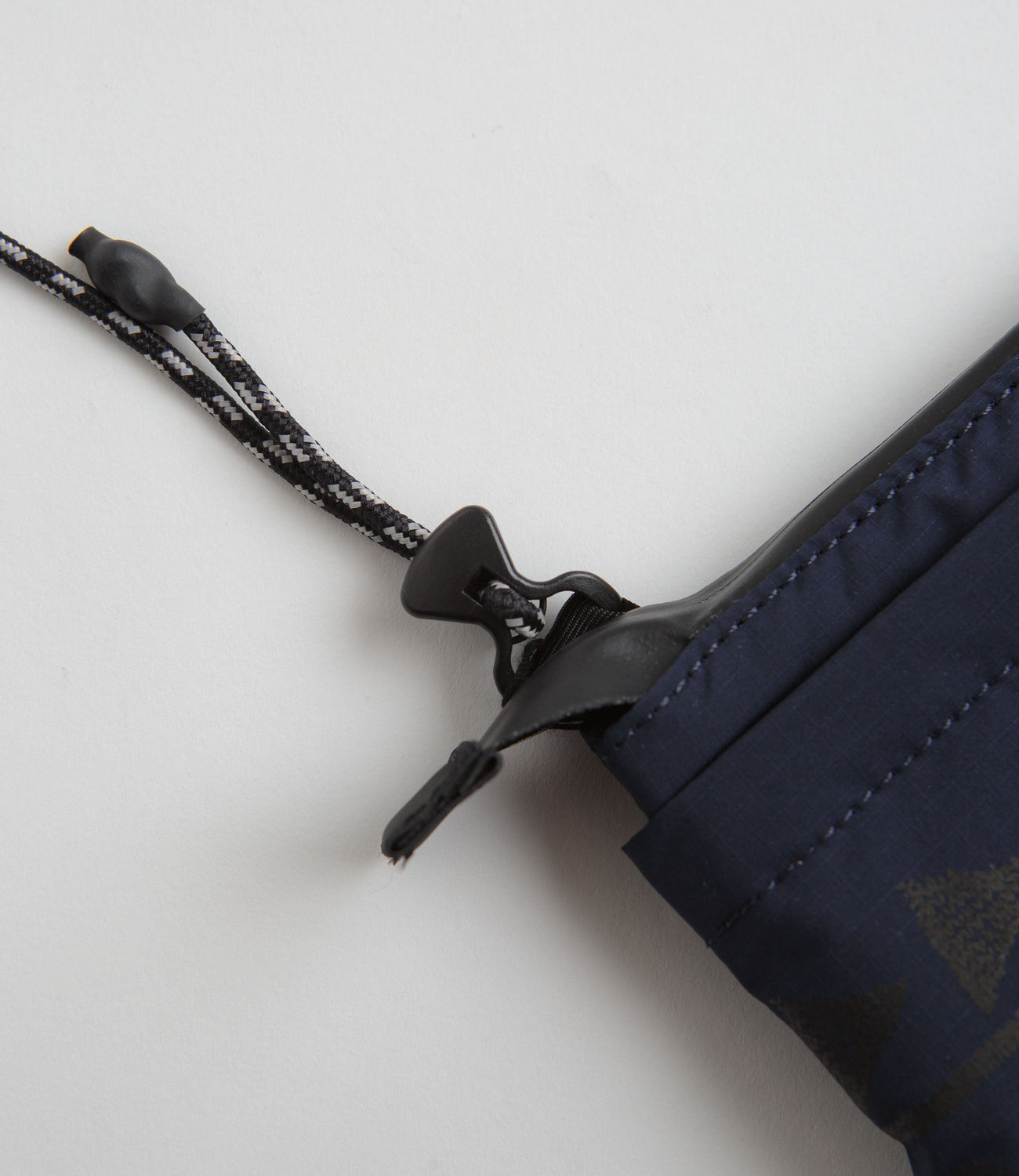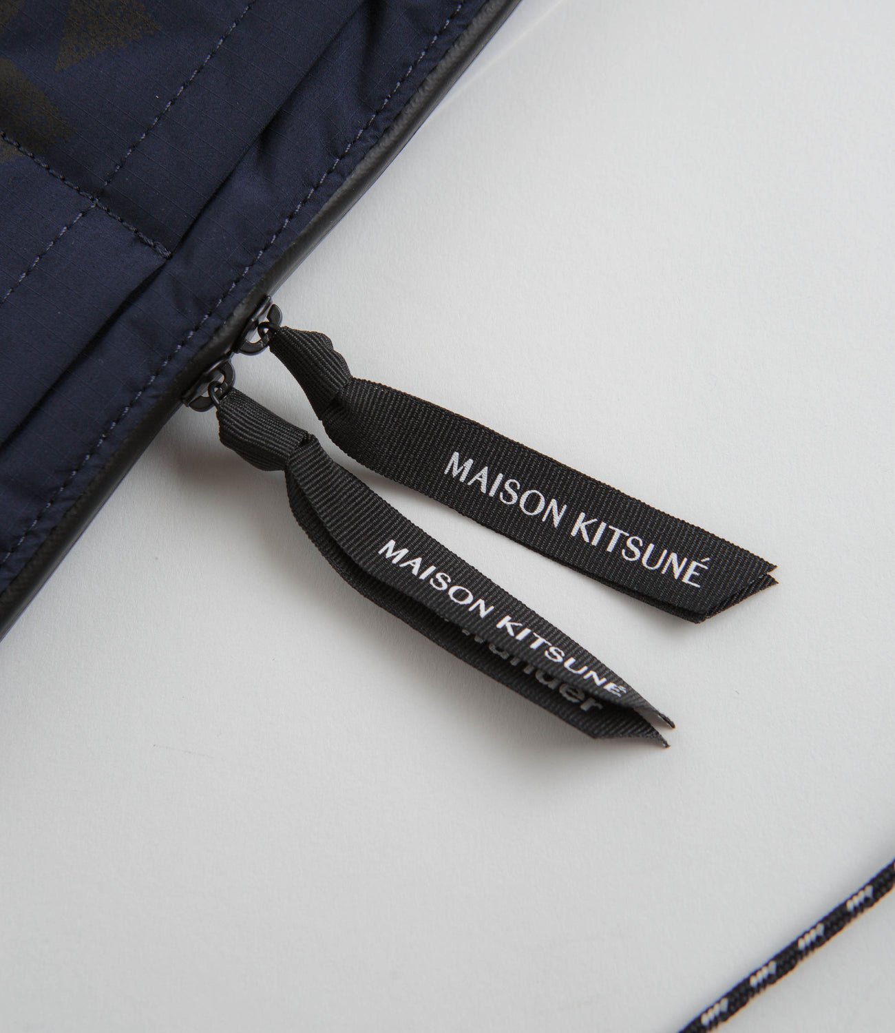and wander x Maison Kitsune Sacoche in Navy. Crafted from 100% polyester and designed in collaboration with Maison Kitsuné, this single sized and wander sacoche is styled with an all-over Nordic border print. Featuring a drawcord adjustable strap, a zippered main pocket and additional inner mesh pockets, this navy and wander bag is finished with printed rear branding and with co-branded woven zip pulls.