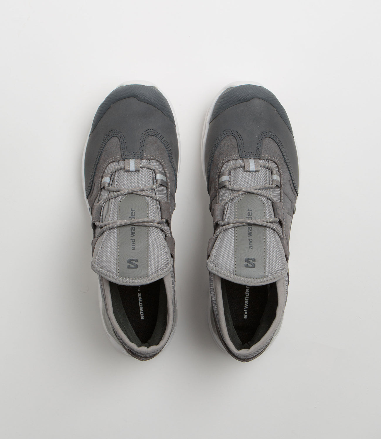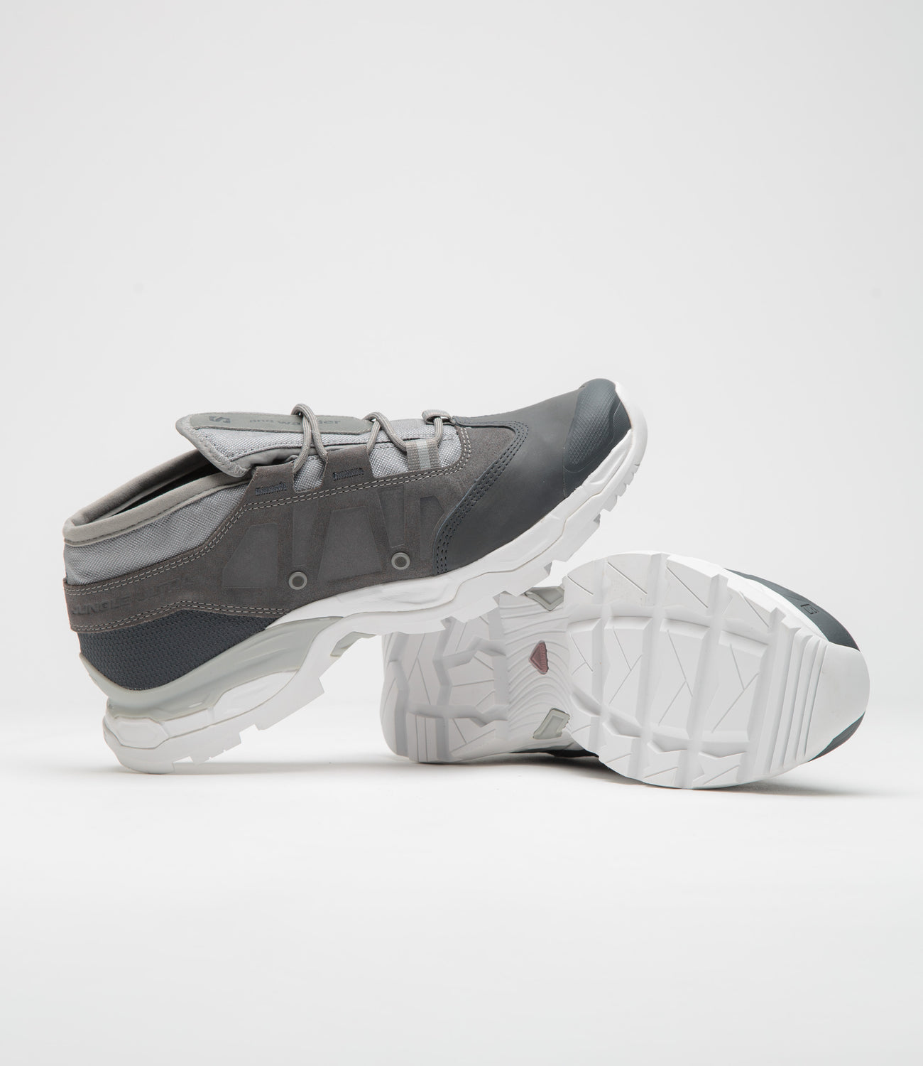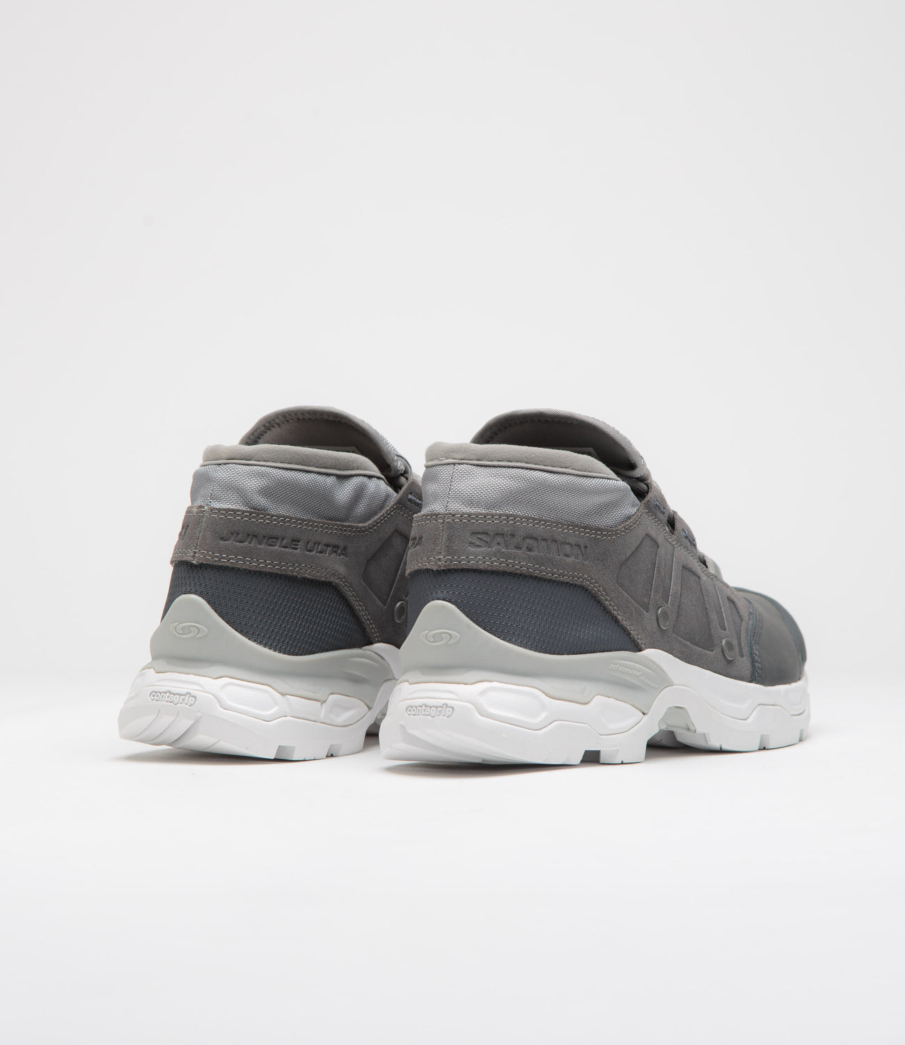and wander x Salomon Jungle Ultra Low Shoes in Grey. Military inspired with a revised sense of minimalism, this and wander x Salomon Jungle Ultra Low arrives as part of both parties’ latest collaborative collection. Designed with leather uppers and single-layer mesh and suede details, this grey Salomon Jungle Ultra Low also features a soft EVA midsole, SensiFit™ cradling, an OrthoLite® sockliner and a Contagrip® outsole. Hiking style laces secure the gusseted tongue in place, whilst partial reflective details increased after-dark wear. Finished with a protective toe cap, co-branded tongue tabs and with embossed ‘Salomon x and wander’ branding etched across each heel.