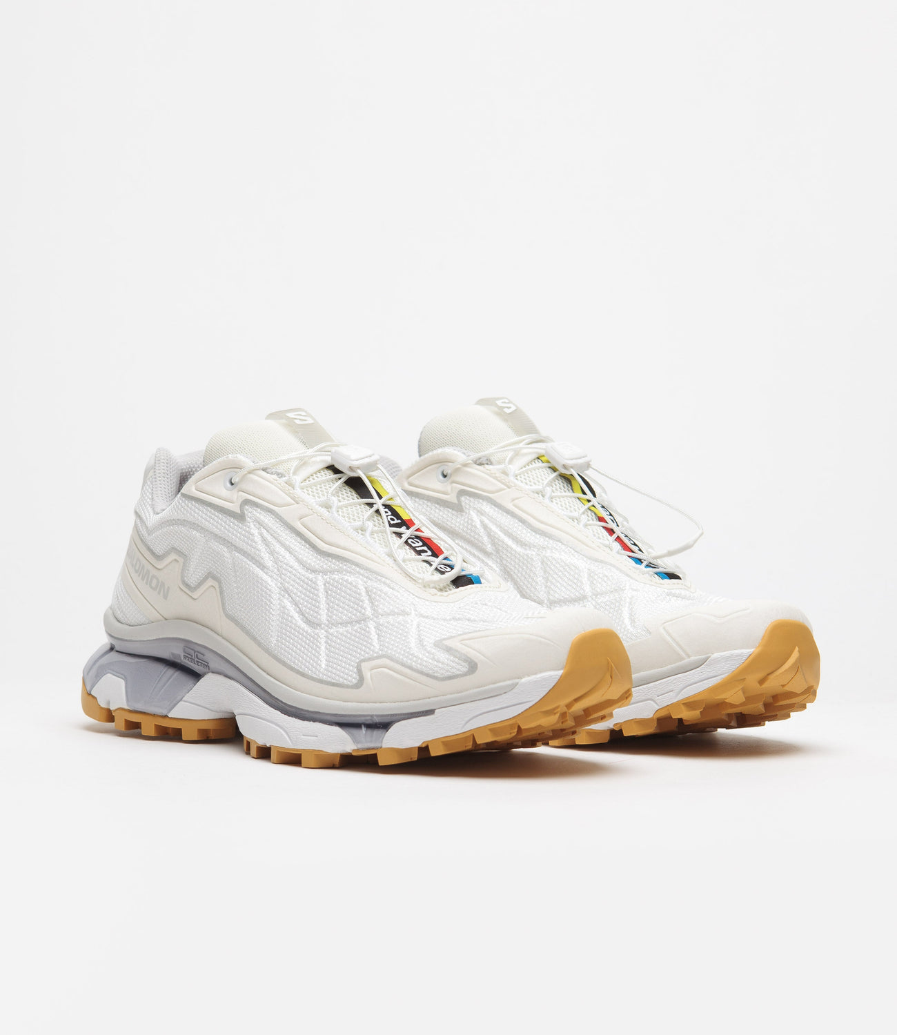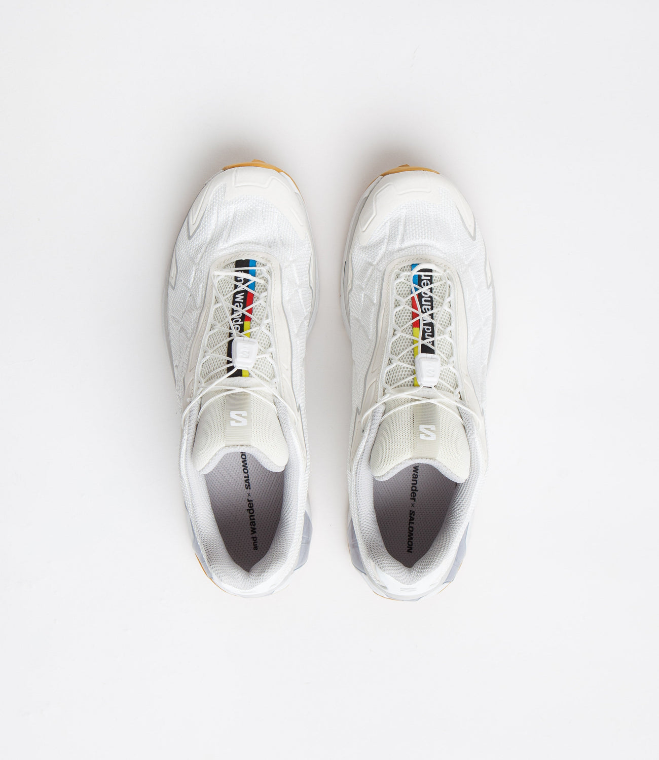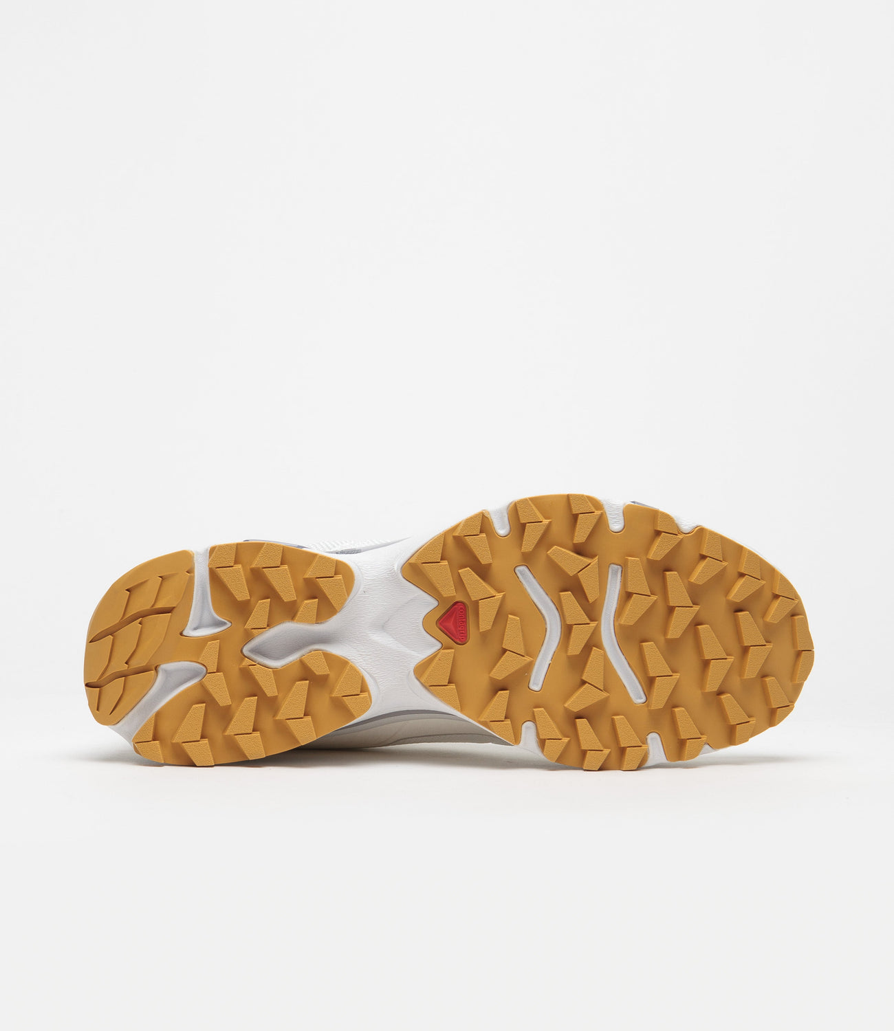 and wander x Salomon XT-Slate Shoes in White. Inspired by the landscape of rocky trails, this and wander x Salomon XT-Slate is designed with waffle mesh and synthetic uppers with anti-debris mesh underlays. Featuring an Advanced Chassis™ Skeleton, OrthoLite® insoles and a cushioned EVA midsole, this white Salomon XT-Slate also features a Contagrip® outsole with a reverse chevron lug pattern. The Quicklace™ system secures the woven tongue in place, whilst the traditional Salomon tongue labels are replaced with co-designed ‘and wander’ details. Finished with co-branded printed insoles, a protective toe cap, a protective mudguard and with printed ‘Salomon XT-Slate’ detailing displayed across each lateral quarter.