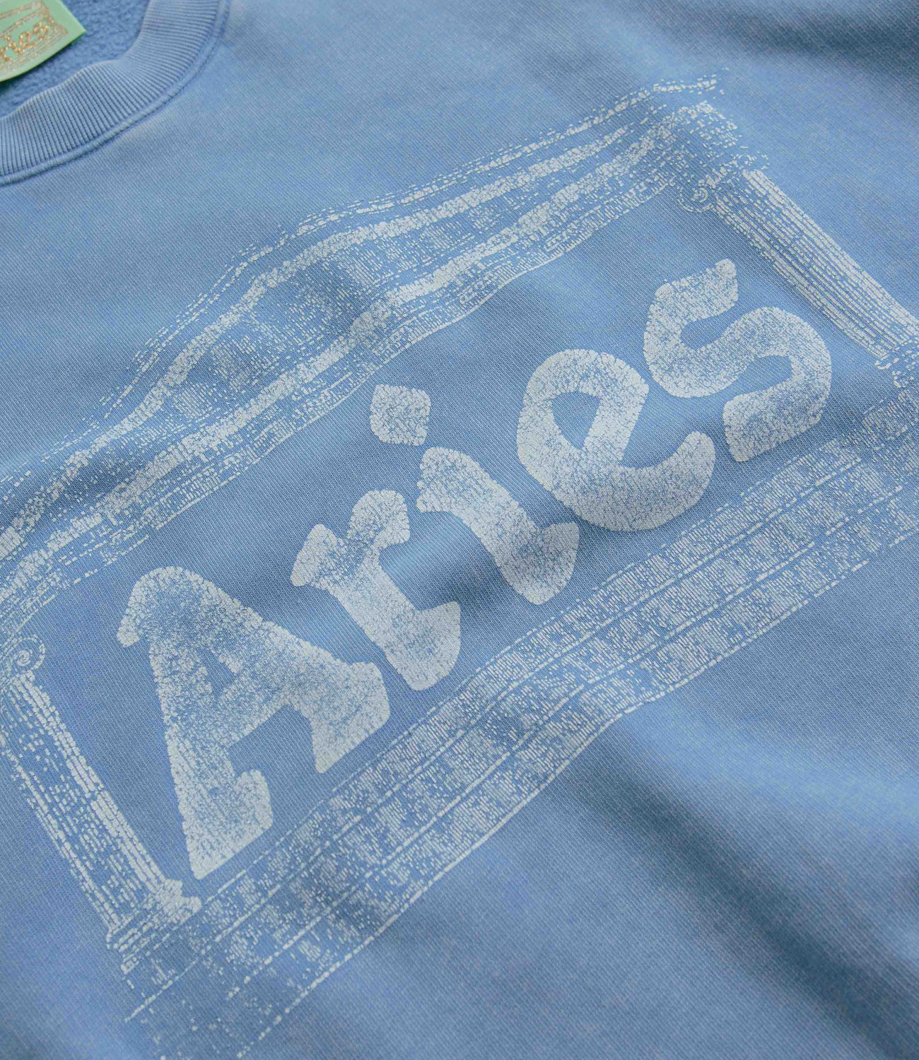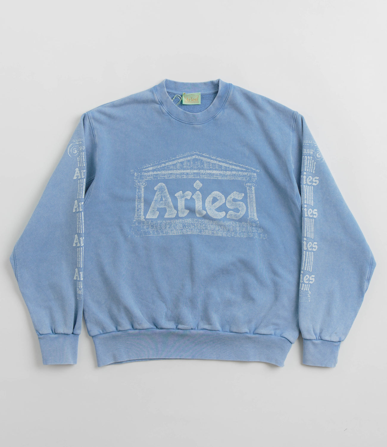 Aries Aged Ancient Column Crewneck Sweatshirt in Pale Blue. Crafted from 100% cotton, this unisex fitting Aries sweatshirt is designed with a brushed fleece lining and with a classic crew collar. Finished in a shade of blue with a printed chest graphic and with printed sleeve logos.