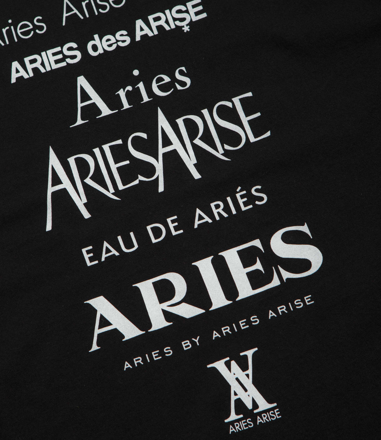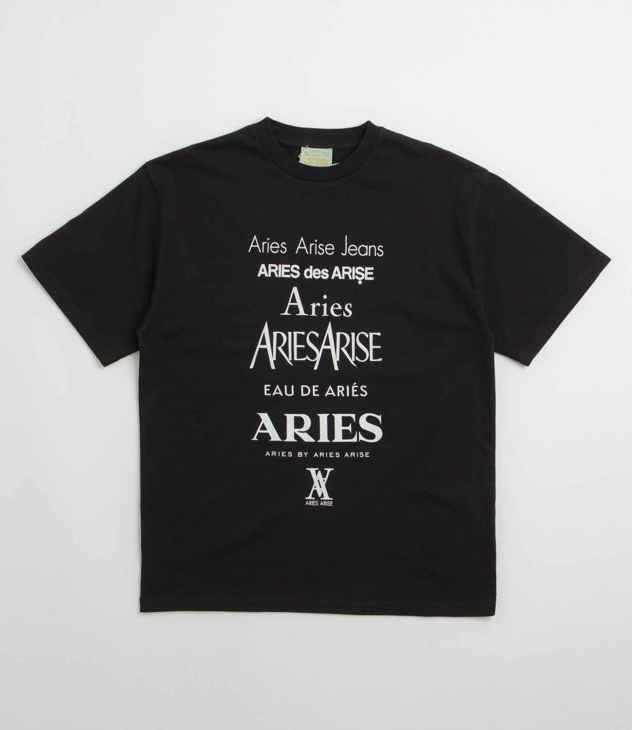 Aries Perfume T-Shirt in Black. Tailored to a unisex regular fitting, this Aries t-shirt is crafted from 100% cotton. Featuring a classic crew collar and a straight cut hem, this black Aries t-shirt is finished with a printed centre chest graphic.