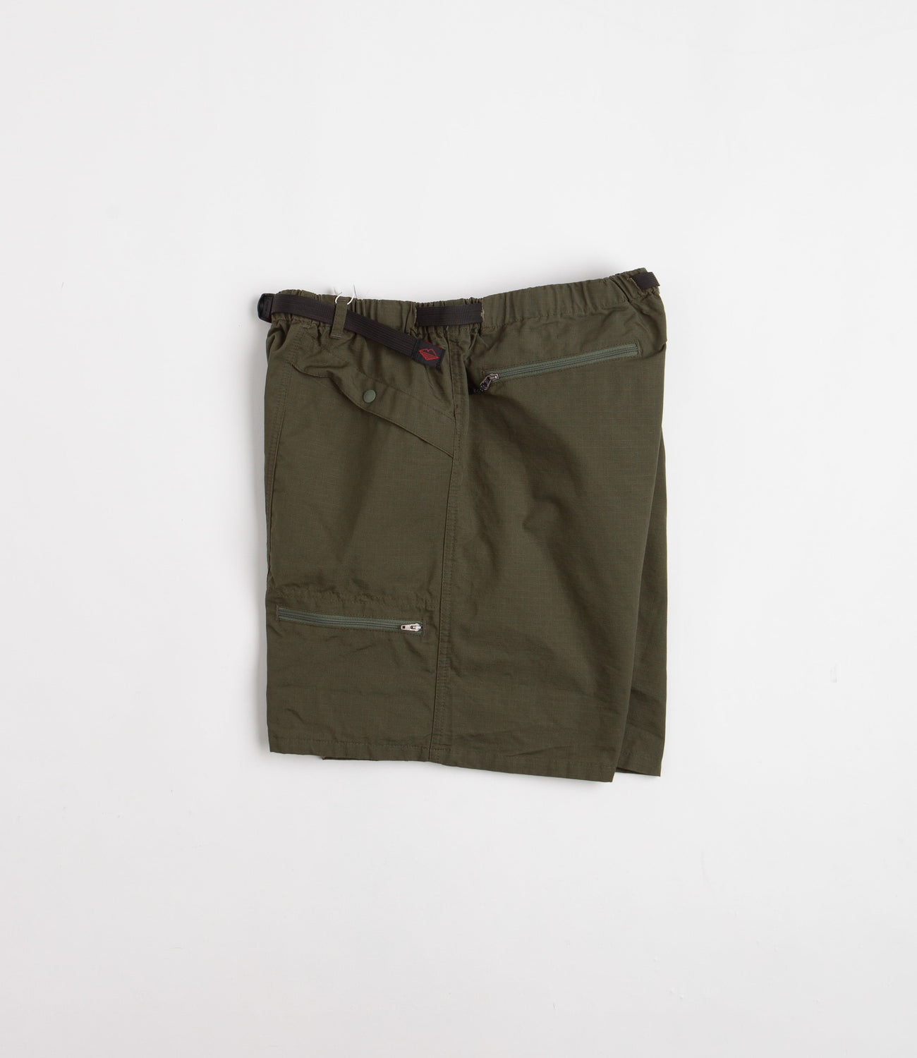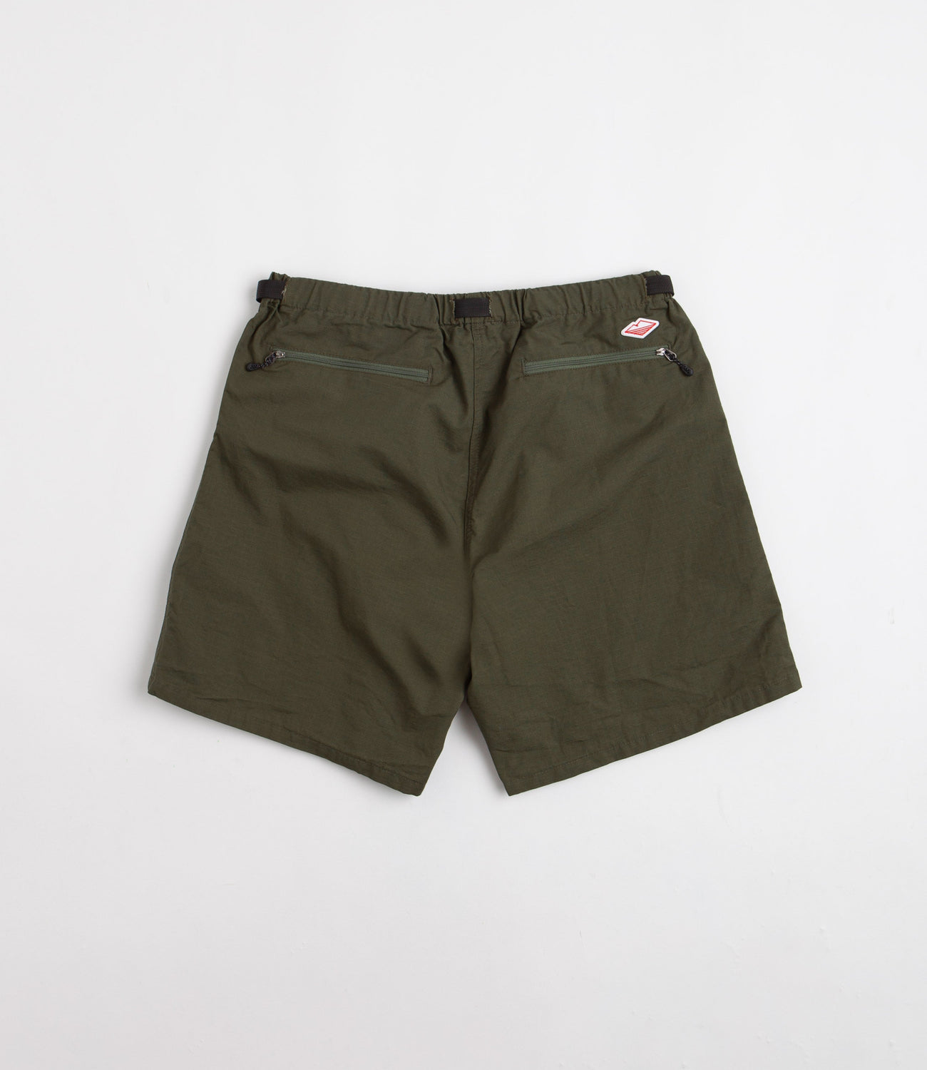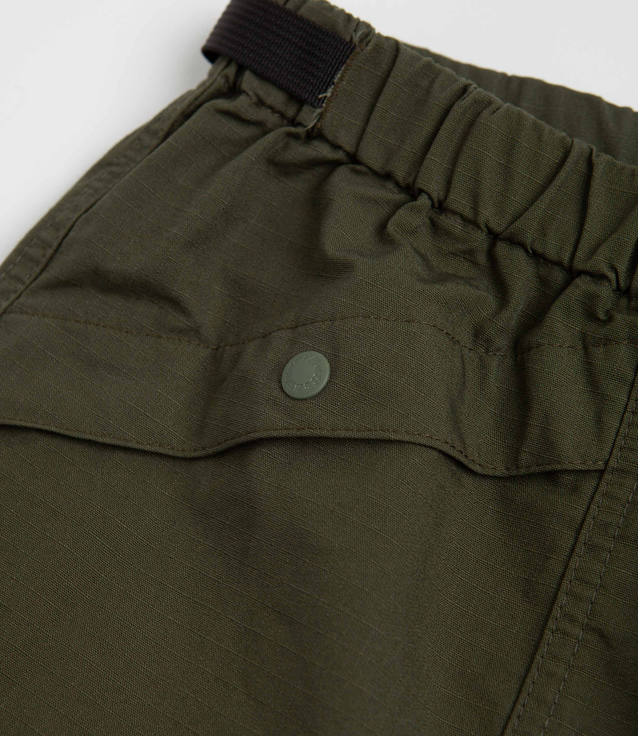 Battenwear Camp Shorts in Olive Drab Ripstop. Crafted from 100% cotton ripstop with a wind-resistant and water-repellent shell, these regular fitting Battenwear shorts are styled with a 7” inseam. Featuring an elasticated waist with an integrated webbing belt, these olive green Battenwear shorts are finished with two snap secured front pockets, two rear pockets, two additional zipper pockets and with an embroidered brand patch sewn across the rear.