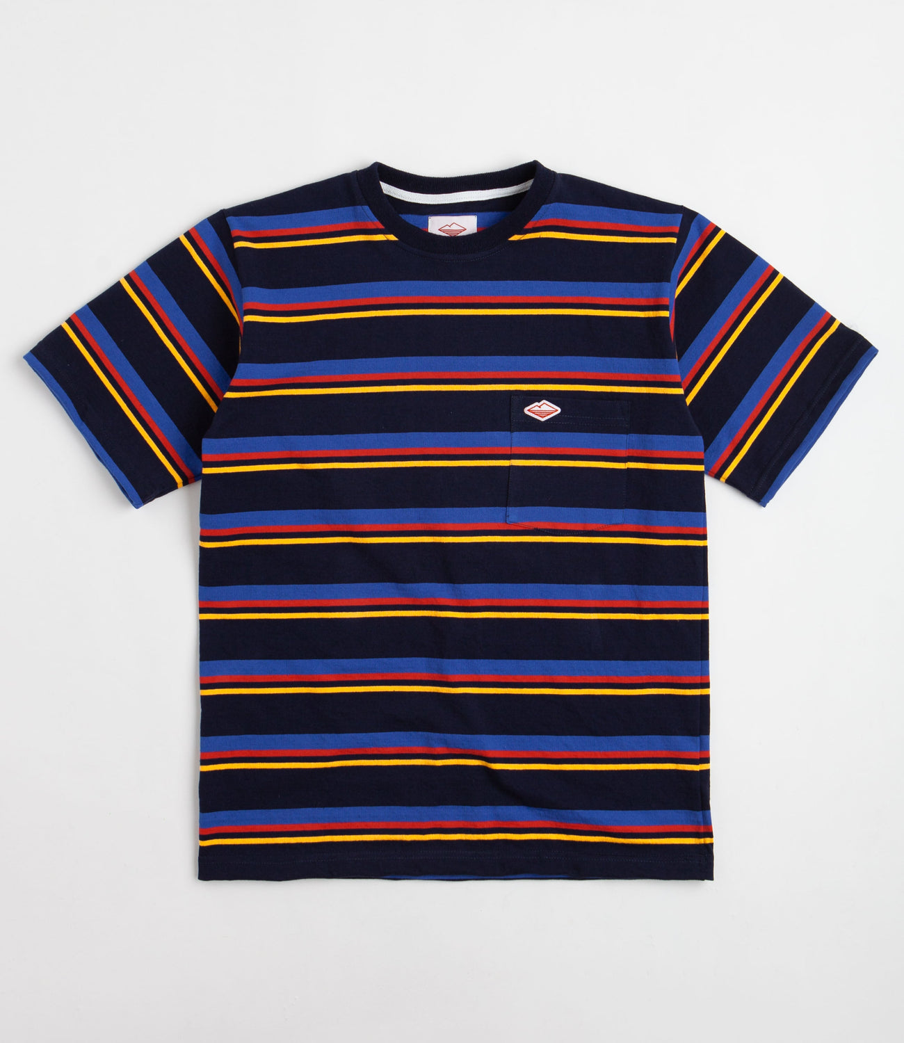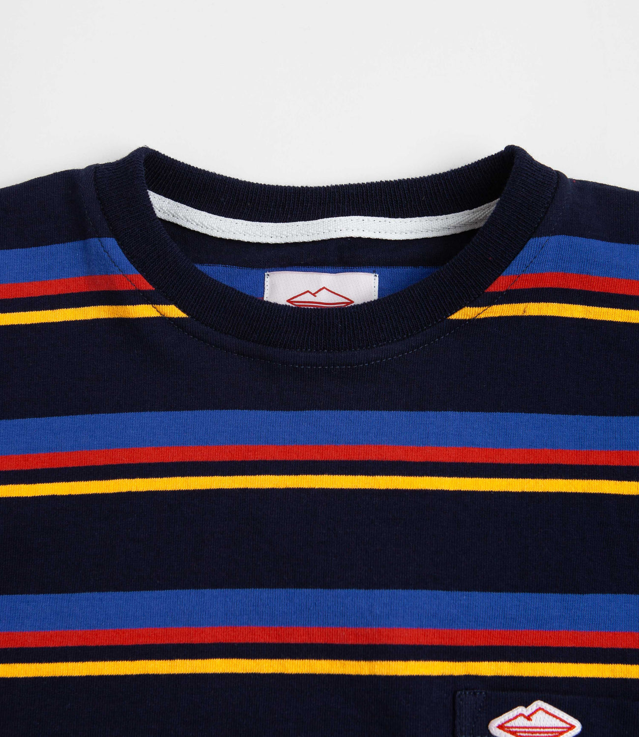 Battenwear Pocket Rugby T-Shirt in Multi Stripe. Crafted from 100% cotton, this striped Battenwear t-shirt arrives as part of the brand’s latest collection. Vintage inspired and tailored to a boxy fitting, this multicoloured Battenwear t-shirt features dropped shoulders, a twill tape rib knit collar, a single chest pocket and embroidered brand patch detailing.