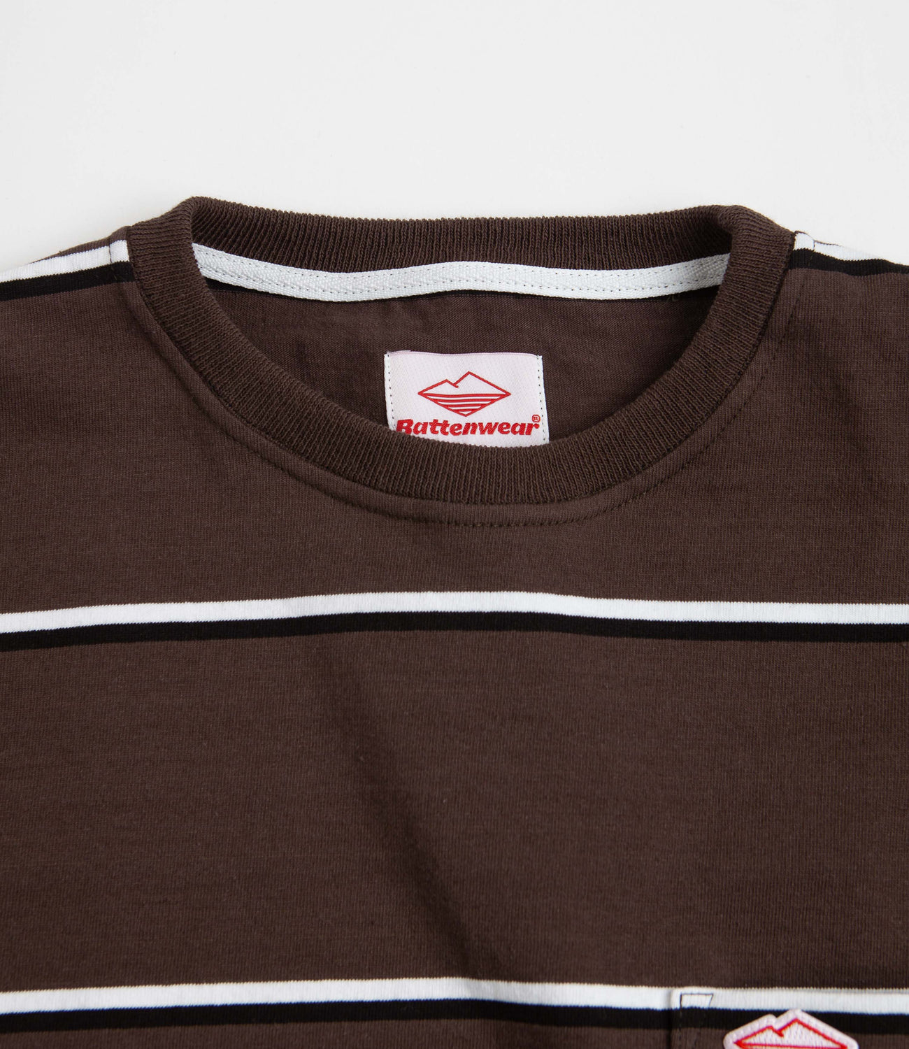 Battenwear Pocket Rugby T-Shirt in Olive Stripe. Vintage inspired and tailored to a boxy fitting, this striped Battenwear t-shirt is crafted from 100% cotton. Featuring a twill tape rib knit collar, dropped shoulders and a straight cut hem, this olive stripe Battenwear t-shirt is finished with a single left chest pocket and embroidered brand patch detailing.