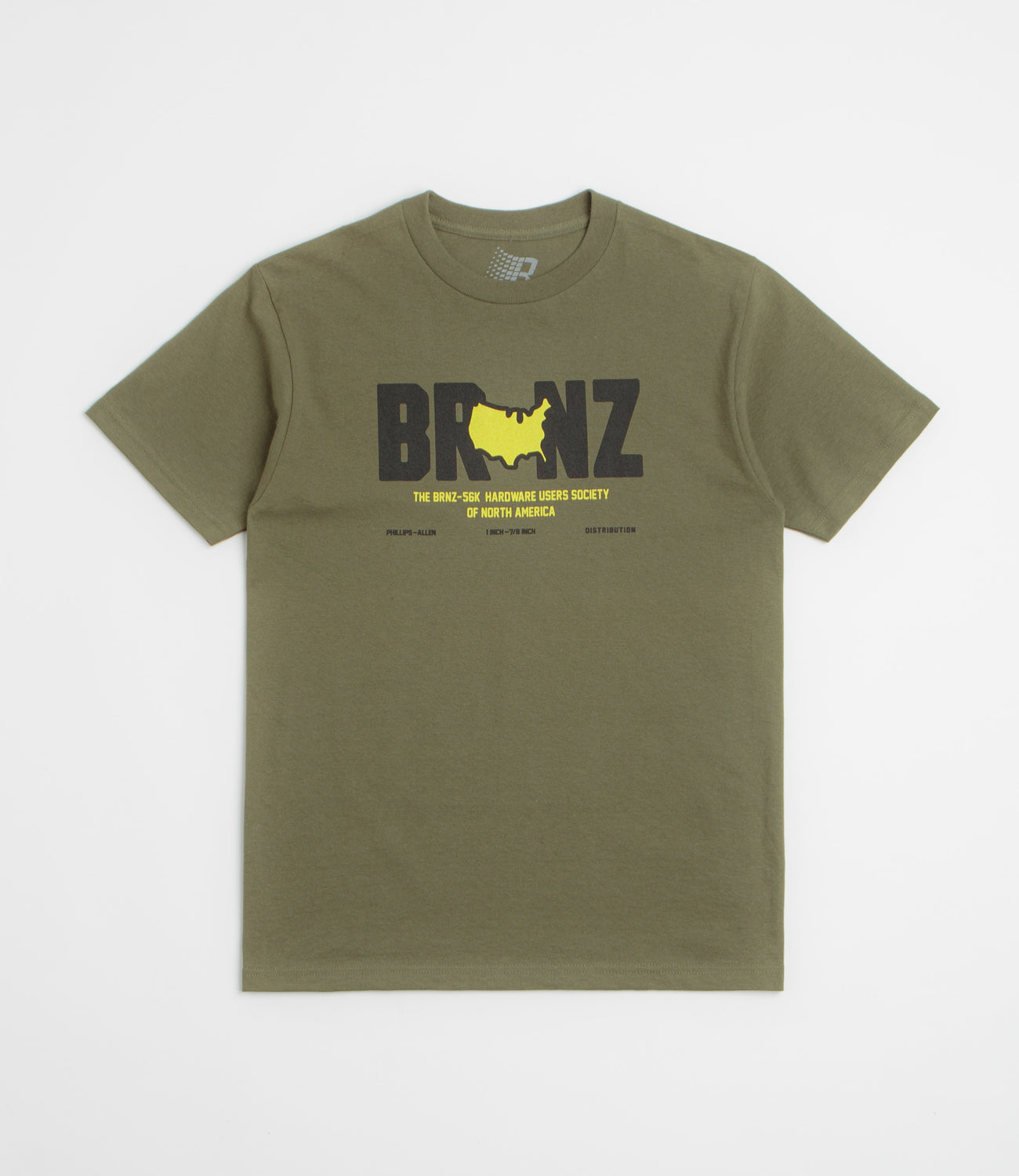 Bronze 56K Brnz T-Shirt in Military Green. Made from 100% cotton, this block tone Bronze 56K t-shirt is designed with a classic crew collar and a straight hem. Finished in green with a printed centre chest graphic.