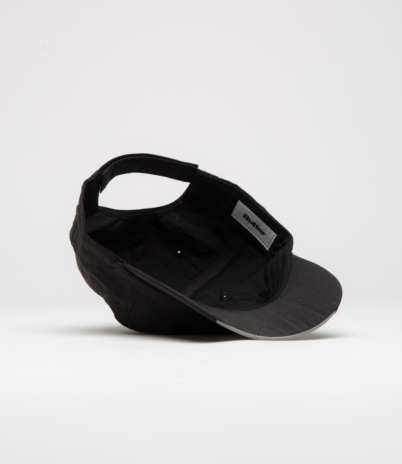 Butter Goods Alpine Tech Cap in Black. Made from 100% nylon, this six panel Butter Goods cap is designed with a curved peak and contrast details. Finished in black with an adjustable rear fastening and embroidered branding.
