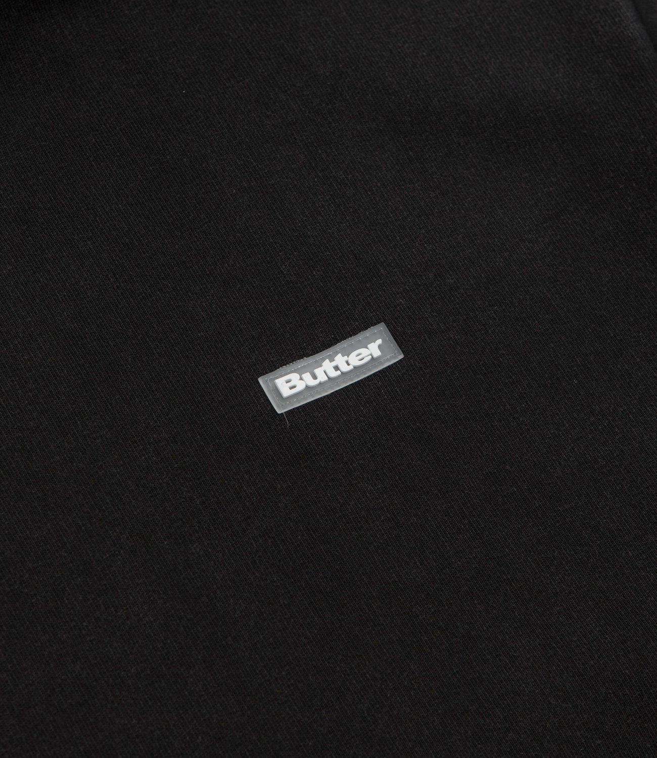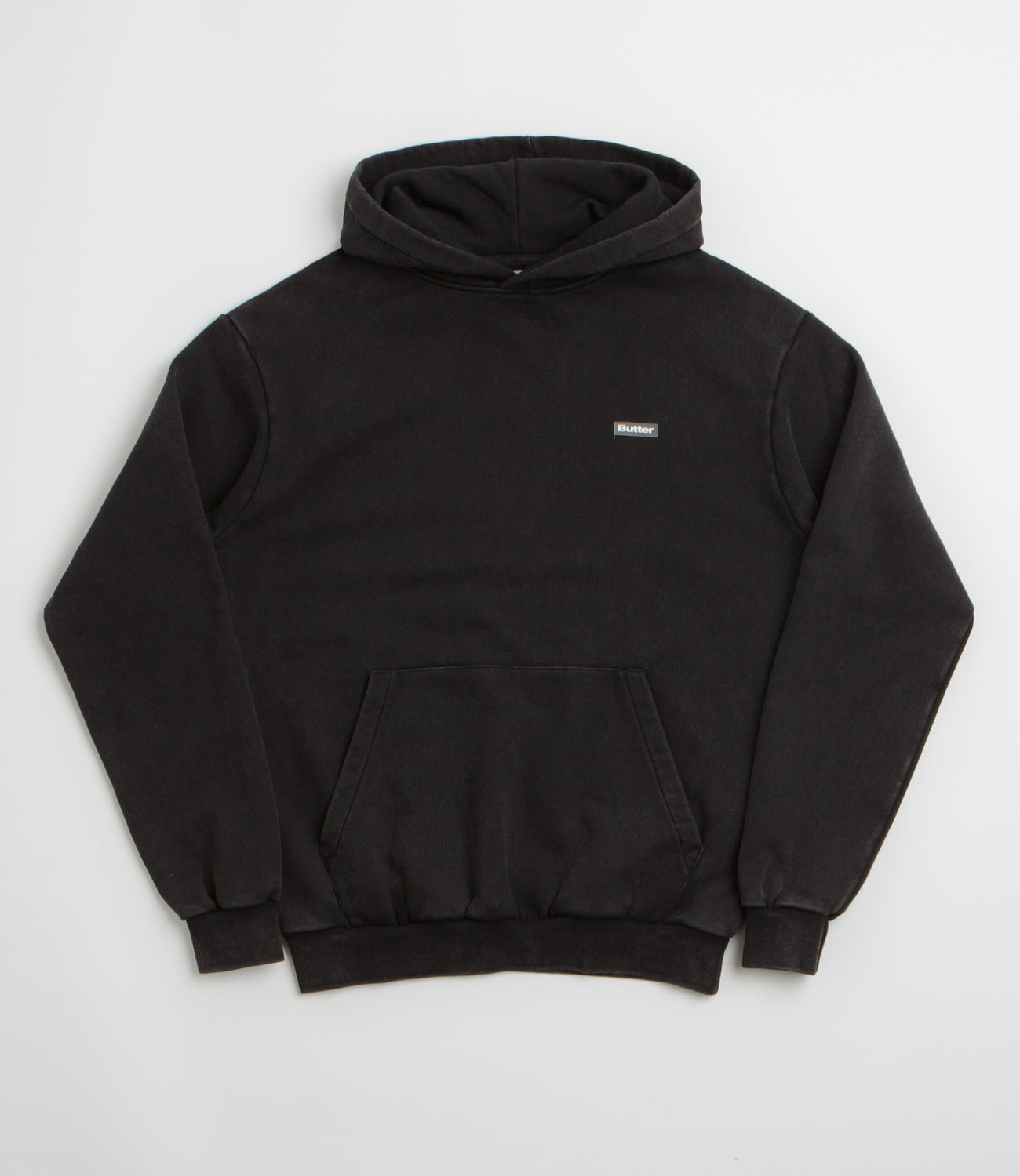 Butter Goods Basic Hoodie in Washed Black. Made from a heavyweight cotton-polyester fleece blend, this block tone Butter Goods hoodie is designed with a mineral wash and a split panel hood. Finished in black with a kangaroo front pocket, ribbed cuffs, a rubber chest logo and embroidered sleeve detailing.