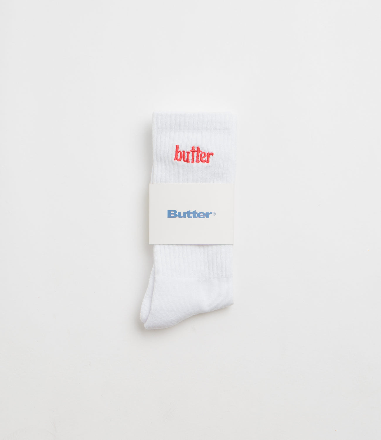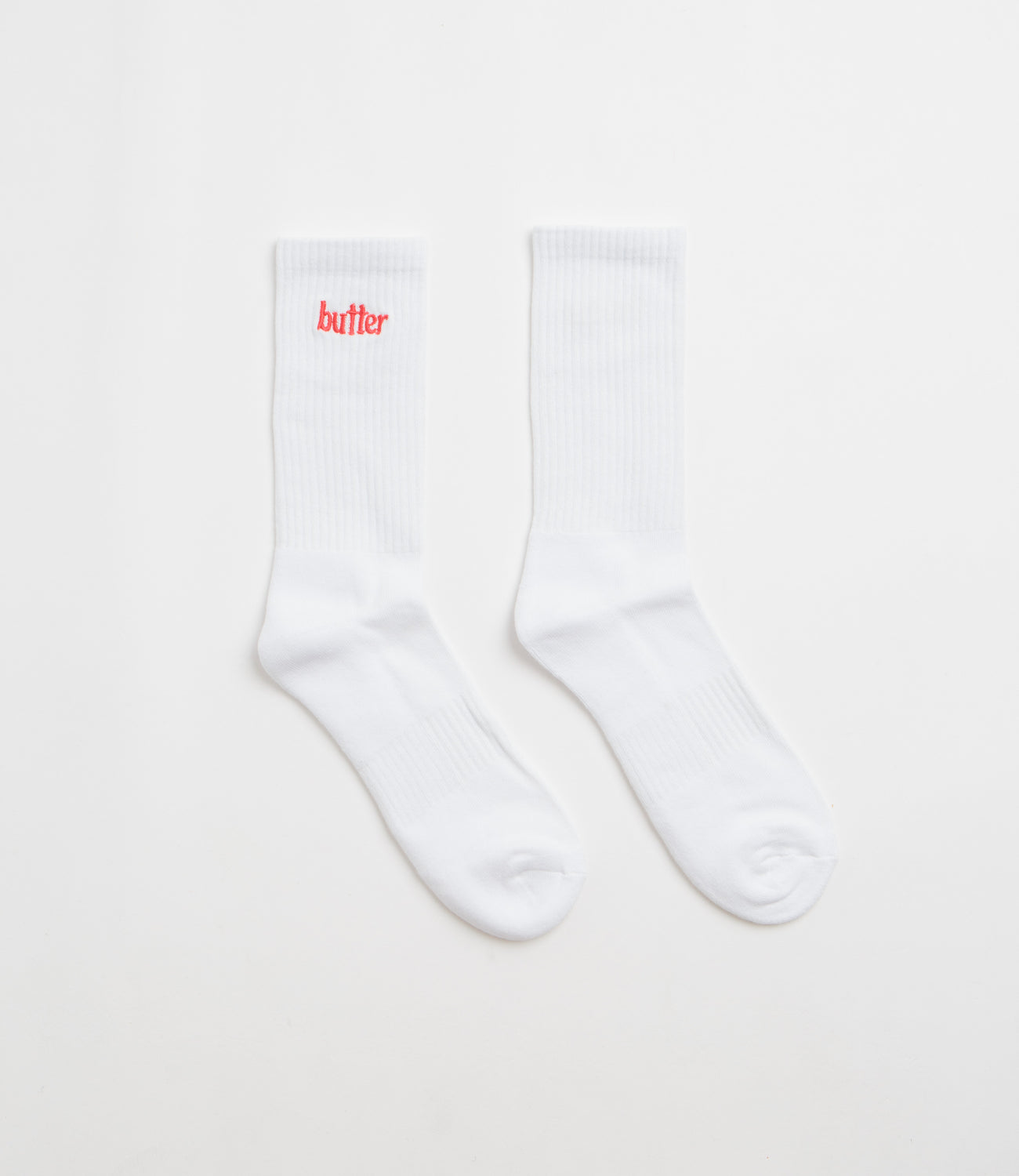 Butter Goods Basic Socks in White. Cut to crew length, these Butter Goods socks are made from 100% acrylic. Finished in white with ribbed cuffs, tonal stitched seams and embroidered branding.