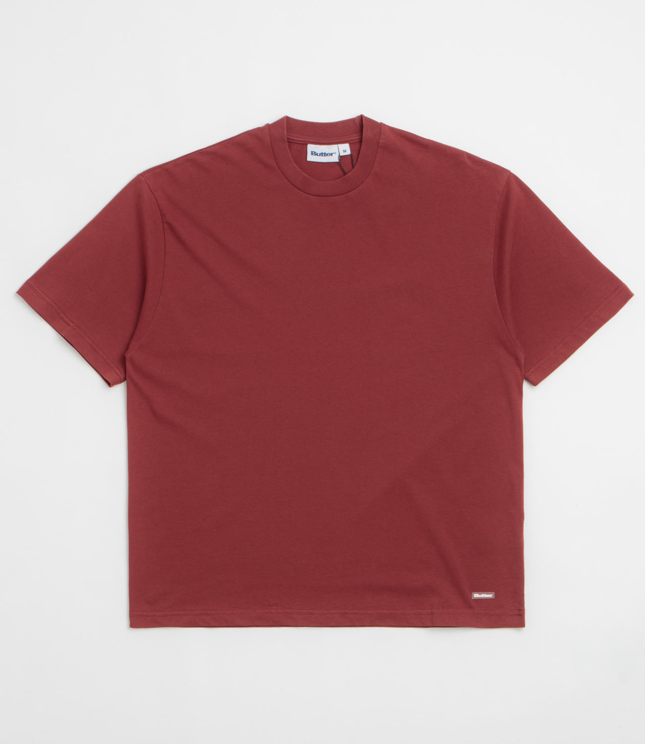 Butter Goods Basic T-Shirt in Washed Russet. Regular fitting, this block tone Butter Goods t-shirt is made from 100% cotton. Featuring a mineral wash, a rib knit collar and a straight hem, this washed red Butter Goods t-shirt is finished with a rubber patch logo.
