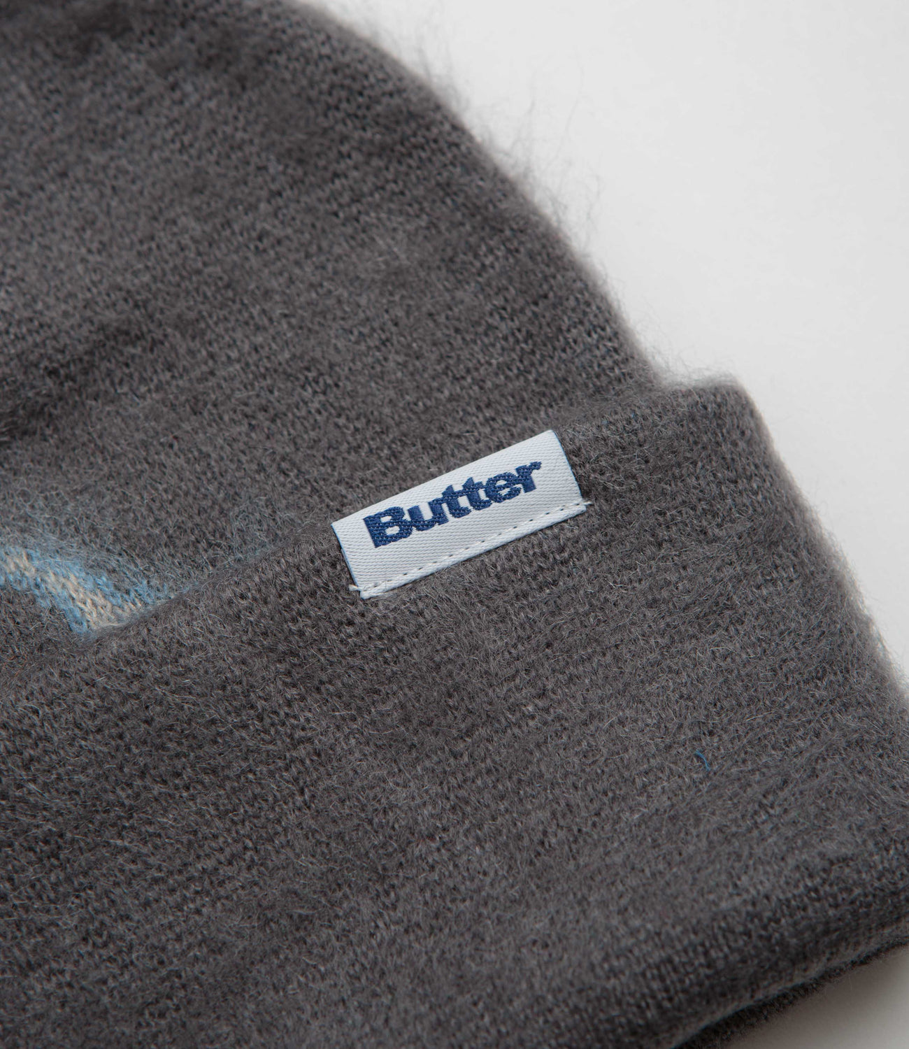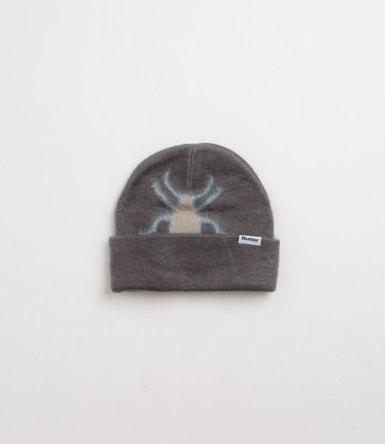 Butter Goods Beetle Mohair Beanie in Charcoal. Single sized and made from 100% brushed mohair, this Butter Goods beanie is designed with a regular cut and a jacquard graphic. Finished in grey with a fold-over cuff and woven flag label branding.