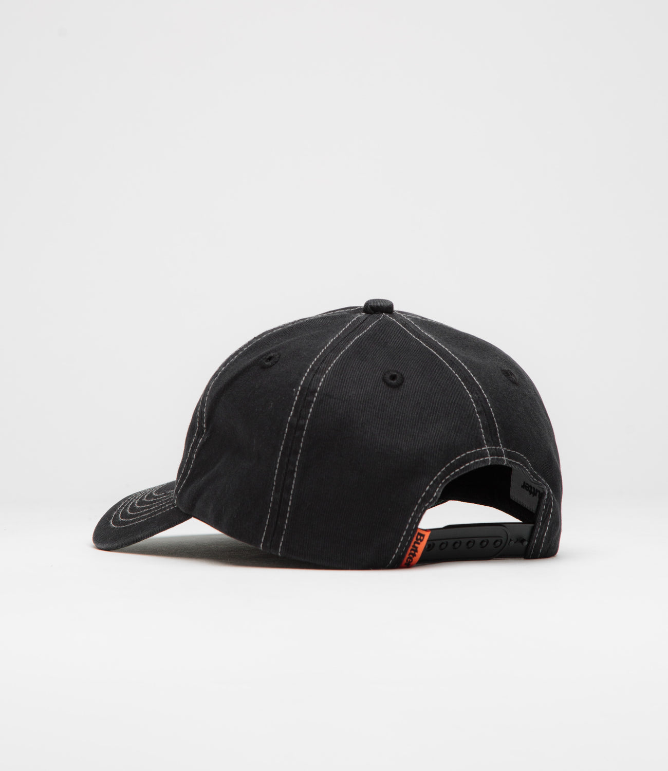 Butter Goods Blotch Cap in Black. Single sized, this Butter Goods cap is designed with a five panel profile and a curved peak. Featuring embroidered eyelets and an adjustable snapback fastening, this black Butter Goods cap is finished with a woven flag label and embroidered branding.