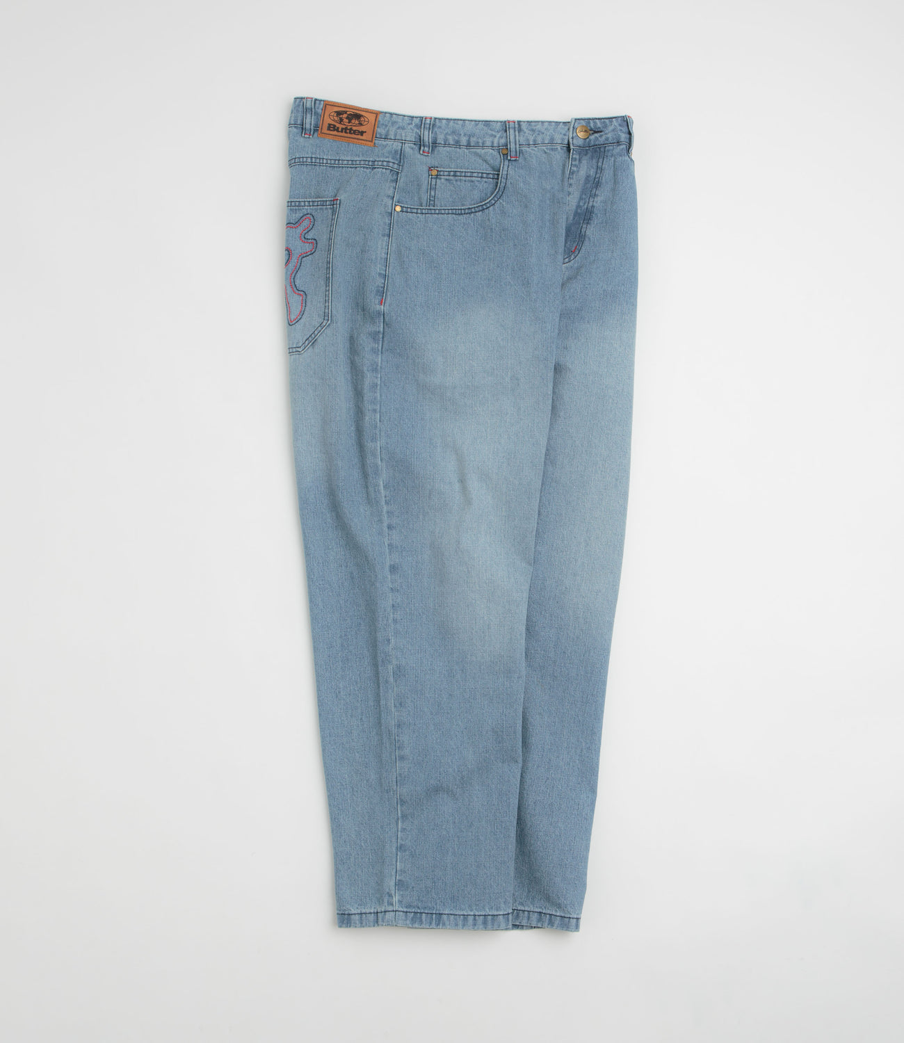 Butter Goods Blotch Jeans in Streaky Blue. Baggy fitting with blotched details, these Butter Goods jeans are made from 100% cotton denim. Featuring a belt loop waistband and a zippered fly, these streaky blue Butter Goods jeans are finished with two side pockets, two rear pockets, a single coin pocket and embroidered rear graphics.