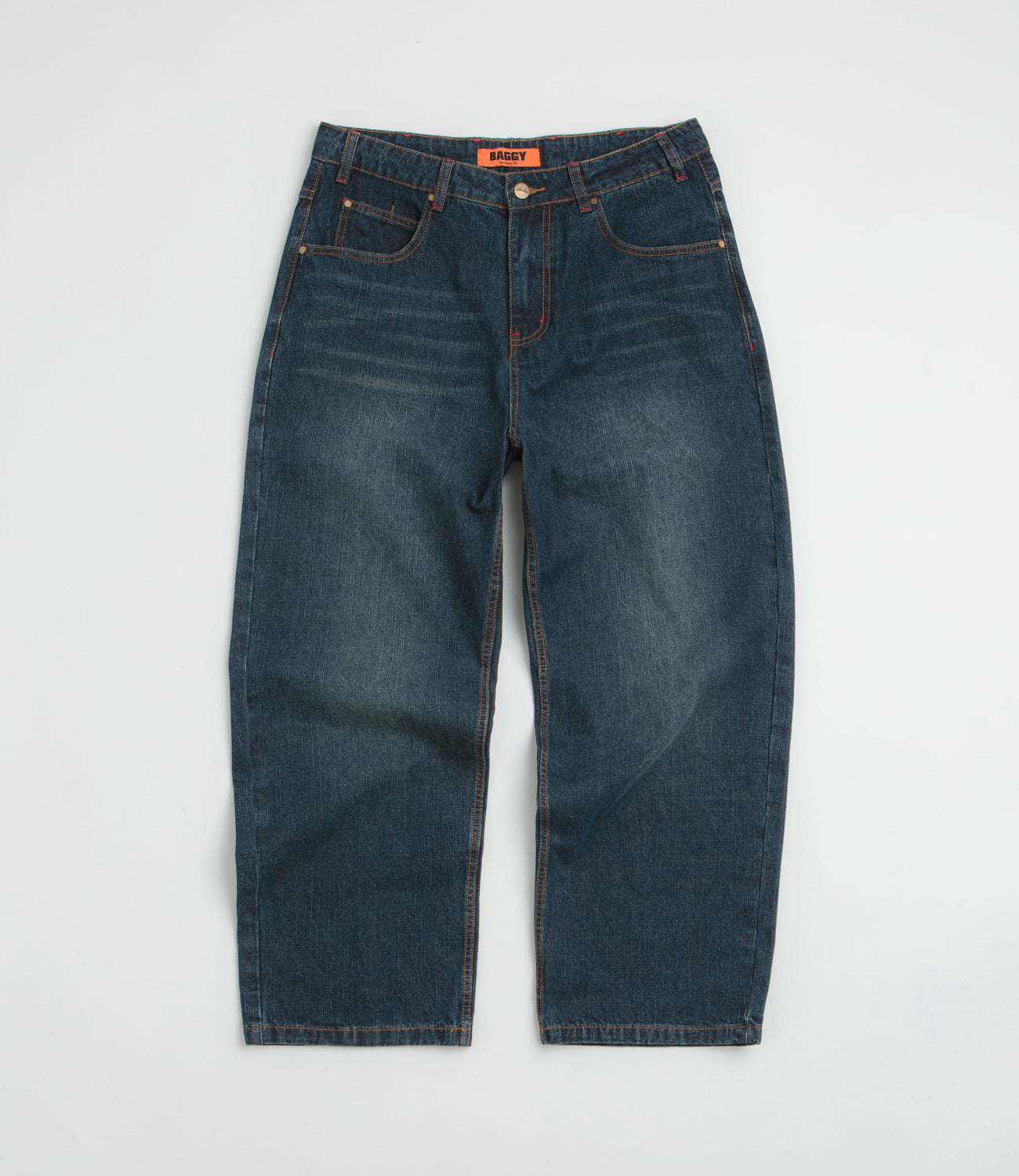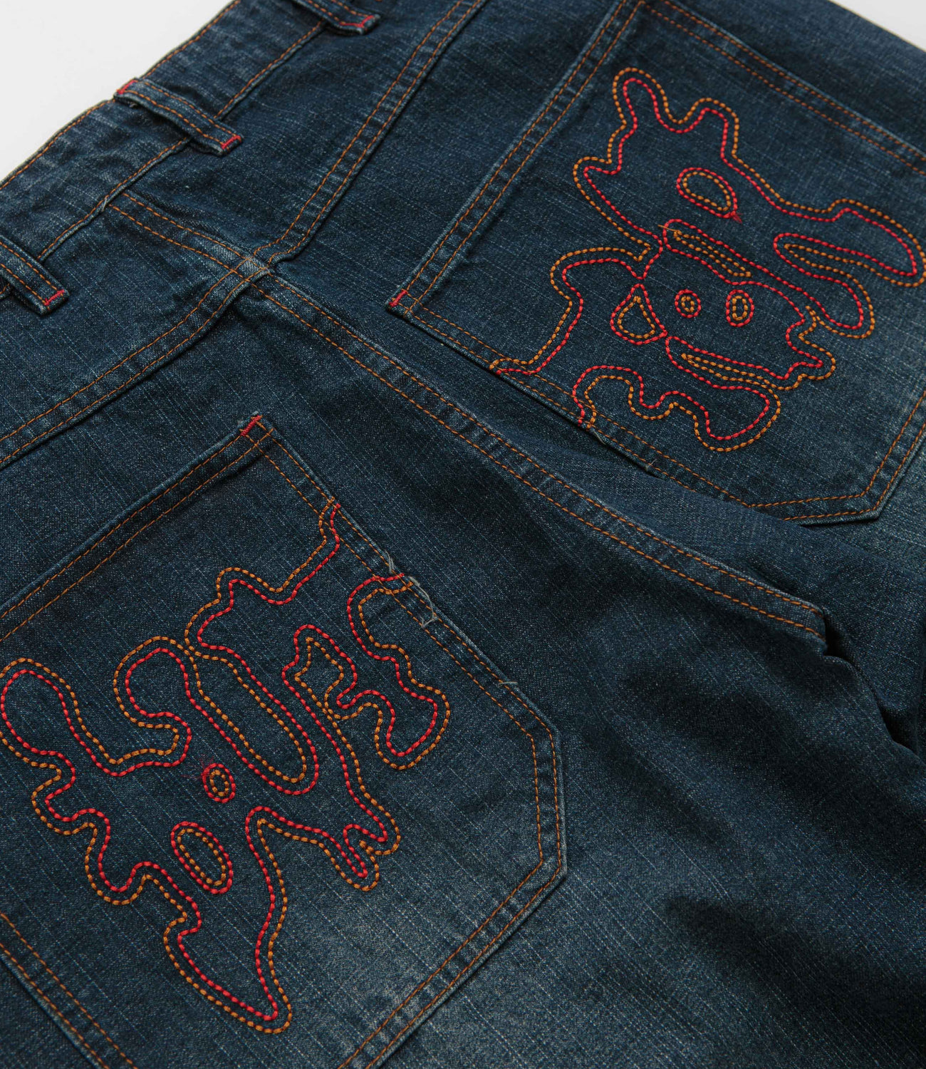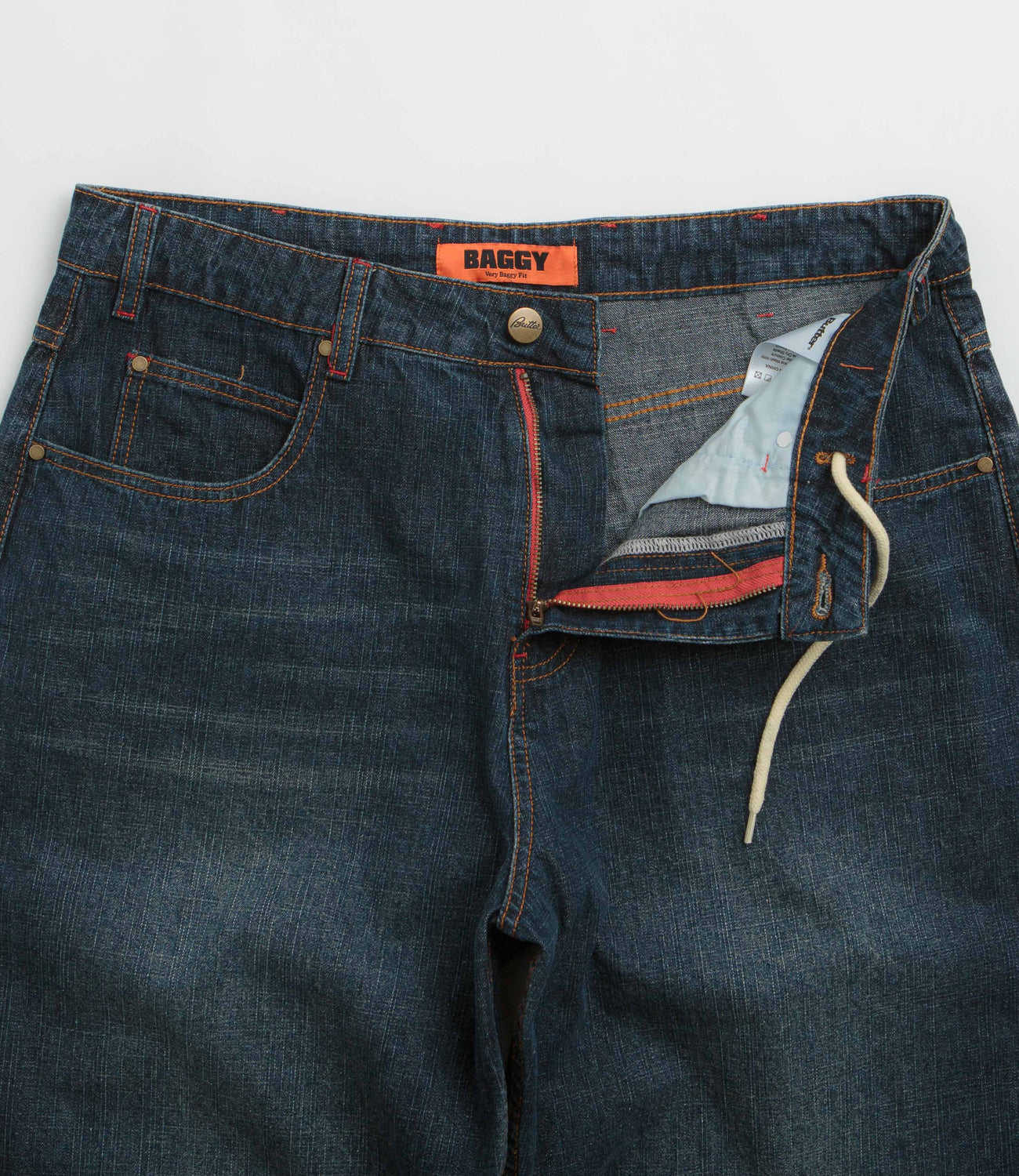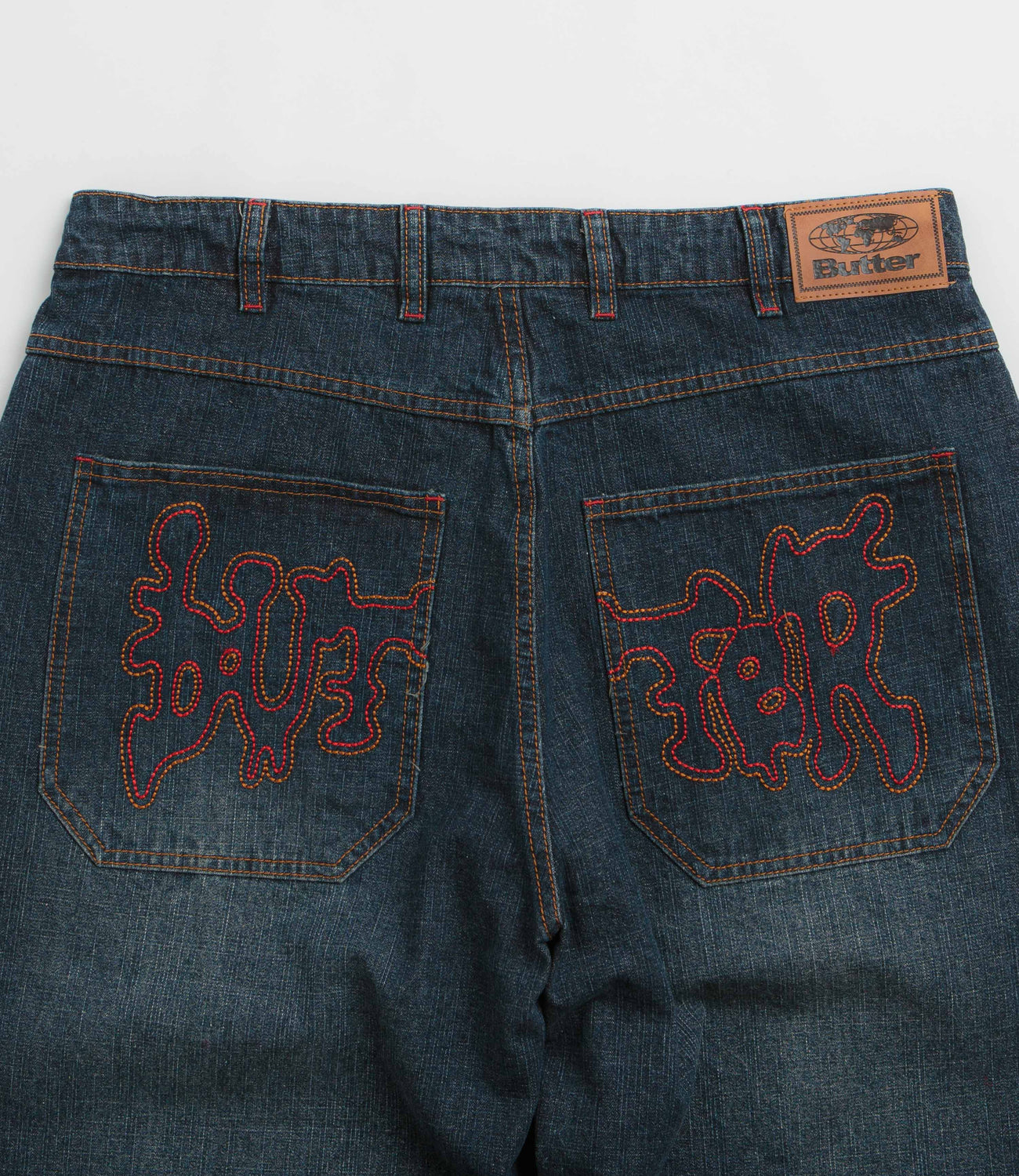 Butter Goods Blotch Jeans in Streaky Navy. Made from 100% cotton denim with a baggy fit, these Butter Goods jeans are designed with a belt loop waistband and a zippered fly. Finished in navy with streaky detailing, four pockets, a single coin pocket and embroidered rear graphics.