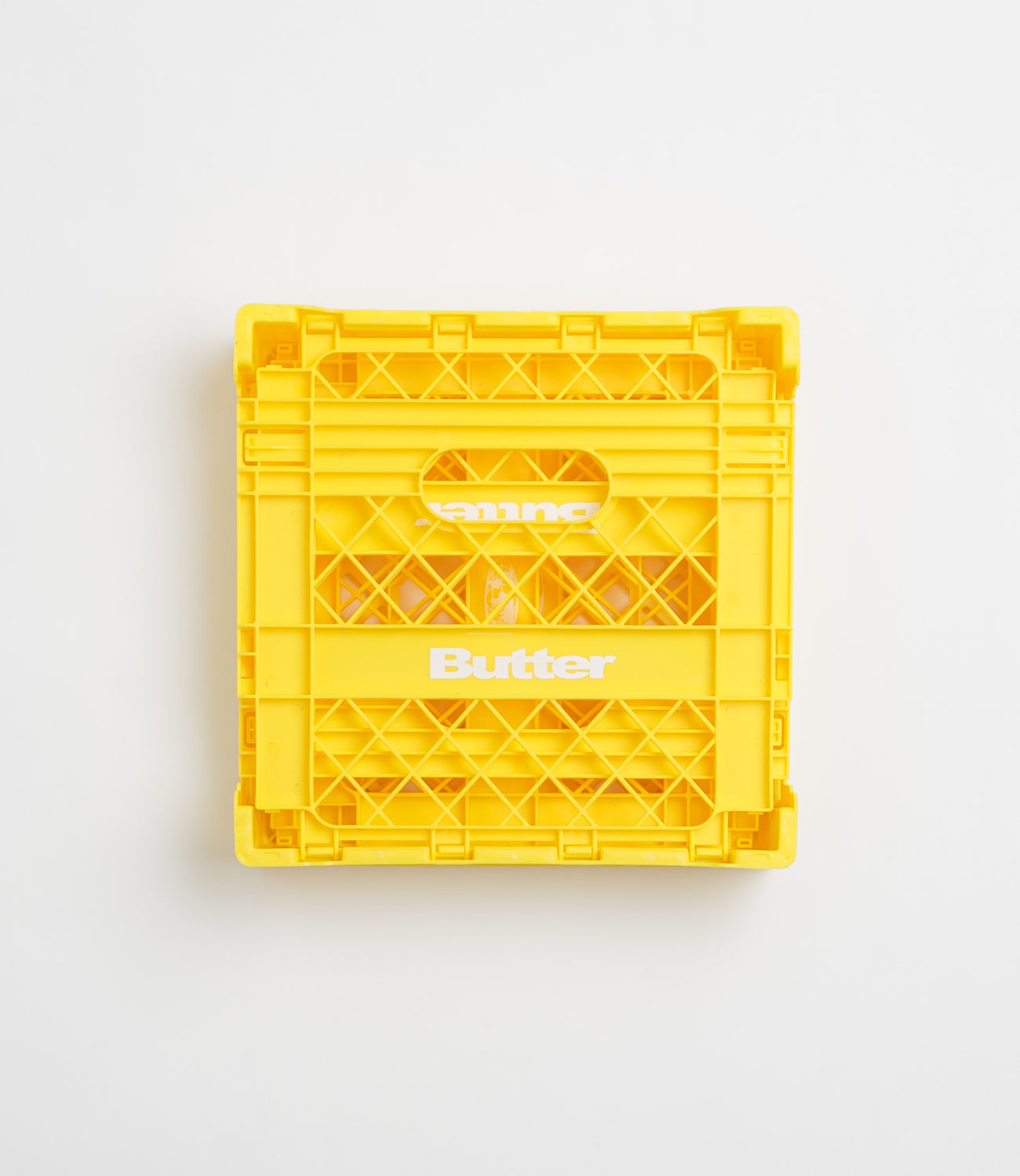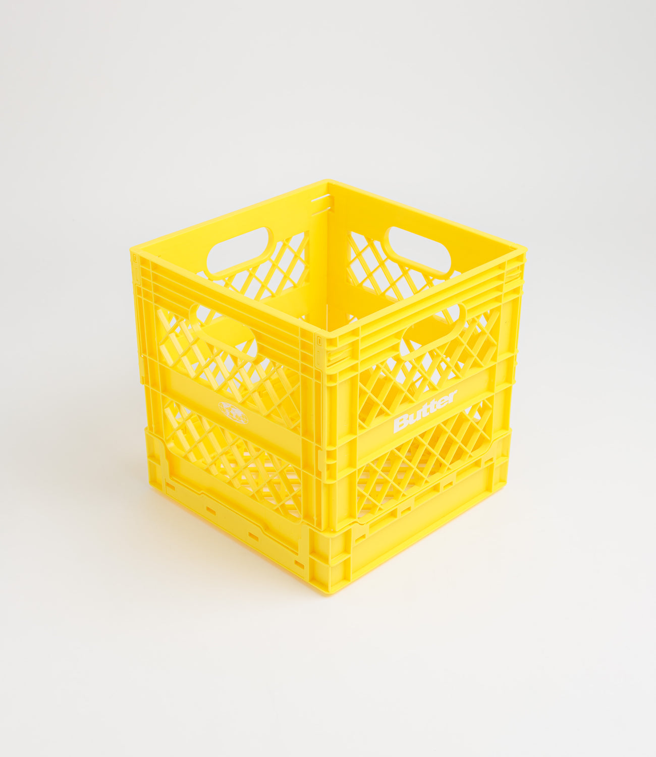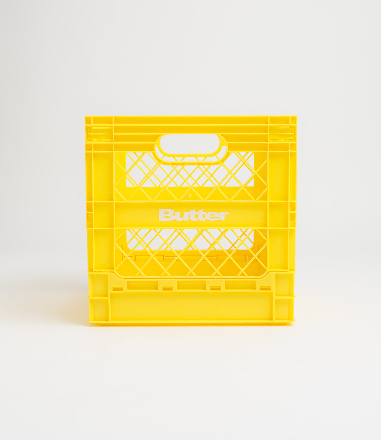 Butter Goods Collapsable Record Crate in Yellow. Collapsible and made from 100% recycled plastic, this Butter Goods crate is designed with screen printed logos. Ideal for home, work and travel use, this yellow crate is finished in a size of 35.5cm by 35.5cm.