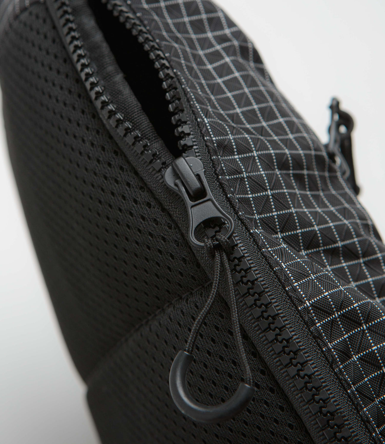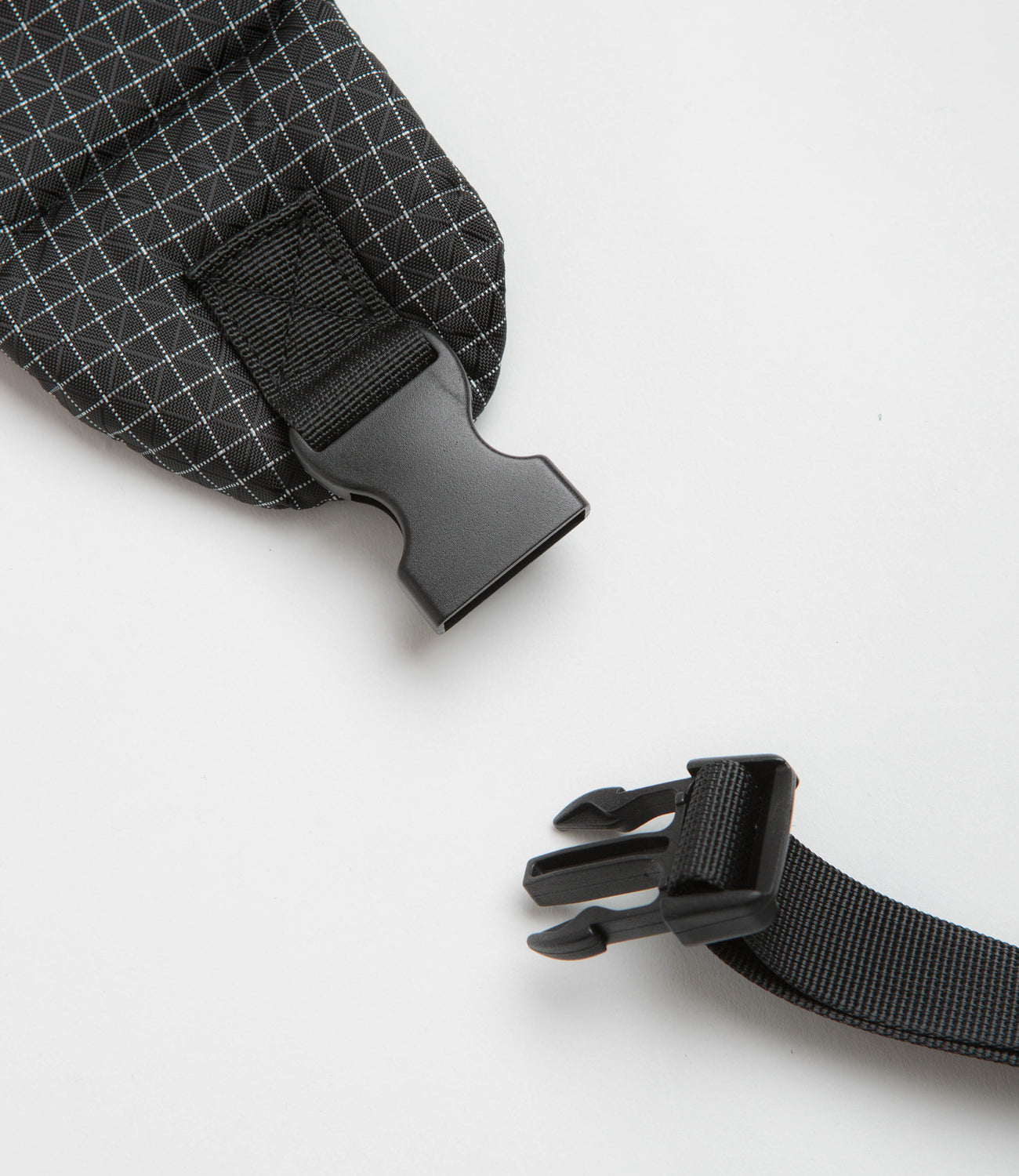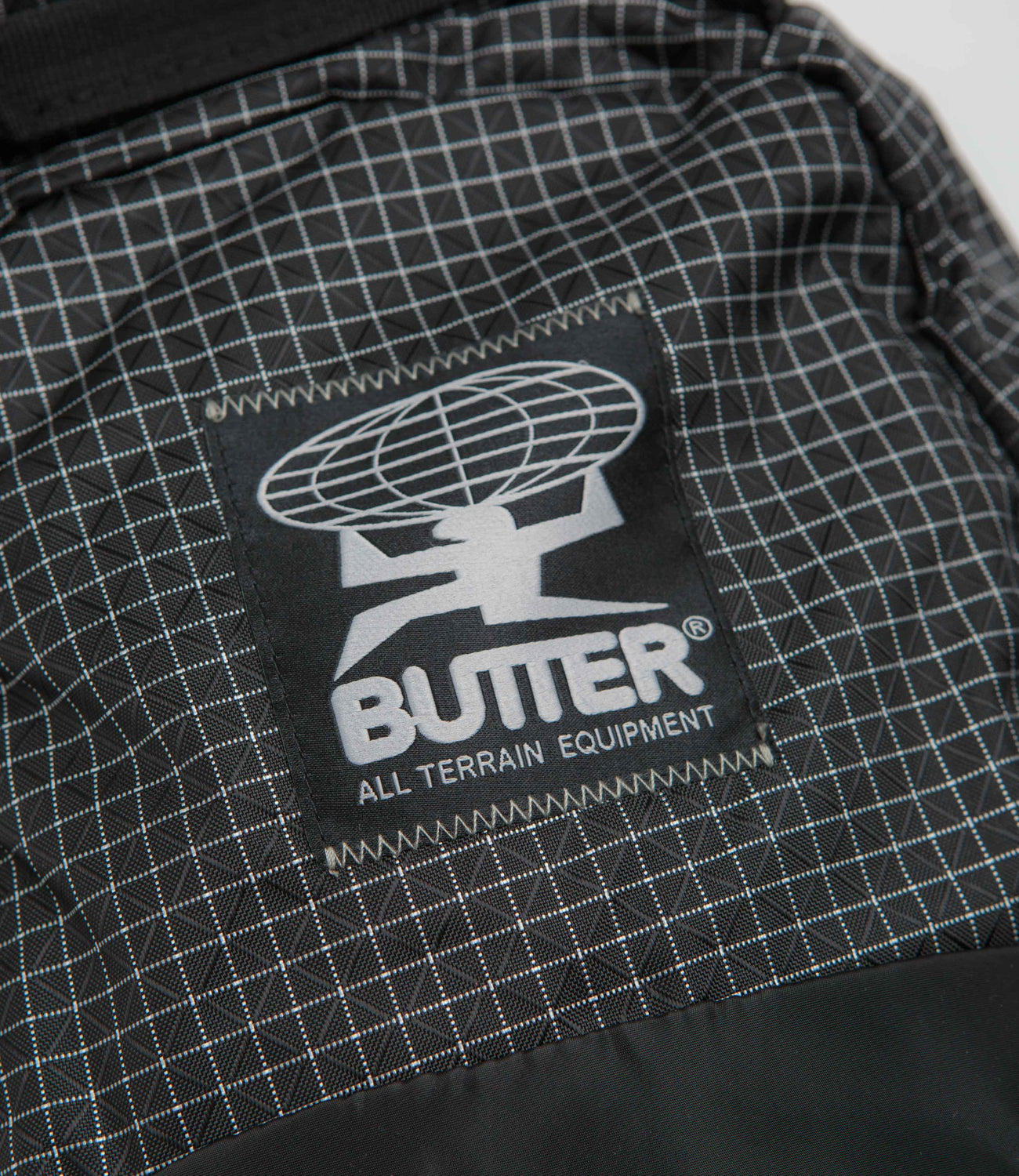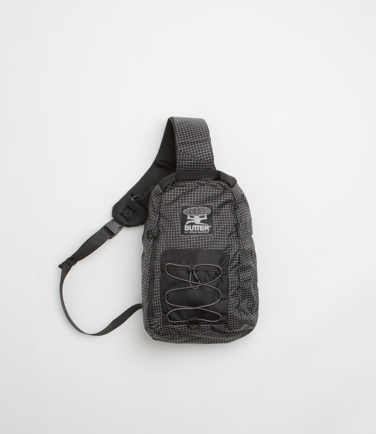 Butter Goods Cordura Express Shoulder Bag in Black. Single sized with a capacity of up to 15 litres, this Butter Goods shoulder bag is made from 100% Cordura nylon ripstop with external bungee-cord webbing. Featuring an adjustable shoulder strap, a D-ring attachment, a mesh front pocket and a top zip opening, this black Butter Goods bag is finished with woven flag label branding.