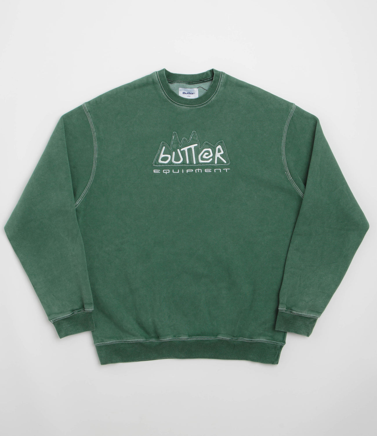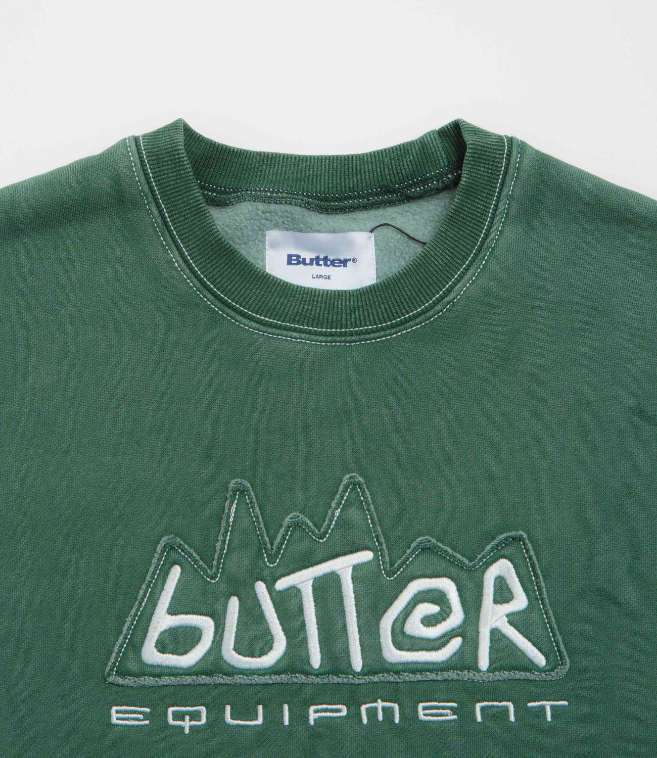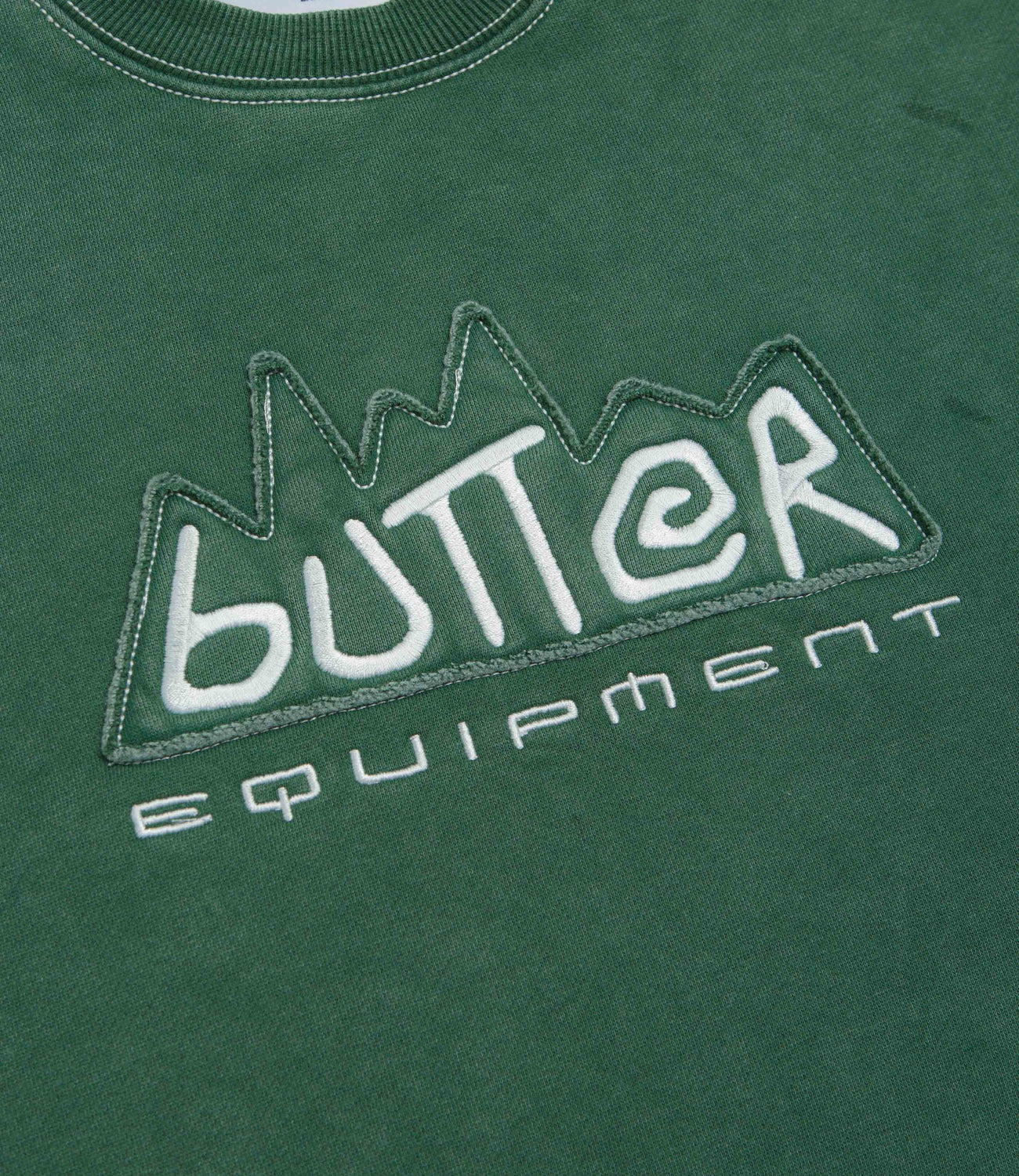 Butter Goods Equipment Applique Crewneck Sweatshirt in Washed Fern. Regular fitting and made from a cotton-polyester blend, this mineral washed Butter Goods sweatshirt is designed with contrast stitching and a rib knit collar. Finished in green with ribbed cuffs, a woven elastic hem and an embroidered applique chest graphic.