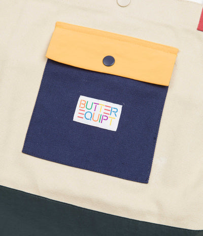Butter Goods Equipt Tote Bag in Natural. A vintage inspired storage accessory from the brand’s latest SS22 release, this multicoloured Butter Goods tote is crafted from 100% heavyweight cotton canvas and is designed to help keep valuable essentials stored with ease. Featuring a nylon panel bottom, a popper secured nylon flap pocket, an integrated internal utensil pocket and a spacious main compartment, this dual handled tote is signed off with an embroidered ‘Butter Equipt’ flag label sewn across the two tone blue and yellow front pocket for additional depth and detail.