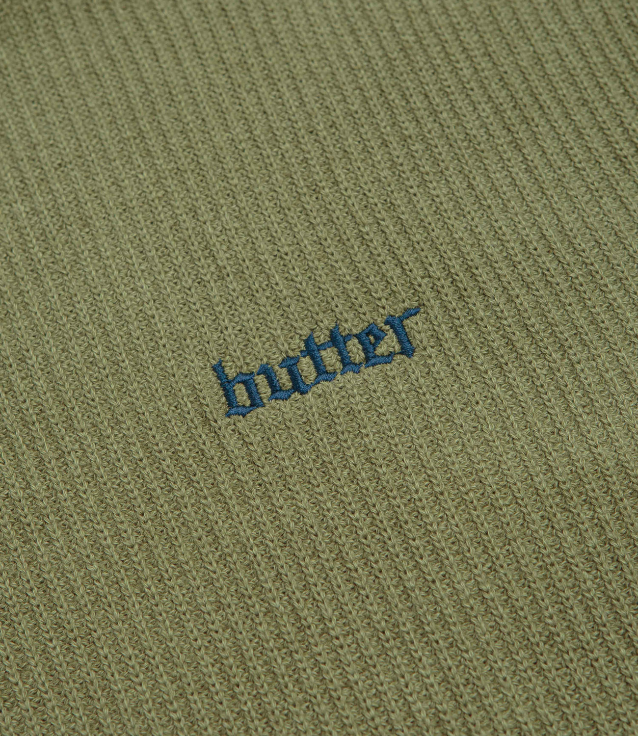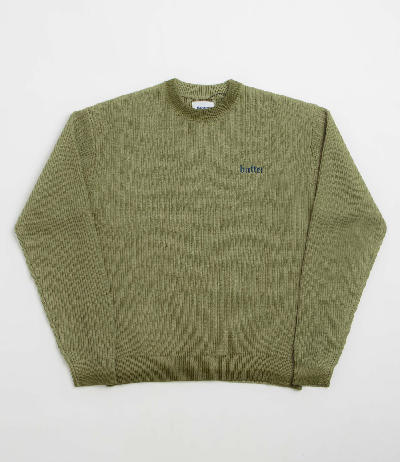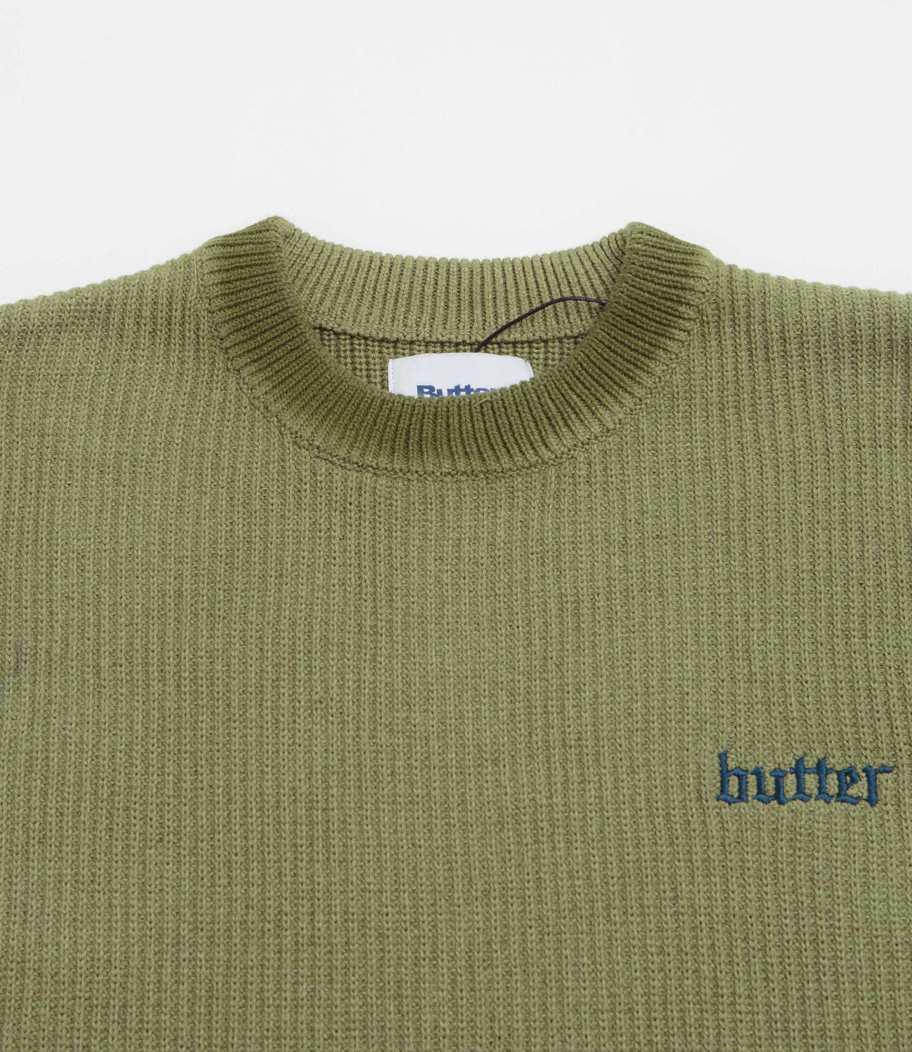 Butter Goods Fade Knit Crewneck Sweatshirt in Algae. Regular fitting, this Butter Goods sweatshirt is made from 100% cotton knit. Featuring a rib knit collar and ribbed cuffs with spray fade details, this green Butter Goods sweater is finished with embroidered branding.