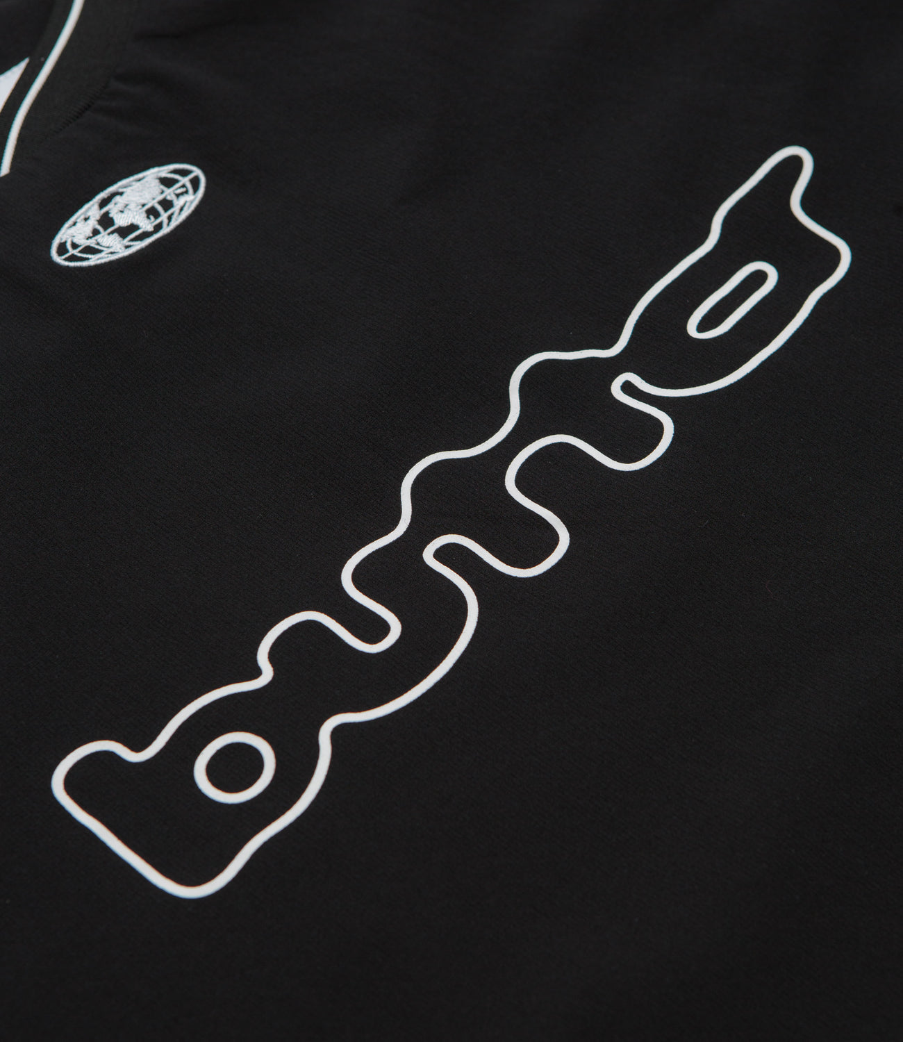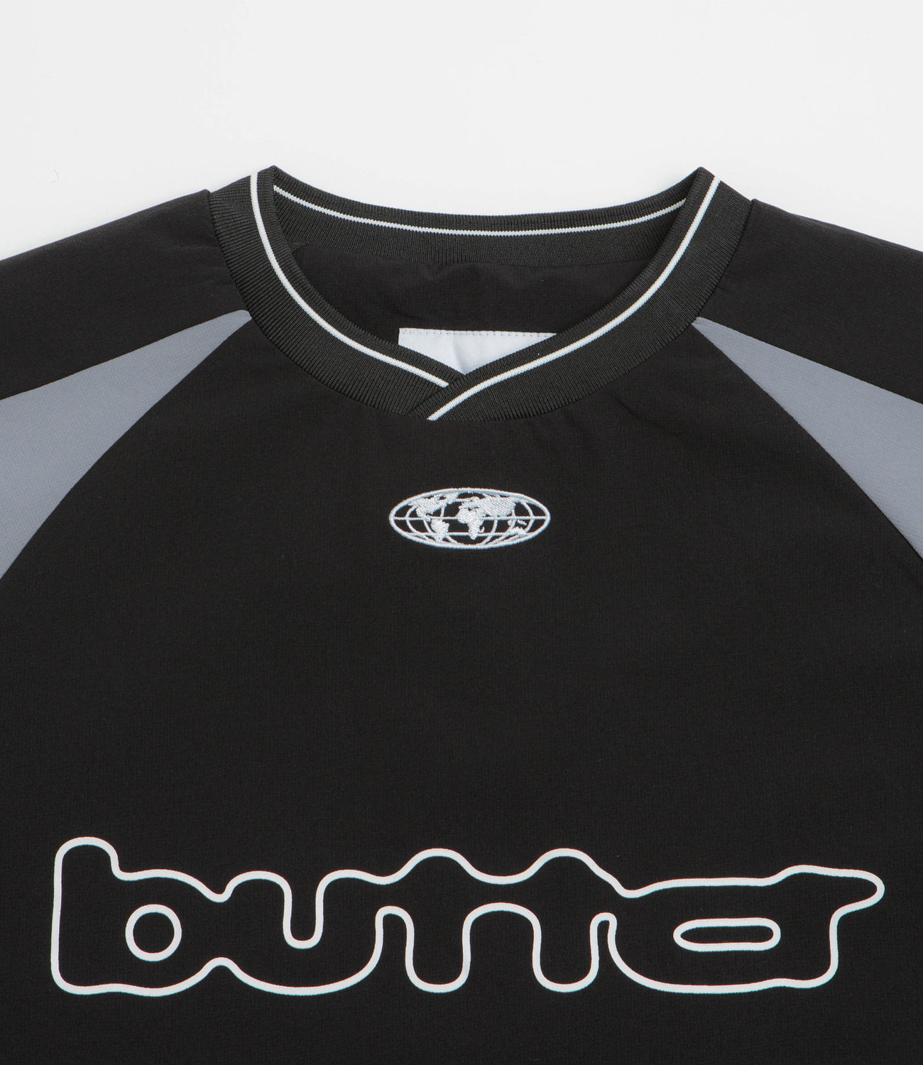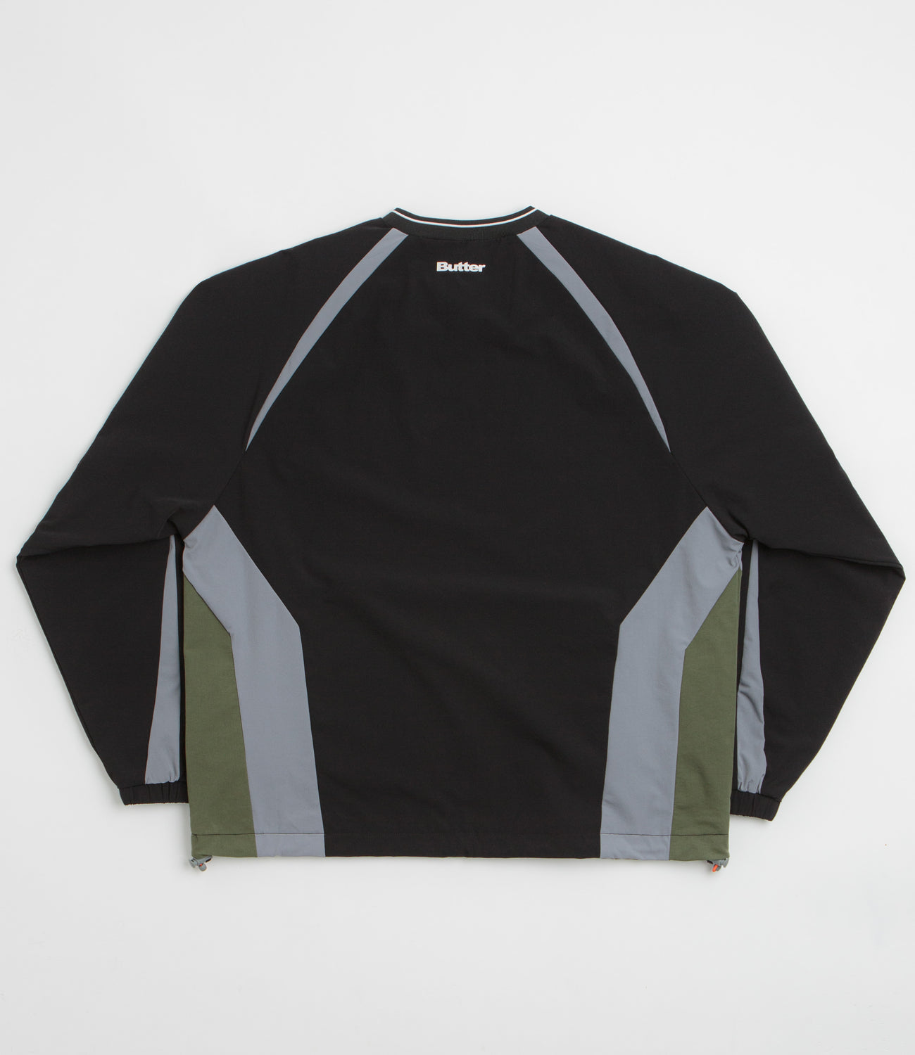 Butter Goods Finta Warmup Pullover Jacket in Black. Regular fitting, this Butter Goods jacket is made from a nylon-spandex blend. Featuring contrast panels, a ribbed V-neck collar and raglan sleeves, this black Butter Goods pullover jacket also features elasticated cuffs. Finished in black with a cinch-cord hem and a screen printed chest graphic.