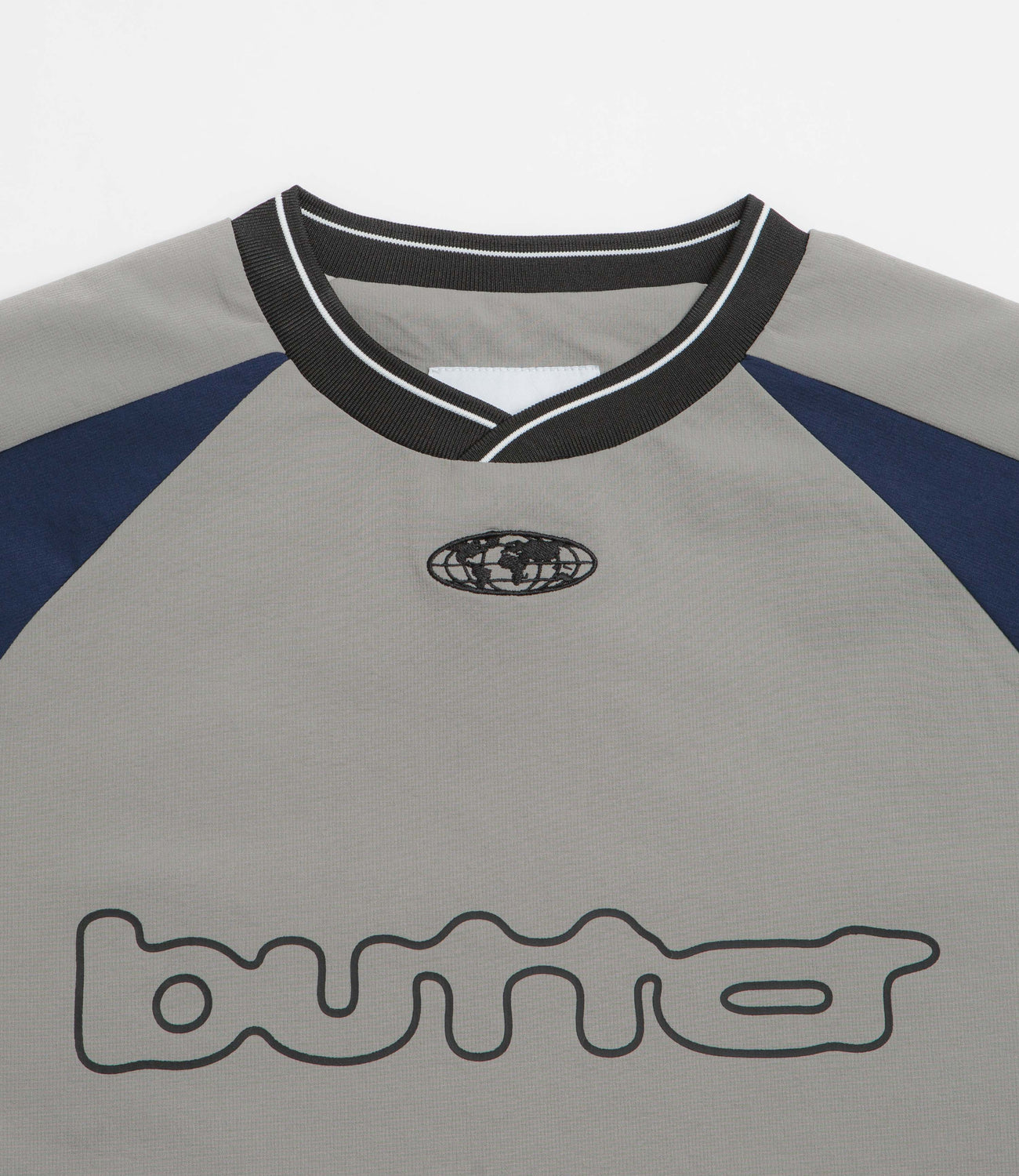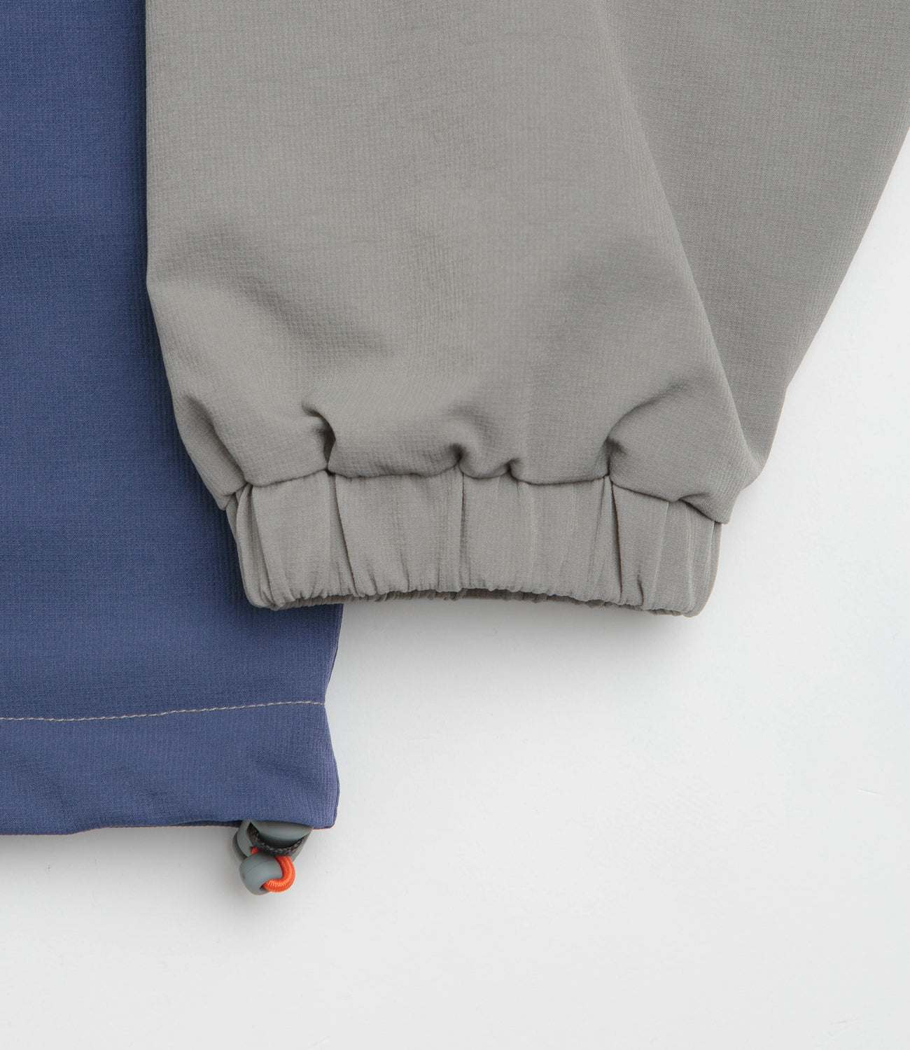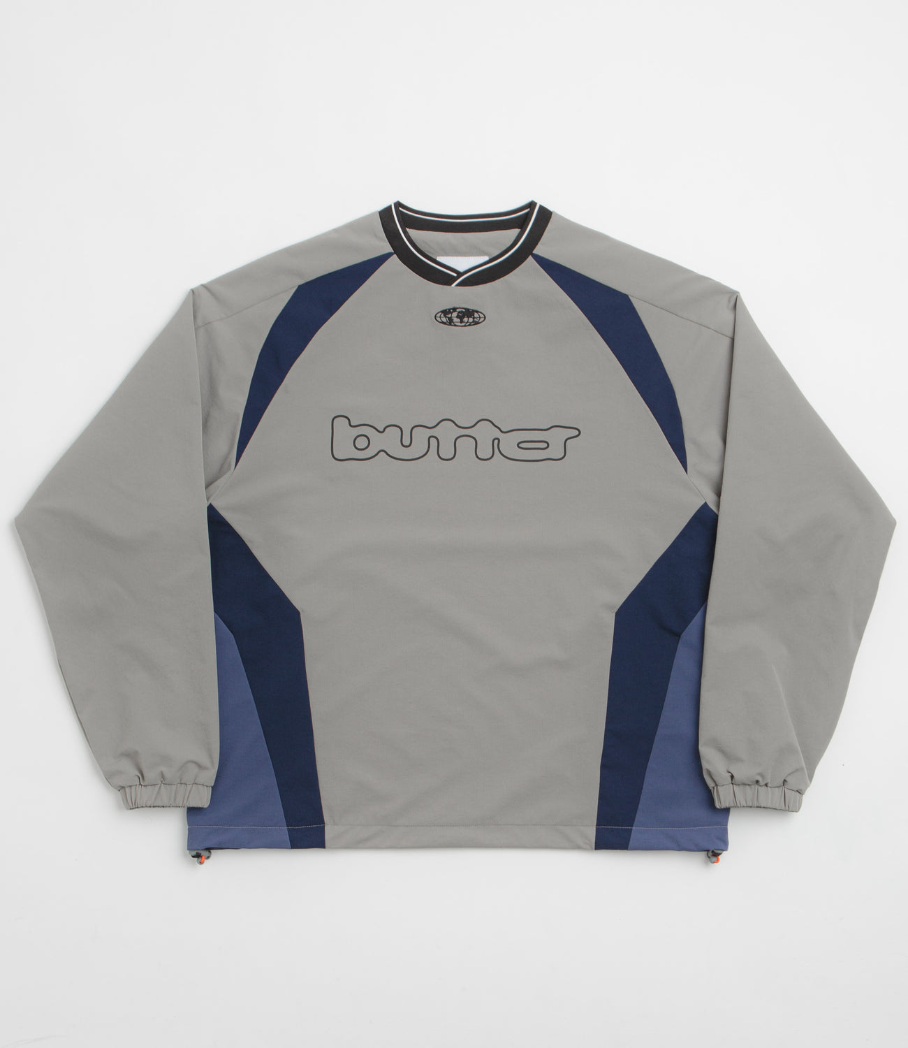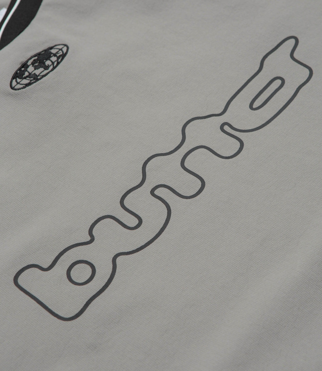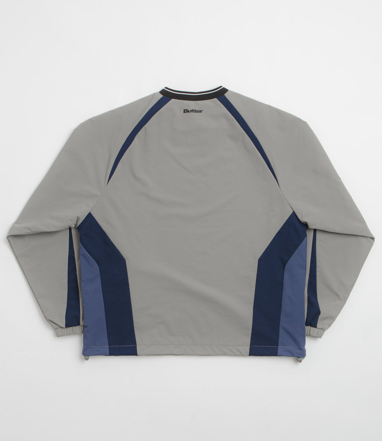 Butter Goods Finta Warmup Pullover Jacket in Grey. Made from a nylon-spandex blend with contrast panels and a ribbed V-neck collar, this grey Butter Goods jacket is designed with raglan sleeves. Finished in grey with elasticated cuffs, a cinch-cord hem, embroidered branding and a screen printed chest graphic.