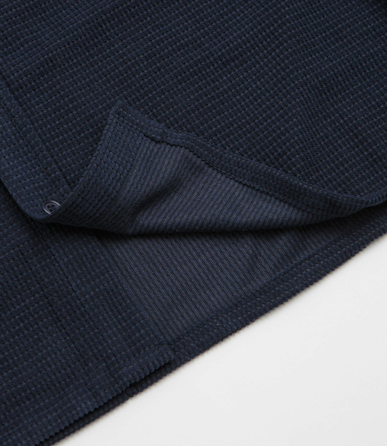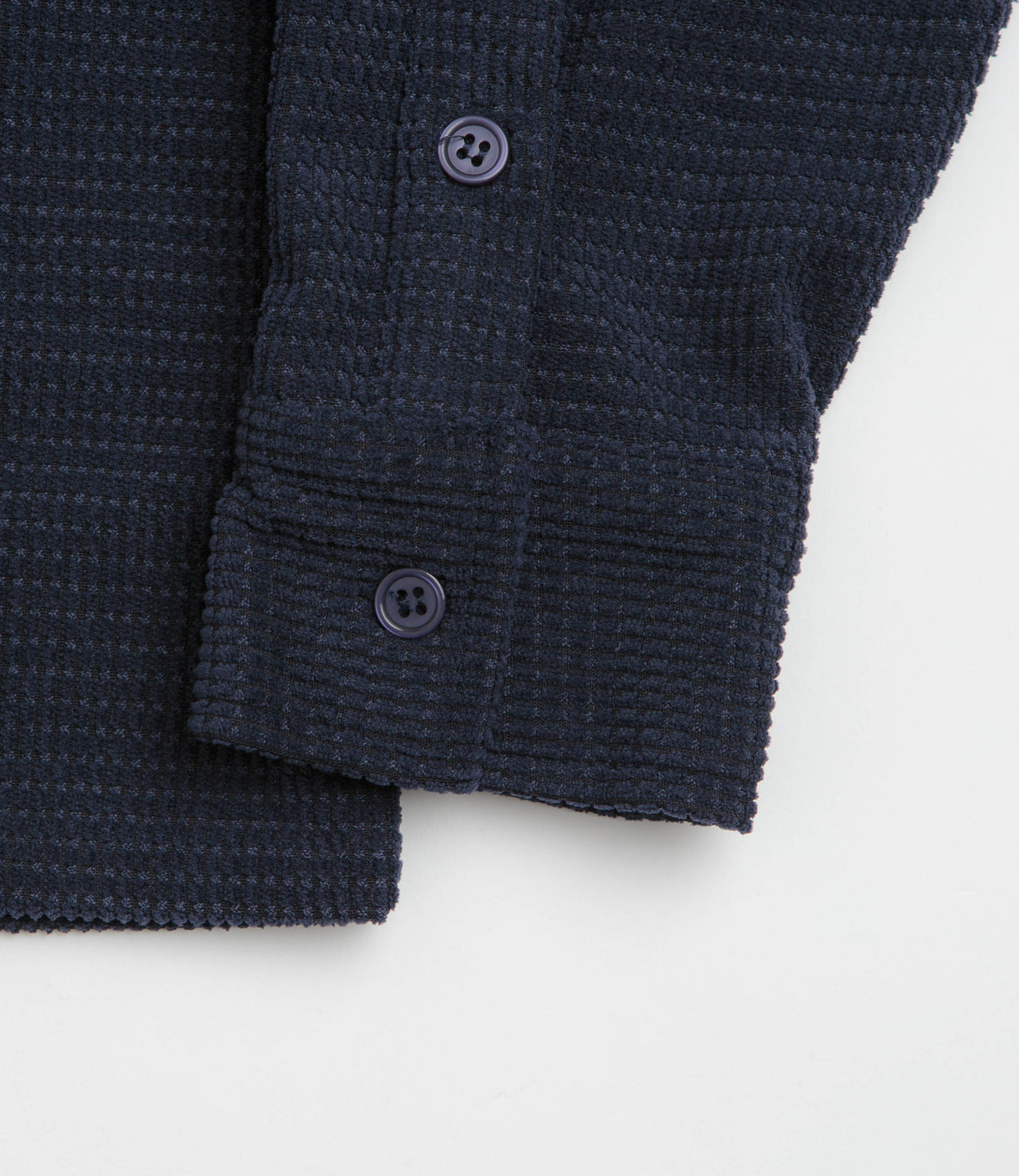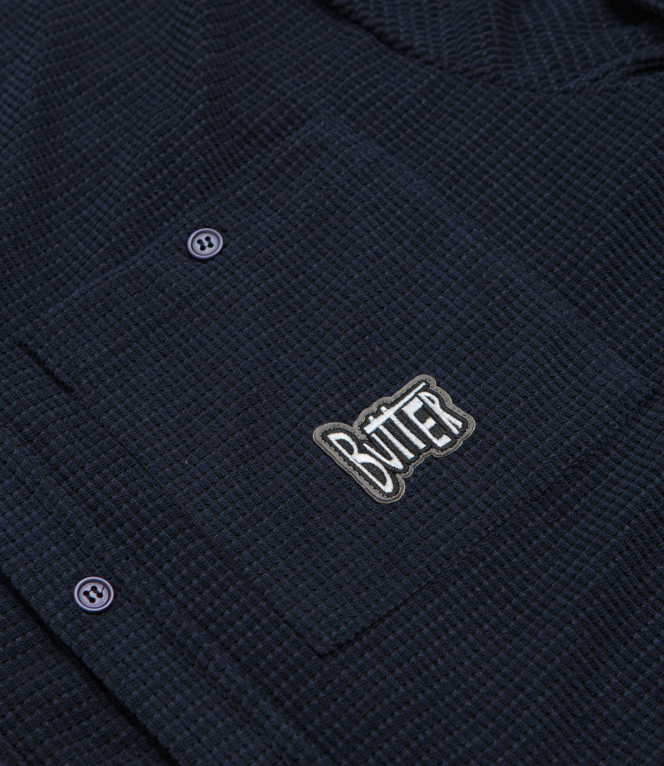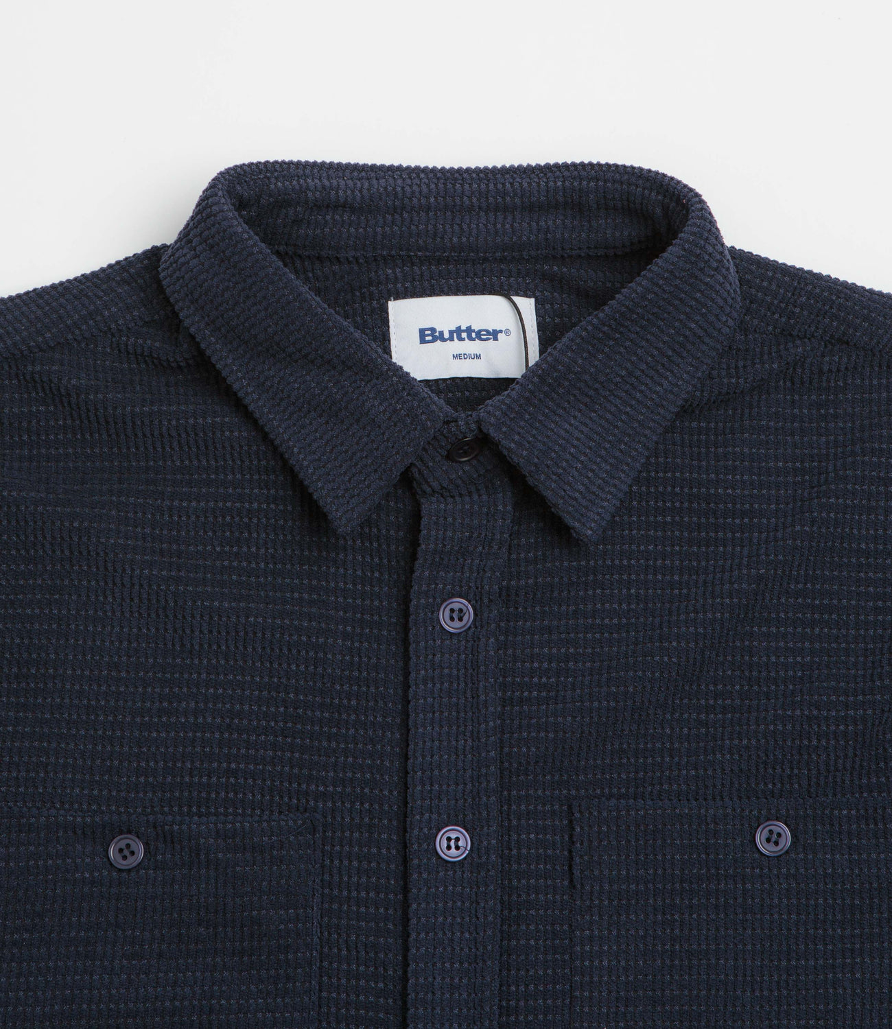 Butter Goods Grid Corduroy Overshirt in Navy. Regular fitting, this Butter Goods overshirt is made from 100% polyester corduroy with a stand collar and a full length button fastening. Finished in navy with two chest pockets, adjustable cuffs and woven patch label branding.