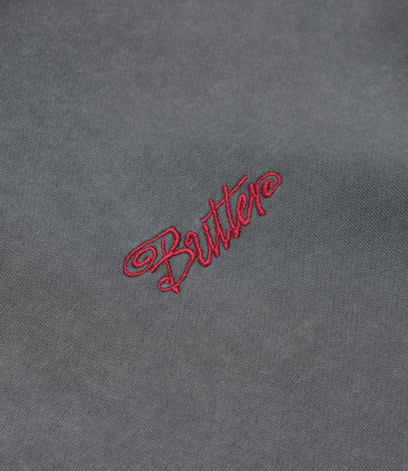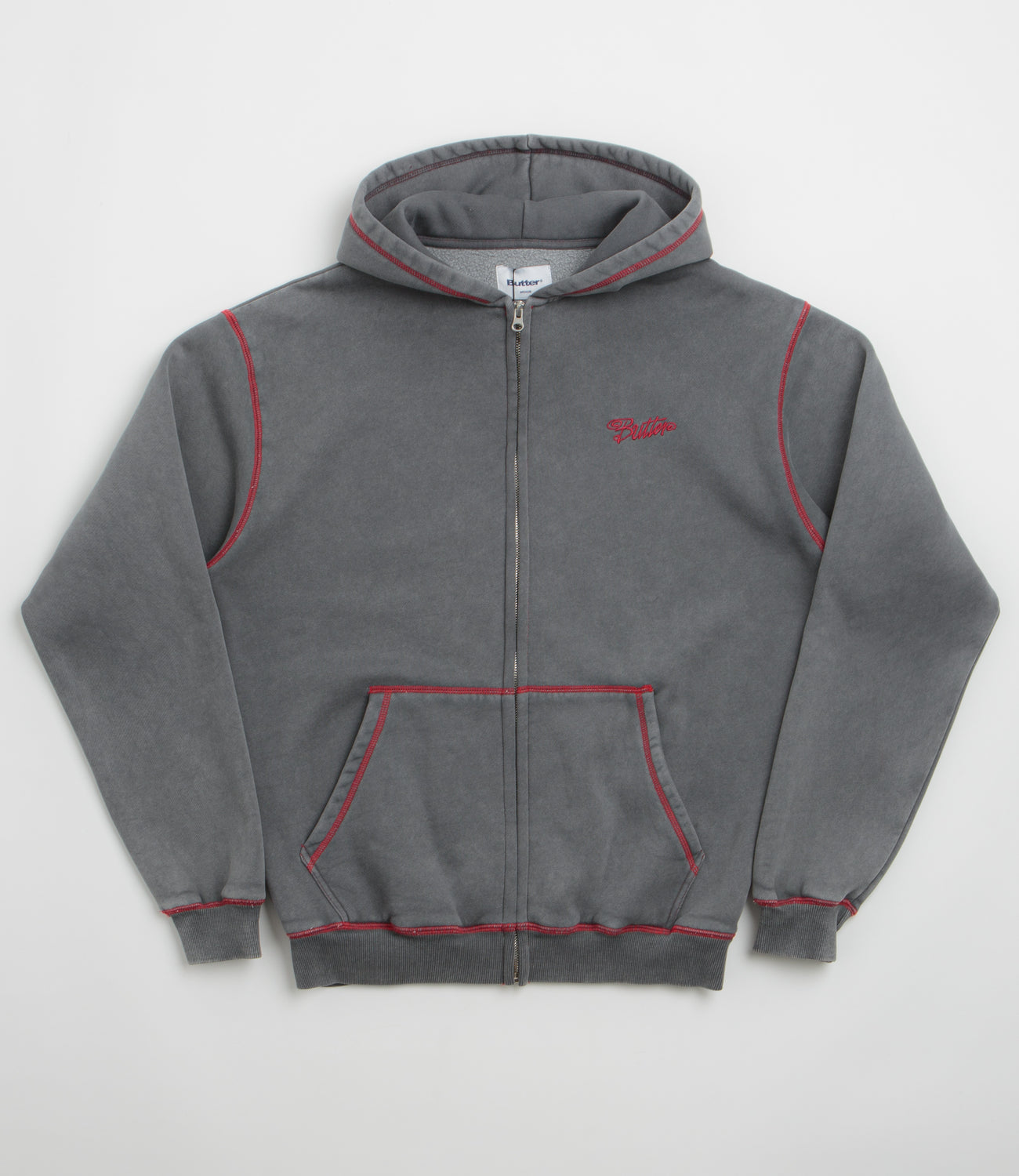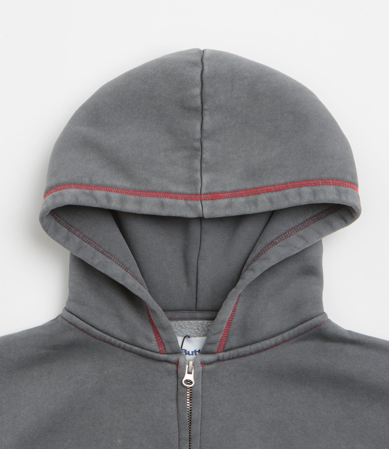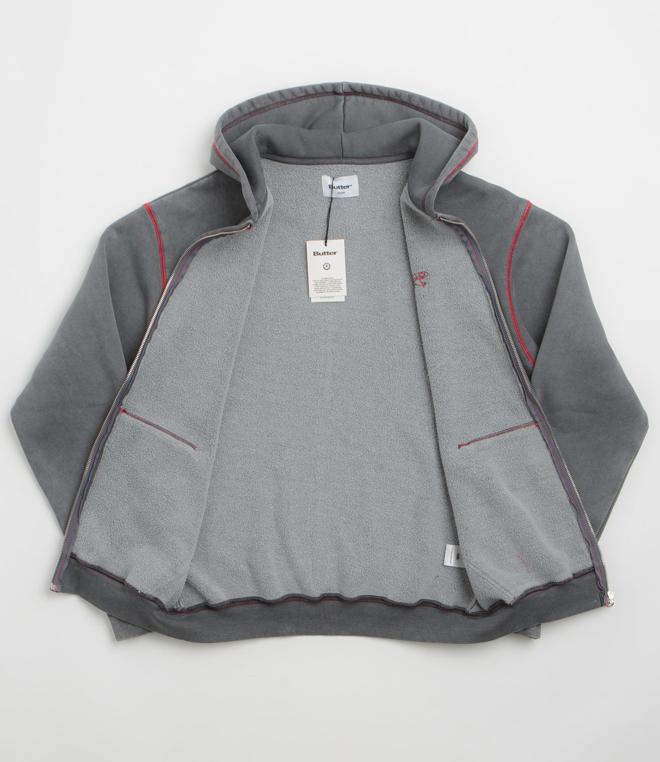 Butter Goods Jive Zip-Thru Hoodie in Washed Black. Regular fitting and made from a cotton-polyester fleece blend, this mineral washed Butter Goods hoodie is designed with a full length zipper fastening and contrast stitching. Finished with two front pockets, ribbed cuffs and embroidered branding.
