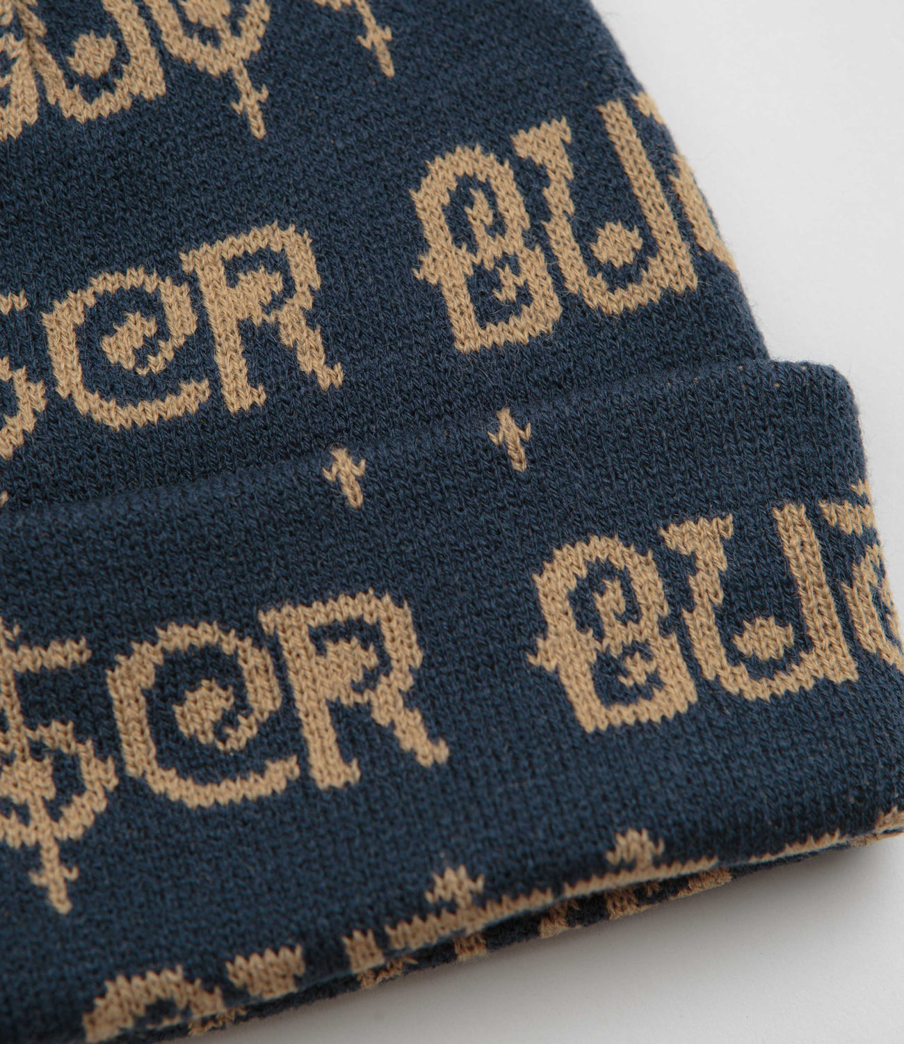 Butter Goods Love Dance Beanie in Dark Blue. Detailed with an all-over jacquard knit pattern, this Butter Goods beanie is made from 100% acrylic. Single sized and finished in dark blue with a fold-over cuff.