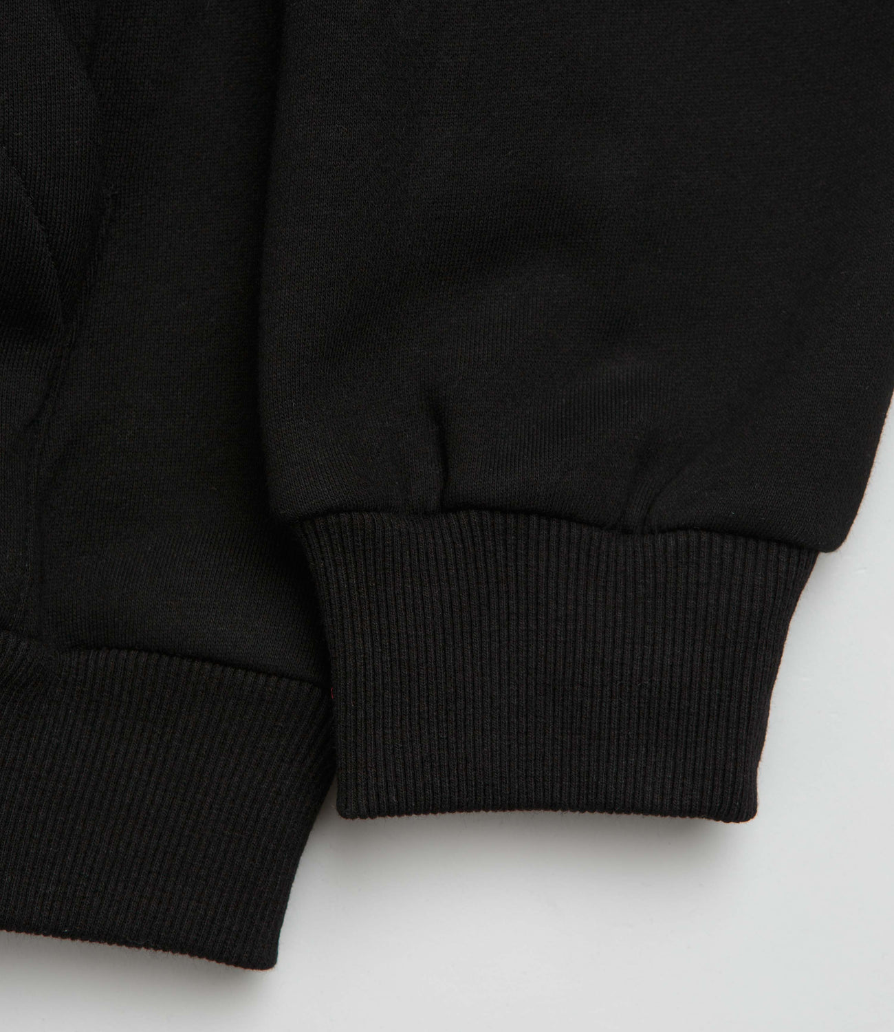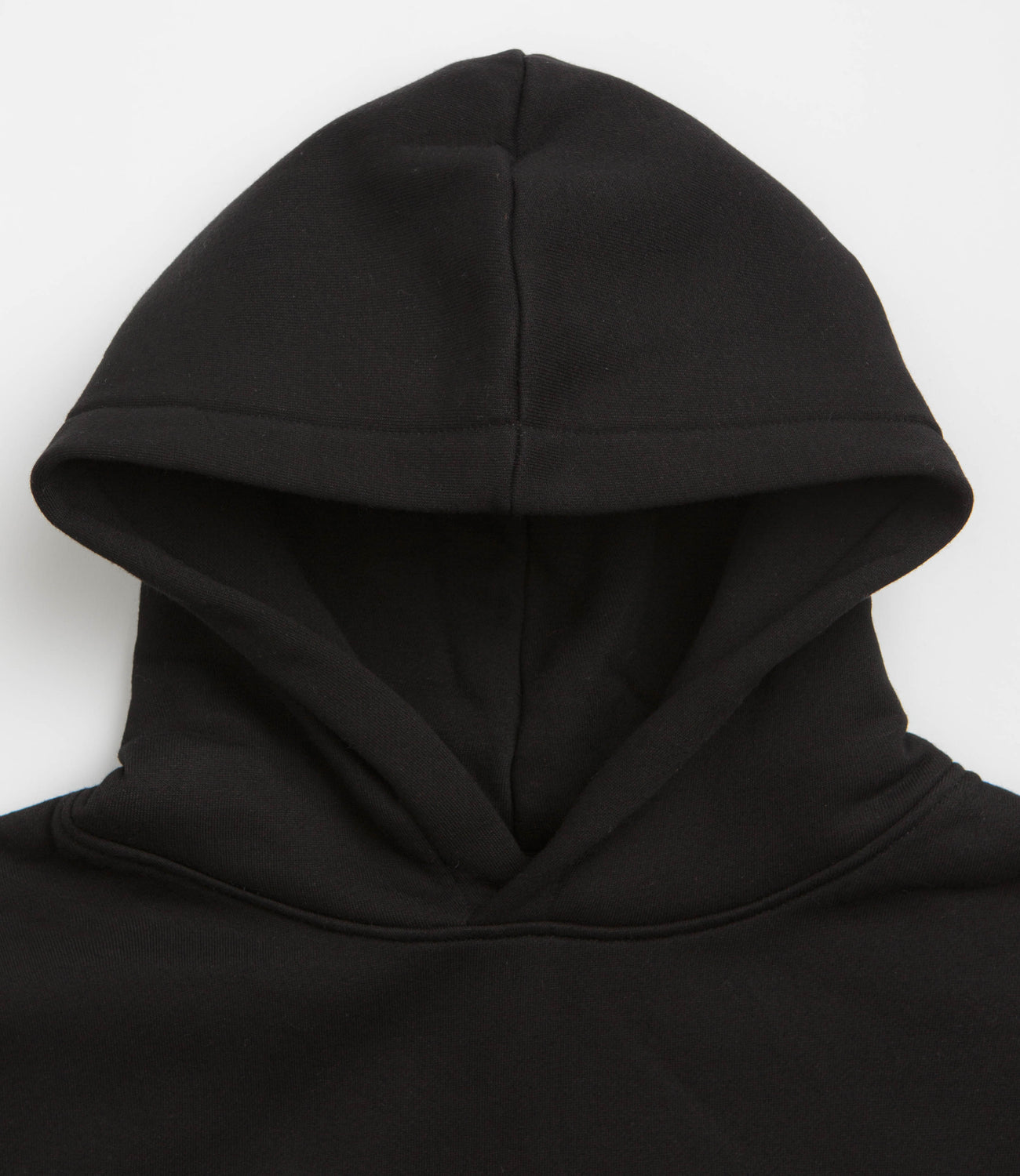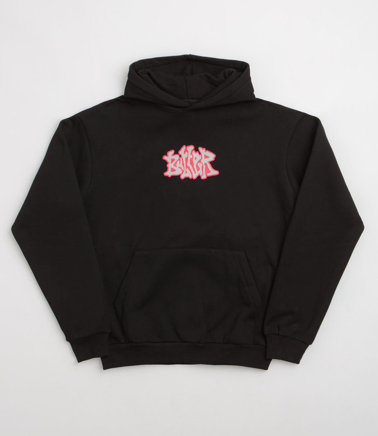 Butter Goods Melt Hoodie in Black. Regular fitting, this heavyweight Butter Goods hoodie is made from a cotton-polyester blend. Featuring a split panel hood and a kangaroo front pocket, this black Butter Goods hoodie is finished with ribbed cuffs, a woven elastic hem and a screen printed chest graphic.